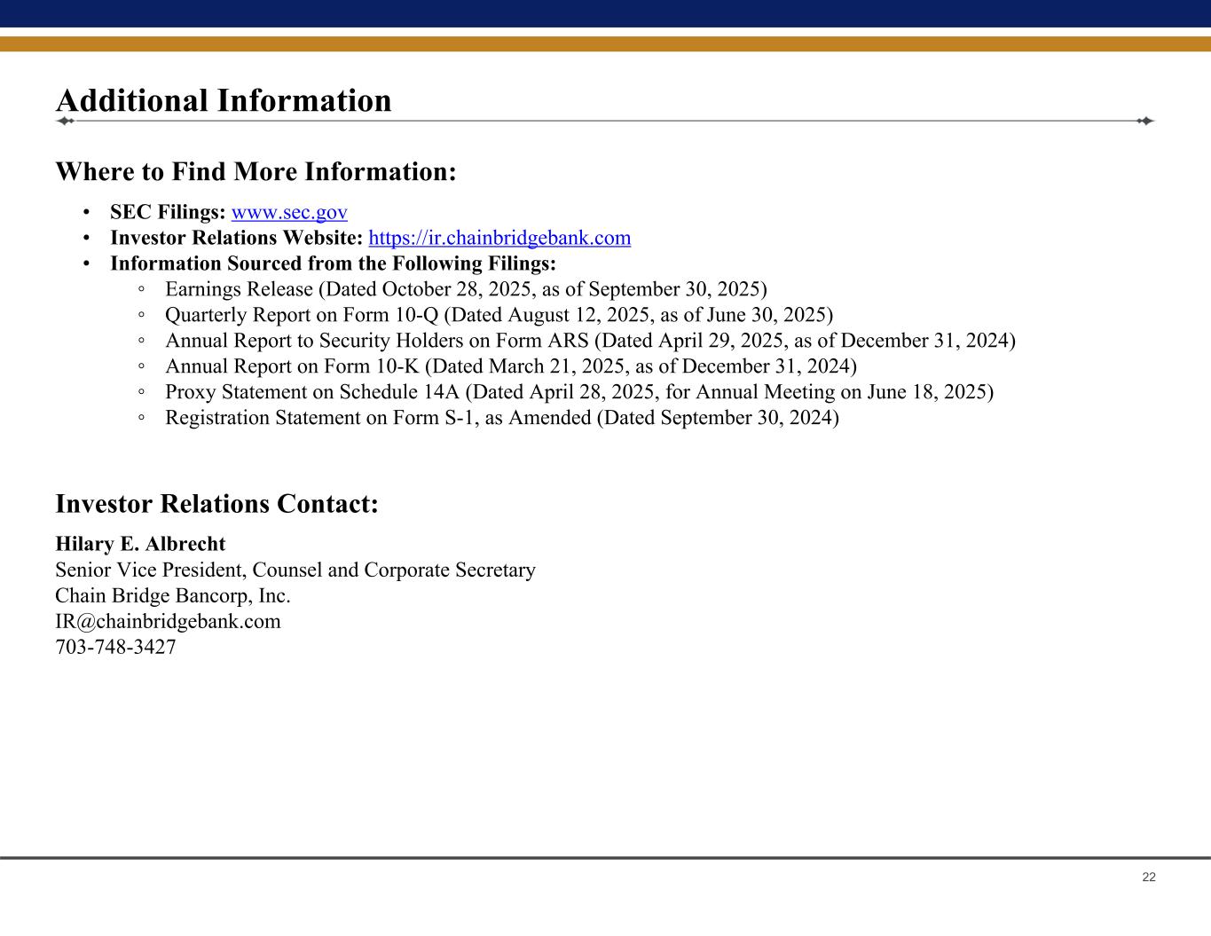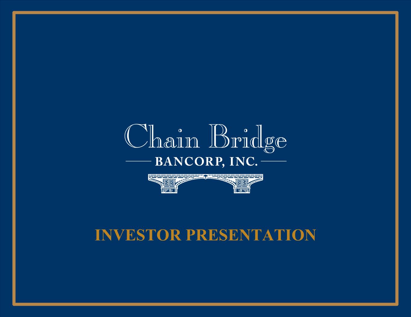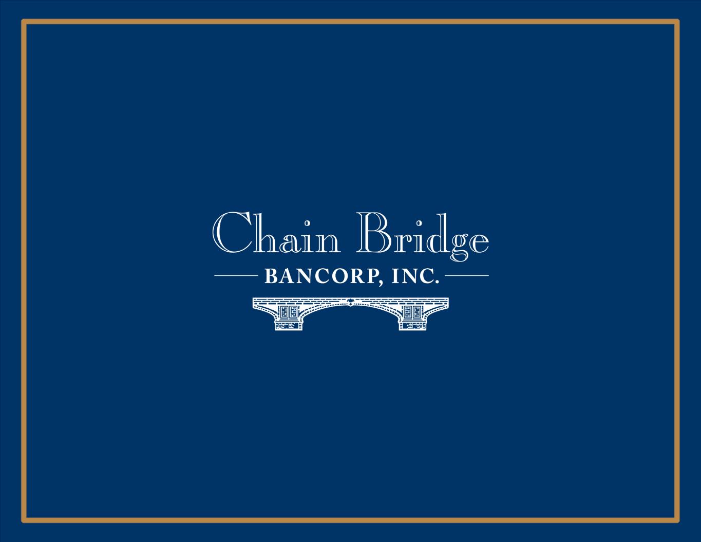 22 68 72 74 15 49 109 42 80 130 232 159 44 148 109 51 233 234 235 100 100 100 Binding Zone Printer Margins Where to Find More Information: • SEC Filings: www.sec.gov • Investor Relations Website: https://ir.chainbridgebank.com • Information Sourced from the Following Filings: ◦ Earnings Release (Dated October 28, 2025, as of September 30, 2025) ◦ Quarterly Report on Form 10-Q (Dated August 12, 2025, as of June 30, 2025) ◦ Annual Report to Security Holders on Form ARS (Dated April 29, 2025, as of December 31, 2024) ◦ Annual Report on Form 10-K (Dated March 21, 2025, as of December 31, 2024) ◦ Proxy Statement on Schedule 14A (Dated April 28, 2025, for Annual Meeting on June 18, 2025) ◦ Registration Statement on Form S-1, as Amended (Dated September 30, 2024) Investor Relations Contact: Hilary E. Albrecht Senior Vice President, Counsel and Corporate Secretary Chain Bridge Bancorp, Inc. IR@chainbridgebank.com 703-748-3427 Additional Information
