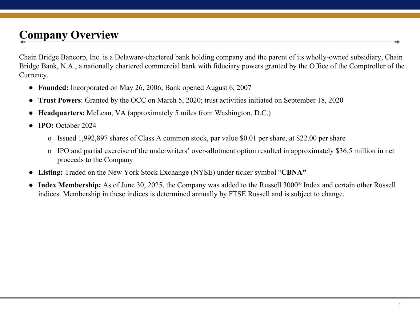 4 68 72 74 15 49 109 42 80 130 232 159 44 148 109 51 233 234 235 100 100 100 Binding Zone Printer Margins Chain Bridge Bancorp, Inc. is a Delaware-chartered bank holding company and the parent of its wholly-owned subsidiary, Chain Bridge Bank, N.A., a nationally chartered commercial bank with fiduciary powers granted by the Office of the Comptroller of the Currency. ● Founded: Incorporated on May 26, 2006; Bank opened August 6, 2007 ● Trust Powers: Granted by the OCC on March 5, 2020; trust activities initiated on September 18, 2020 ● Headquarters: McLean, VA (approximately 5 miles from Washington, D.C.) ● IPO: October 2024 o Issued 1,992,897 shares of Class A common stock, par value $0.01 per share, at $22.00 per share o IPO and partial exercise of the underwriters’ over-allotment option resulted in approximately $36.5 million in net proceeds to the Company ● Listing: Traded on the New York Stock Exchange (NYSE) under ticker symbol “CBNA” ● Index Membership: As of June 30, 2025, the Company was added to the Russell 3000® Index and certain other Russell indices. Membership in these indices is determined annually by FTSE Russell and is subject to change. Company Overview