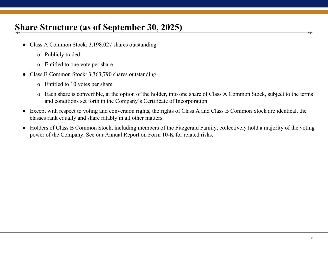 5 68 72 74 15 49 109 42 80 130 232 159 44 148 109 51 233 234 235 100 100 100 Binding Zone Printer Margins ● Class A Common Stock: 3,198,027 shares outstanding o Publicly traded o Entitled to one vote per share ● Class B Common Stock: 3,363,790 shares outstanding o Entitled to 10 votes per share o Each share is convertible, at the option of the holder, into one share of Class A Common Stock, subject to the terms and conditions set forth in the Company’s Certificate of Incorporation. ● Except with respect to voting and conversion rights, the rights of Class A and Class B Common Stock are identical, the classes rank equally and share ratably in all other matters. ● Holders of Class B Common Stock, including members of the Fitzgerald Family, collectively hold a majority of the voting power of the Company. See our Annual Report on Form 10-K for related risks. Share Structure (as of September 30, 2025)