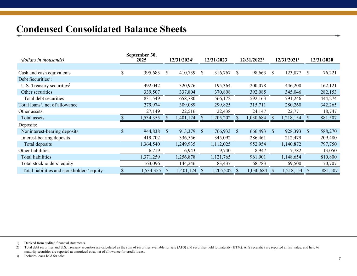7 68 72 74 15 49 109 42 80 130 232 159 44 148 109 51 233 234 235 100 100 100 Binding Zone Printer Margins Condensed Consolidated Balance Sheets (dollars in thousands) September 30, 2025 12/31/20241 12/31/20231 12/31/20221 12/31/20211 12/31/20201 Cash and cash equivalents $ 395,683 $ 410,739 $ 316,767 $ 98,663 $ 123,877 $ 76,221 Debt Securities2: U.S. Treasury securities2 492,042 320,976 195,364 200,078 446,200 162,121 Other securities 339,507 337,804 370,808 392,085 345,046 282,153 Total debt securities 831,549 658,780 566,172 592,163 791,246 444,274 Total loans3, net of allowance 279,974 309,089 299,825 315,711 280,260 342,265 Other assets 27,149 22,516 22,438 24,147 22,771 18,747 Total assets $ 1,534,355 $ 1,401,124 $ 1,205,202 $ 1,030,684 $ 1,218,154 $ 881,507 Deposits: Noninterest-bearing deposits $ 944,838 $ 913,379 $ 766,933 $ 666,493 $ 928,393 $ 588,270 Interest-bearing deposits 419,702 336,556 345,092 286,461 212,479 209,480 Total deposits 1,364,540 1,249,935 1,112,025 952,954 1,140,872 797,750 Other liabilities 6,719 6,943 9,740 8,947 7,782 13,050 Total liabilities 1,371,259 1,256,878 1,121,765 961,901 1,148,654 810,800 Total stockholders’ equity 163,096 144,246 83,437 68,783 69,500 70,707 Total liabilities and stockholders’ equity $ 1,534,355 $ 1,401,124 $ 1,205,202 $ 1,030,684 $ 1,218,154 $ 881,507 1) Derived from audited financial statements. 2) Total debt securities and U.S. Treasury securities are calculated as the sum of securities available for sale (AFS) and securities held to maturity (HTM). AFS securities are reported at fair value, and held to maturity securities are reported at amortized cost, net of allowance for credit losses. 3) Includes loans held for sale.