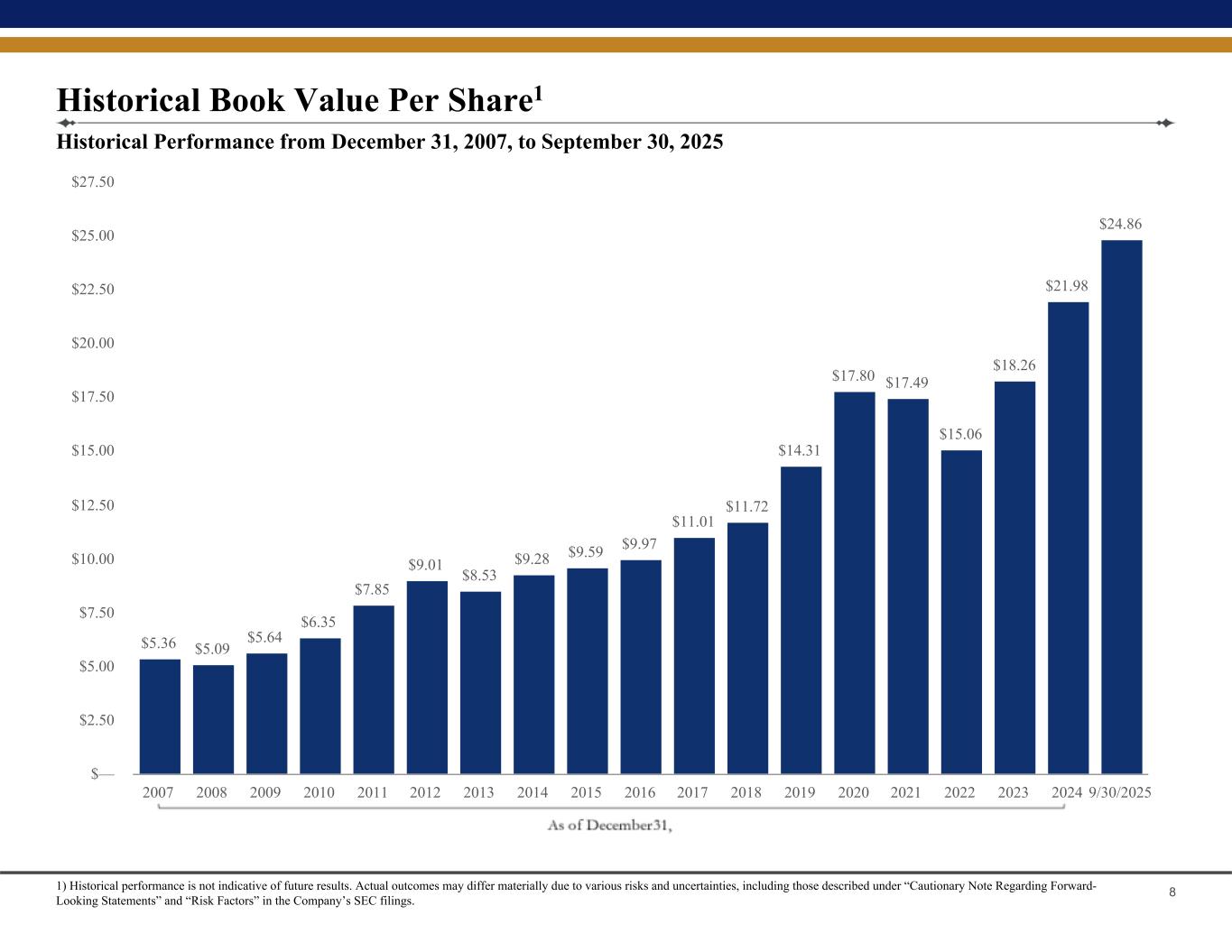 8 68 72 74 15 49 109 42 80 130 232 159 44 148 109 51 233 234 235 100 100 100 Binding Zone Printer Margins 1) Historical performance is not indicative of future results. Actual outcomes may differ materially due to various risks and uncertainties, including those described under “Cautionary Note Regarding Forward- Looking Statements” and “Risk Factors” in the Company’s SEC filings. Historical Performance from December 31, 2007, to September 30, 2025 Historical Book Value Per Share1 $5.36 $5.09 $5.64 $6.35 $7.85 $9.01 $8.53 $9.28 $9.59 $9.97 $11.01 $11.72 $14.31 $17.80 $17.49 $15.06 $18.26 $21.98 $24.86 2007 2008 2009 2010 2011 2012 2013 2014 2015 2016 2017 2018 2019 2020 2021 2022 2023 2024 9/30/2025 $— $2.50 $5.00 $7.50 $10.00 $12.50 $15.00 $17.50 $20.00 $22.50 $25.00 $27.50