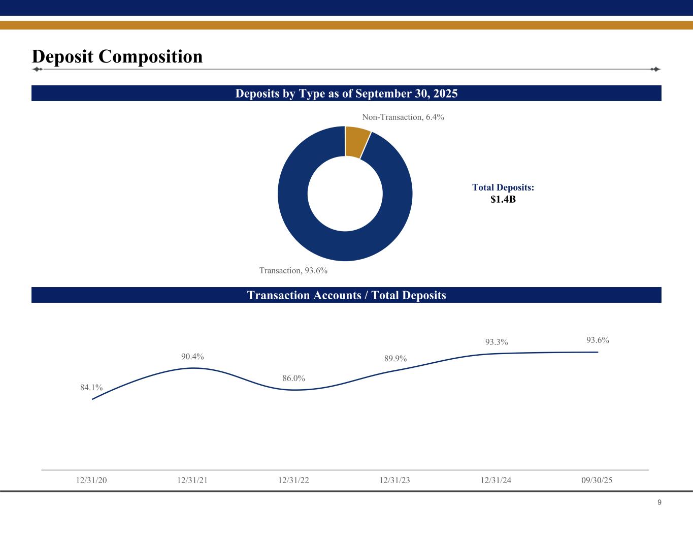 9 68 72 74 15 49 109 42 80 130 232 159 44 148 109 51 233 234 235 100 100 100 Binding Zone Printer Margins Transaction Accounts / Total Deposits Deposits by Type as of September 30, 2025 Deposit Composition Total Deposits: $1.4B 84.1% 90.4% 86.0% 89.9% 93.3% 93.6% 12/31/20 12/31/21 12/31/22 12/31/23 12/31/24 09/30/25 Non-Transaction, 6.4% Transaction, 93.6%