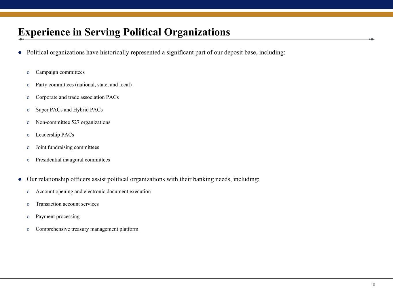 10 68 72 74 15 49 109 42 80 130 232 159 44 148 109 51 233 234 235 100 100 100 Binding Zone Printer Margins Experience in Serving Political Organizations ● Political organizations have historically represented a significant part of our deposit base, including: o Campaign committees o Party committees (national, state, and local) o Corporate and trade association PACs o Super PACs and Hybrid PACs o Non-committee 527 organizations o Leadership PACs o Joint fundraising committees o Presidential inaugural committees ● Our relationship officers assist political organizations with their banking needs, including: o Account opening and electronic document execution o Transaction account services o Payment processing o Comprehensive treasury management platform