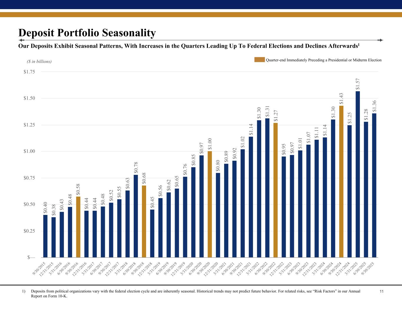 11 68 72 74 15 49 109 42 80 130 232 159 44 148 109 51 233 234 235 100 100 100 Binding Zone Printer Margins 1) Deposits from political organizations vary with the federal election cycle and are inherently seasonal. Historical trends may not predict future behavior. For related risks, see “Risk Factors” in our Annual Report on Form 10-K. Our Deposits Exhibit Seasonal Patterns, With Increases in the Quarters Leading Up To Federal Elections and Declines Afterwards1 Deposit Portfolio Seasonality ($ in billions) Quarter-end Immediately Preceding a Presidential or Midterm Election $0 .4 0 $0 .3 8 $0 .4 3 $0 .4 8 $0 .5 8 $0 .4 4 $0 .4 4 $0 .4 8 $0 .5 2 $0 .5 5 $0 .6 3 $0 .7 8 $0 .6 8 $0 .4 5 $0 .5 6 $0 .6 2 $0 .6 5 $0 .7 6 $0 .8 5 $0 .9 7 $1 .0 0 $0 .8 0 $0 .8 9 $0 .9 2 $1 .0 2 $1 .1 4 $1 .3 0 $1 .3 1 $1 .2 7 $0 .9 5 $0 .9 7 $1 .0 1 $1 .0 7 $1 .1 1 $1 .1 4 $1 .3 0 $1 .4 3 $1 .2 5 $1 .5 7 $1 .2 8 $1 .3 6 9/3 0/2 01 5 12 /31 /20 15 3/3 1/2 01 6 6/3 0/2 01 6 9/3 0/2 01 6 12 /31 /20 16 3/3 1/2 01 7 6/3 0/2 01 7 9/3 0/2 01 7 12 /31 /20 17 3/3 1/2 01 8 6/3 0/2 01 8 9/3 0/2 01 8 12 /31 /20 18 3/3 1/2 01 9 6/3 0/2 01 9 9/3 0/2 01 9 12 /31 /20 19 3/3 1/2 02 0 6/3 0/2 02 0 9/3 0/2 02 0 12 /31 /20 20 3/3 1/2 02 1 6/3 0/2 02 1 9/3 0/2 02 1 12 /31 /20 21 3/3 1/2 02 2 6/3 0/2 02 2 9/3 0/2 02 2 12 /31 /20 22 3/3 1/2 02 3 6/3 0/2 02 3 9/3 0/2 02 3 12 /31 /20 23 3/3 1/2 02 4 6/3 0/2 02 4 9/3 0/2 02 4 12 /31 /20 24 3/3 1/2 02 5 6/3 0/2 02 5 9/3 0/2 02 5 $— $0.25 $0.50 $0.75 $1.00 $1.25 $1.50 $1.75