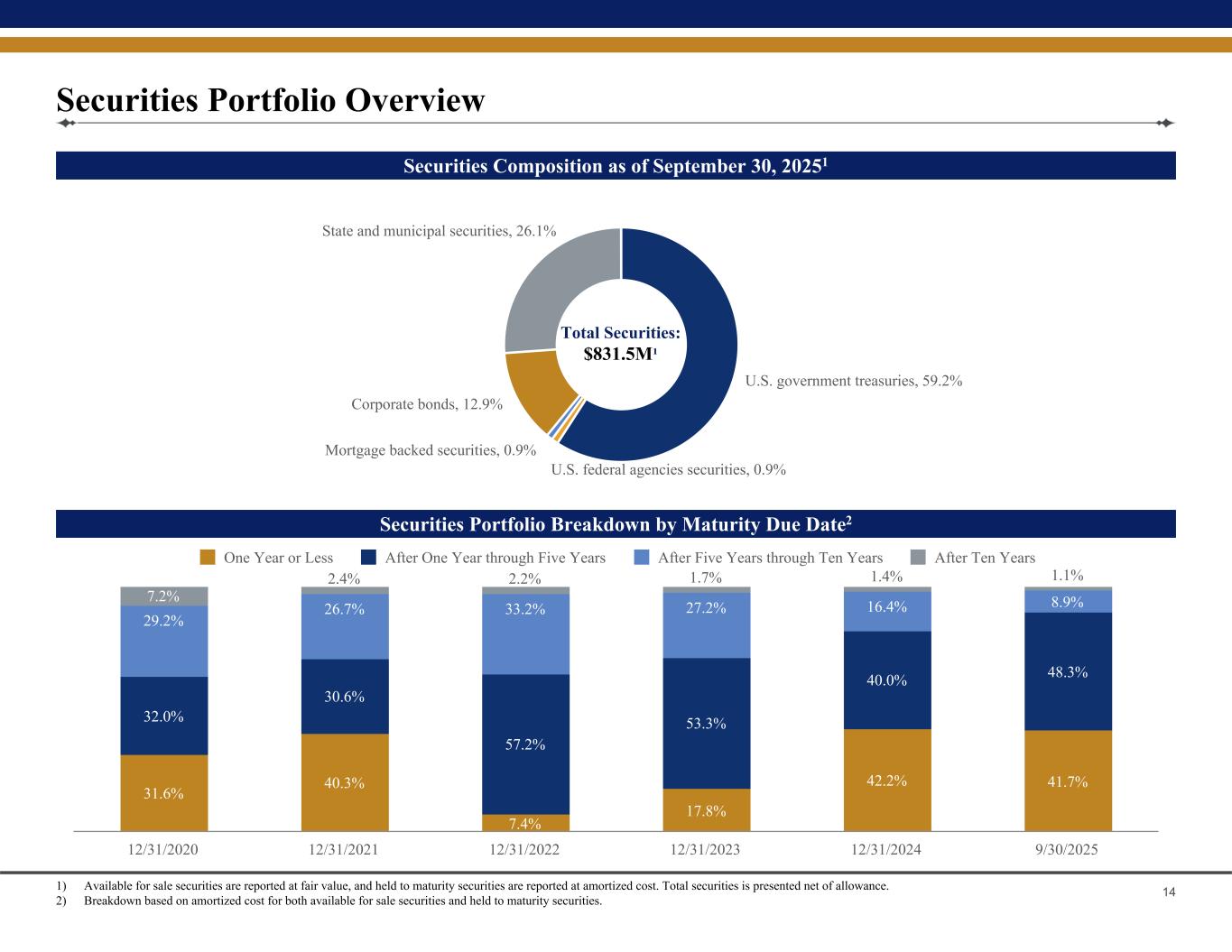 13 68 72 74 15 49 109 42 80 130 232 159 44 148 109 51 233 234 235 100 100 100 Binding Zone Printer Margins 1) Includes loans held for sale. Asset Distribution Gross Loans1 / Deposits Balance Sheet Allocation 43.4% 24.9% 33.6% 27.4% 25.1% 20.8% 12/31/2020 12/31/2021 12/31/2022 12/31/2023 12/31/2024 9/30/2025 8.6% 10.2% 9.6% 26.3% 29.3% 25.8% 50.5% 65.0% 57.5% 47.0% 47.0% 54.2% 39.3% 23.3% 31.1% 25.2% 22.4% 18.5% 1.6% 1.5% 1.8% 1.5% 1.3% 1.5% Cash & Cash Equivalents Investment Grade Securities Gross Loans Other Assets 12/31/2020 12/31/2021 12/31/2022 12/31/2023 12/31/2024 9/30/2025 1