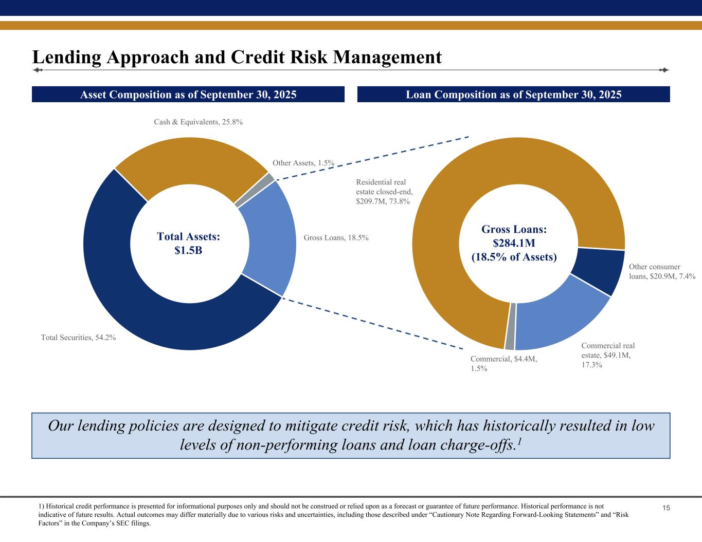 15 68 72 74 15 49 109 42 80 130 232 159 44 148 109 51 233 234 235 100 100 100 Binding Zone Printer Margins Loan Composition as of September 30, 2025Asset Composition as of September 30, 2025 Lending Approach and Credit Risk Management Our lending policies are designed to mitigate credit risk, which has historically resulted in low levels of non-performing loans and loan charge-offs.1 Total Assets: $1.5B Gross Loans: $284.1M (18.5% of Assets) Total Securities, 54.2% Cash & Equivalents, 25.8% Other Assets, 1.5% Gross Loans, 18.5% Commercial real estate, $49.1M, 17.3% Commercial, $4.4M, 1.5% Residential real estate closed-end, $209.7M, 73.8% Other consumer loans, $20.9M, 7.4% 1) Historical credit performance is presented for informational purposes only and should not be construed or relied upon as a forecast or guarantee of future performance. Historical performance is not indicative of future results. Actual outcomes may differ materially due to various risks and uncertainties, including those described under “Cautionary Note Regarding Forward-Looking Statements” and “Risk Factors” in the Company’s SEC filings.