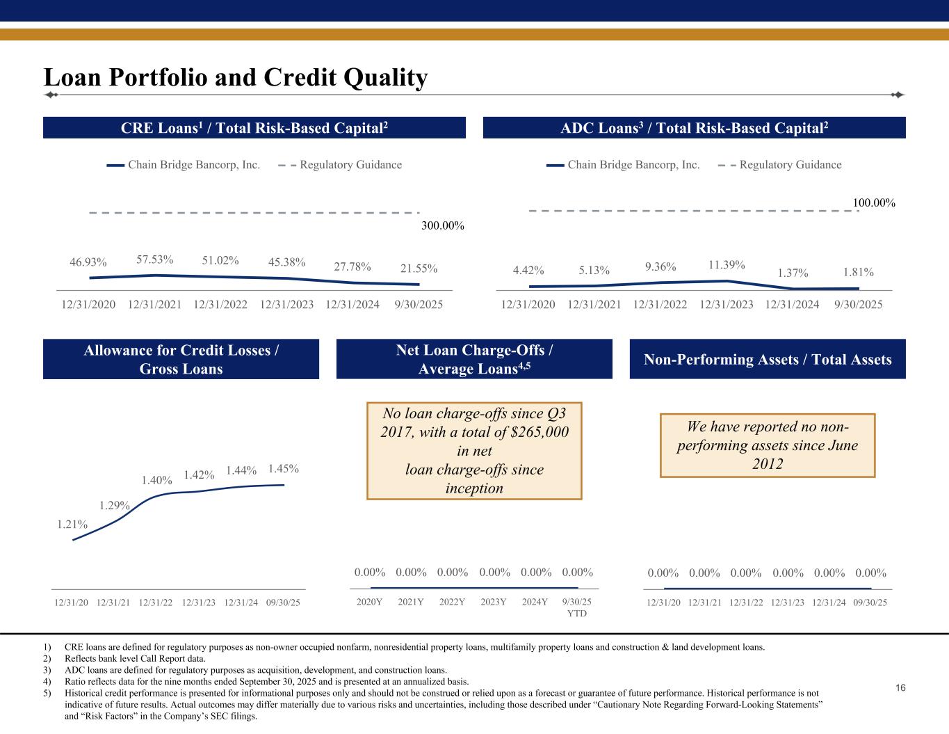 16 68 72 74 15 49 109 42 80 130 232 159 44 148 109 51 233 234 235 100 100 100 Binding Zone Printer Margins 1) CRE loans are defined for regulatory purposes as non-owner occupied nonfarm, nonresidential property loans, multifamily property loans and construction & land development loans. 2) Reflects bank level Call Report data. 3) ADC loans are defined for regulatory purposes as acquisition, development, and construction loans. 4) Ratio reflects data for the nine months ended September 30, 2025 and is presented at an annualized basis. 5) Historical credit performance is presented for informational purposes only and should not be construed or relied upon as a forecast or guarantee of future performance. Historical performance is not indicative of future results. Actual outcomes may differ materially due to various risks and uncertainties, including those described under “Cautionary Note Regarding Forward-Looking Statements” and “Risk Factors” in the Company’s SEC filings. Net Loan Charge-Offs / Average Loans4,5 Allowance for Credit Losses / Gross Loans ADC Loans3 / Total Risk-Based Capital2CRE Loans1 / Total Risk-Based Capital2 Loan Portfolio and Credit Quality Non-Performing Assets / Total Assets No loan charge-offs since Q3 2017, with a total of $265,000 in net loan charge-offs since inception We have reported no non- performing assets since June 2012 0.00% 0.00% 0.00% 0.00% 0.00% 0.00% 12/31/20 12/31/21 12/31/22 12/31/23 12/31/24 09/30/25 0.00% 0.00% 0.00% 0.00% 0.00% 0.00% 2020Y 2021Y 2022Y 2023Y 2024Y 9/30/25 YTD 1.21% 1.29% 1.40% 1.42% 1.44% 1.45% 12/31/20 12/31/21 12/31/22 12/31/23 12/31/24 09/30/25 46.93% 57.53% 51.02% 45.38% 27.78% 21.55% Chain Bridge Bancorp, Inc. Regulatory Guidance 12/31/2020 12/31/2021 12/31/2022 12/31/2023 12/31/2024 9/30/2025 300.00% 4.42% 5.13% 9.36% 11.39% 1.37% 1.81% Chain Bridge Bancorp, Inc. Regulatory Guidance 12/31/2020 12/31/2021 12/31/2022 12/31/2023 12/31/2024 9/30/2025 100.00%