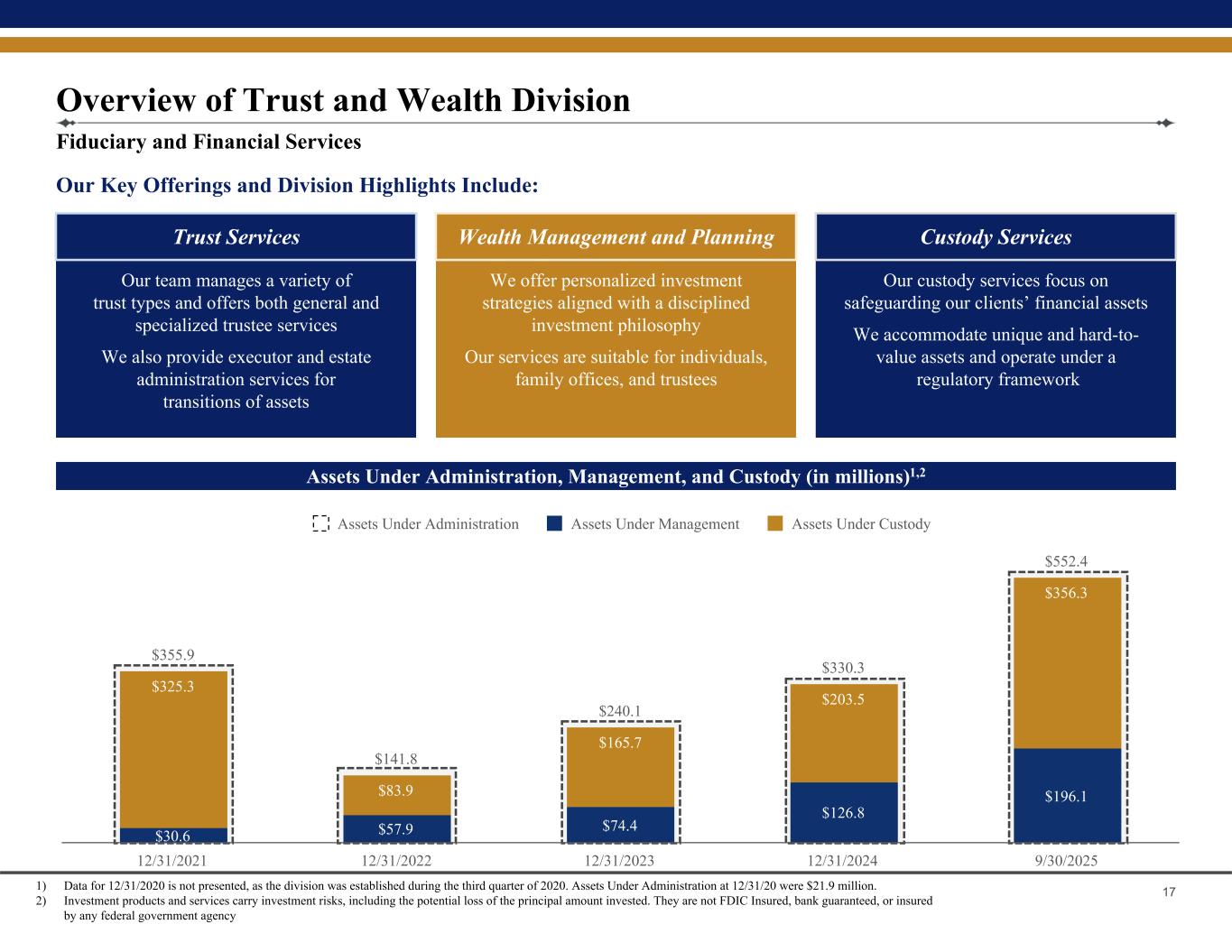 17 68 72 74 15 49 109 42 80 130 232 159 44 148 109 51 233 234 235 100 100 100 Binding Zone Printer Margins Our Key Offerings and Division Highlights Include: Fiduciary and Financial Services Overview of Trust and Wealth Division Our team manages a variety of trust types and offers both general and specialized trustee services We also provide executor and estate administration services for transitions of assets Trust Services We offer personalized investment strategies aligned with a disciplined investment philosophy Our services are suitable for individuals, family offices, and trustees Wealth Management and Planning Our custody services focus on safeguarding our clients’ financial assets We accommodate unique and hard-to- value assets and operate under a regulatory framework Custody Services Assets Under Administration, Management, and Custody (in millions)1,2 $355.9 $141.8 $240.1 $330.3 $552.4 $30.6 $57.9 $74.4 $126.8 $196.1 $325.3 $83.9 $165.7 $203.5 $356.3 Assets Under Administration Assets Under Management Assets Under Custody 12/31/2021 12/31/2022 12/31/2023 12/31/2024 9/30/2025 1) Data for 12/31/2020 is not presented, as the division was established during the third quarter of 2020. Assets Under Administration at 12/31/20 were $21.9 million. 2) Investment products and services carry investment risks, including the potential loss of the principal amount invested. They are not FDIC Insured, bank guaranteed, or insured by any federal government agency
