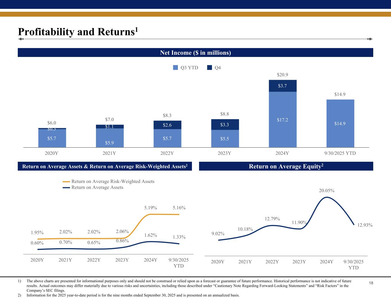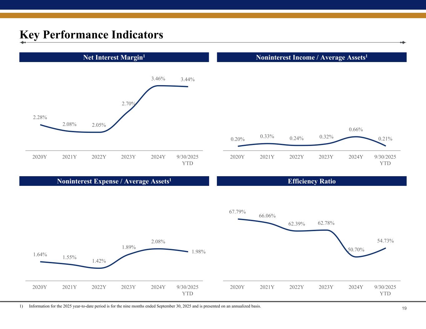 18 68 72 74 15 49 109 42 80 130 232 159 44 148 109 51 233 234 235 100 100 100 Binding Zone Printer Margins 1) The above charts are presented for informational purposes only and should not be construed or relied upon as a forecast or guarantee of future performance. Historical performance is not indicative of future results. Actual outcomes may differ materially due to various risks and uncertainties, including those described under “Cautionary Note Regarding Forward-Looking Statements” and “Risk Factors” in the Company’s SEC filings. 2) Information for the 2025 year-to-date period is for the nine months ended September 30, 2025 and is presented on an annualized basis. Return on Average Equity2Return on Average Assets & Return on Average Risk-Weighted Assets2 Profitability and Returns1 Net Income ($ in millions) 0.60% 0.70% 0.65% 0.86% 1.62% 1.33% 1.95% 2.02% 2.02% 2.06% 5.19% 5.16% Return on Average Risk-Weighted Assets Return on Average Assets 2020Y 2021Y 2022Y 2023Y 2024Y 9/30/2025 YTD 9.02% 10.18% 12.79% 11.90% 20.05% 12.93% 2020Y 2021Y 2022Y 2023Y 2024Y 9/30/2025 YTD $6.0 $7.0 $8.3 $8.8 $20.9 $14.9 $5.7 $5.9 $5.7 $5.5 $17.2 $14.9 $0.3 $1.1 $2.6 $3.3 $3.7 Q3 YTD Q4 2020Y 2021Y 2022Y 2023Y 2024Y 9/30/2025 YTD