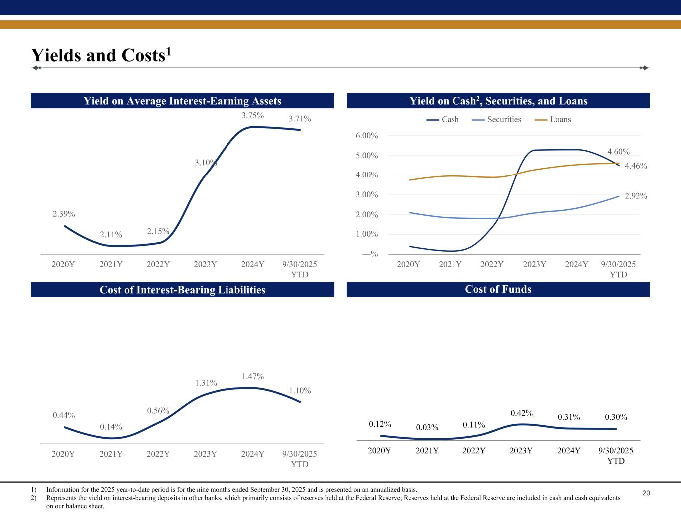 20 68 72 74 15 49 109 42 80 130 232 159 44 148 109 51 233 234 235 100 100 100 Binding Zone Printer Margins 1) Information for the 2025 year-to-date period is for the nine months ended September 30, 2025 and is presented on an annualized basis. 2) Represents the yield on interest-bearing deposits in other banks, which primarily consists of reserves held at the Federal Reserve; Reserves held at the Federal Reserve are included in cash and cash equivalents on our balance sheet. Yield on Cash2, Securities, and Loans Yields and Costs1 Cost of FundsCost of Interest-Bearing Liabilities 0.12% 0.03% 0.11% 0.42% 0.31% 0.30% 2020Y 2021Y 2022Y 2023Y 2024Y 9/30/2025 YTD Yield on Average Interest-Earning Assets 4.46% 2.92% 4.60% Cash Securities Loans 2020Y 2021Y 2022Y 2023Y 2024Y 9/30/2025 YTD —% 1.00% 2.00% 3.00% 4.00% 5.00% 6.00% 2.39% 2.11% 2.15% 3.10% 3.75% 3.71% 2020Y 2021Y 2022Y 2023Y 2024Y 9/30/2025 YTD 0.44% 0.14% 0.56% 1.31% 1.47% 1.10% 2020Y 2021Y 2022Y 2023Y 2024Y 9/30/2025 YTD