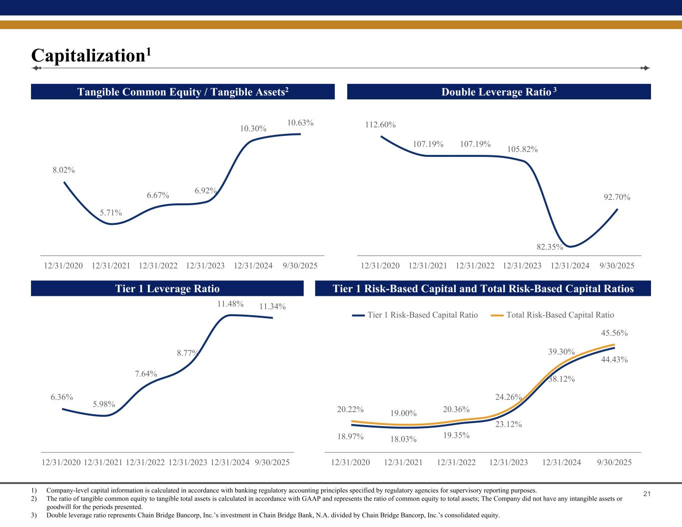 21 68 72 74 15 49 109 42 80 130 232 159 44 148 109 51 233 234 235 100 100 100 Binding Zone Printer Margins 1) Company-level capital information is calculated in accordance with banking regulatory accounting principles specified by regulatory agencies for supervisory reporting purposes. 2) The ratio of tangible common equity to tangible total assets is calculated in accordance with GAAP and represents the ratio of common equity to total assets; The Company did not have any intangible assets or goodwill for the periods presented. 3) Double leverage ratio represents Chain Bridge Bancorp, Inc.’s investment in Chain Bridge Bank, N.A. divided by Chain Bridge Bancorp, Inc.’s consolidated equity. Tier 1 Risk-Based Capital and Total Risk-Based Capital RatiosTier 1 Leverage Ratio Tangible Common Equity / Tangible Assets2 Capitalization1 Double Leverage Ratio 3 112.60% 107.19% 107.19% 105.82% 82.35% 92.70% 12/31/2020 12/31/2021 12/31/2022 12/31/2023 12/31/2024 9/30/2025 8.02% 5.71% 6.67% 6.92% 10.30% 10.63% 12/31/2020 12/31/2021 12/31/2022 12/31/2023 12/31/2024 9/30/2025 6.36% 5.98% 7.64% 8.77% 11.48% 11.34% 12/31/2020 12/31/2021 12/31/2022 12/31/2023 12/31/2024 9/30/2025 18.97% 18.03% 19.35% 23.12% 38.12% 44.43% 20.22% 19.00% 20.36% 24.26% 39.30% 45.56% Tier 1 Risk-Based Capital Ratio Total Risk-Based Capital Ratio 12/31/2020 12/31/2021 12/31/2022 12/31/2023 12/31/2024 9/30/2025