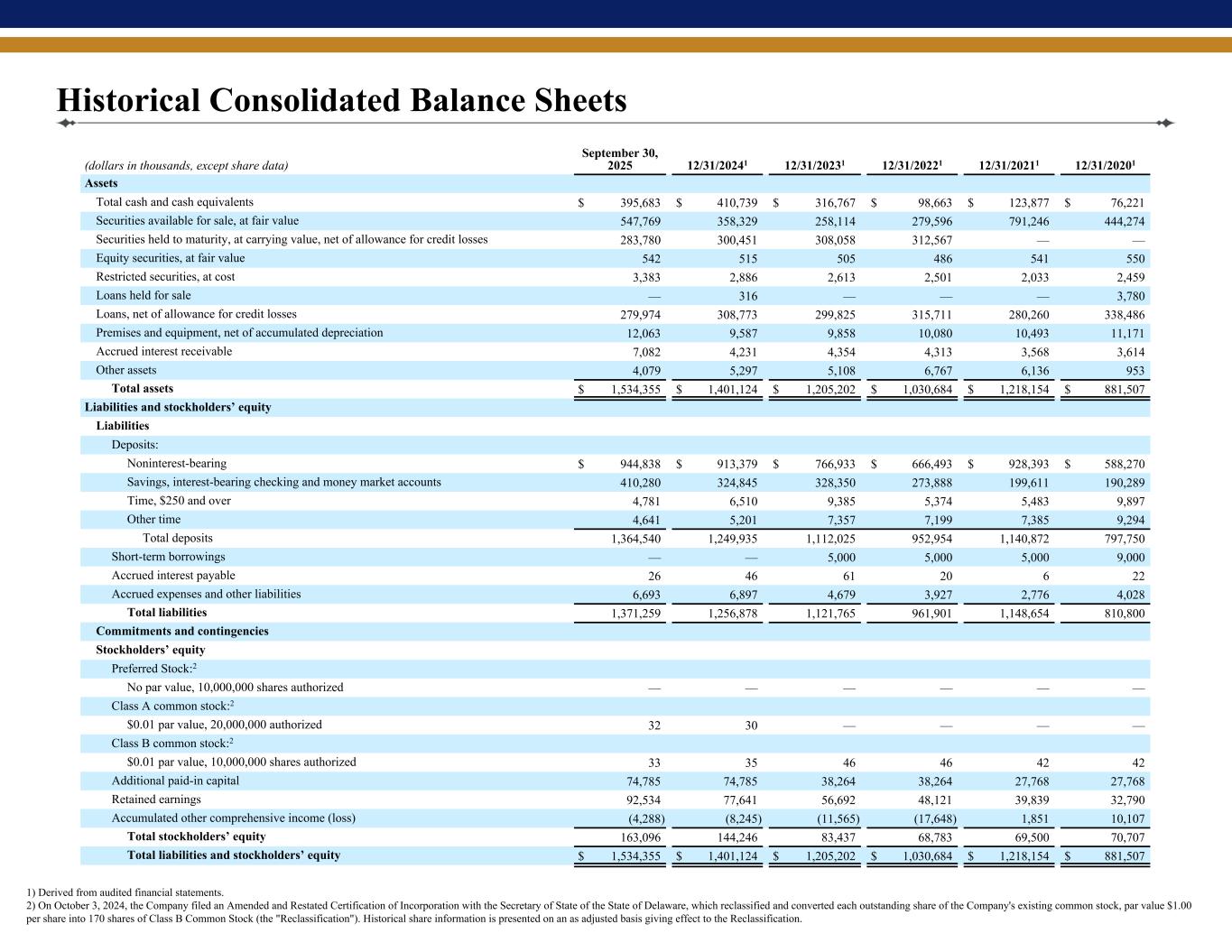 24 68 72 74 15 49 109 42 80 130 232 159 44 148 109 51 233 234 235 100 100 100 Binding Zone Printer Margins Historical Consolidated Balance Sheets (dollars in thousands, except share data) September 30, 2025 12/31/20241 12/31/20231 12/31/20221 12/31/20211 12/31/20201 Assets Total cash and cash equivalents $ 395,683 $ 410,739 $ 316,767 $ 98,663 $ 123,877 $ 76,221 Securities available for sale, at fair value 547,769 358,329 258,114 279,596 791,246 444,274 Securities held to maturity, at carrying value, net of allowance for credit losses 283,780 300,451 308,058 312,567 — — Equity securities, at fair value 542 515 505 486 541 550 Restricted securities, at cost 3,383 2,886 2,613 2,501 2,033 2,459 Loans held for sale — 316 — — — 3,780 Loans, net of allowance for credit losses 279,974 308,773 299,825 315,711 280,260 338,486 Premises and equipment, net of accumulated depreciation 12,063 9,587 9,858 10,080 10,493 11,171 Accrued interest receivable 7,082 4,231 4,354 4,313 3,568 3,614 Other assets 4,079 5,297 5,108 6,767 6,136 953 Total assets $ 1,534,355 $ 1,401,124 $ 1,205,202 $ 1,030,684 $ 1,218,154 $ 881,507 Liabilities and stockholders’ equity Liabilities Deposits: Noninterest-bearing $ 944,838 $ 913,379 $ 766,933 $ 666,493 $ 928,393 $ 588,270 Savings, interest-bearing checking and money market accounts 410,280 324,845 328,350 273,888 199,611 190,289 Time, $250 and over 4,781 6,510 9,385 5,374 5,483 9,897 Other time 4,641 5,201 7,357 7,199 7,385 9,294 Total deposits 1,364,540 1,249,935 1,112,025 952,954 1,140,872 797,750 Short-term borrowings — — 5,000 5,000 5,000 9,000 Accrued interest payable 26 46 61 20 6 22 Accrued expenses and other liabilities 6,693 6,897 4,679 3,927 2,776 4,028 Total liabilities 1,371,259 1,256,878 1,121,765 961,901 1,148,654 810,800 Commitments and contingencies Stockholders’ equity Preferred Stock:2 No par value, 10,000,000 shares authorized — — — — — — Class A common stock:2 $0.01 par value, 20,000,000 authorized 32 30 — — — — Class B common stock:2 $0.01 par value, 10,000,000 shares authorized 33 35 46 46 42 42 Additional paid-in capital 74,785 74,785 38,264 38,264 27,768 27,768 Retained earnings 92,534 77,641 56,692 48,121 39,839 32,790 Accumulated other comprehensive income (loss) (4,288) (8,245) (11,565) (17,648) 1,851 10,107 Total stockholders’ equity 163,096 144,246 83,437 68,783 69,500 70,707 Total liabilities and stockholders’ equity $ 1,534,355 $ 1,401,124 $ 1,205,202 $ 1,030,684 $ 1,218,154 $ 881,507 1) Derived from audited financial statements. 2) On October 3, 2024, the Company filed an Amended and Restated Certification of Incorporation with the Secretary of State of the State of Delaware, which reclassified and converted each outstanding share of the Company's existing common stock, par value $1.00 per share into 170 shares of Class B Common Stock (the "Reclassification"). Historical share information is presented on an as adjusted basis giving effect to the Reclassification.