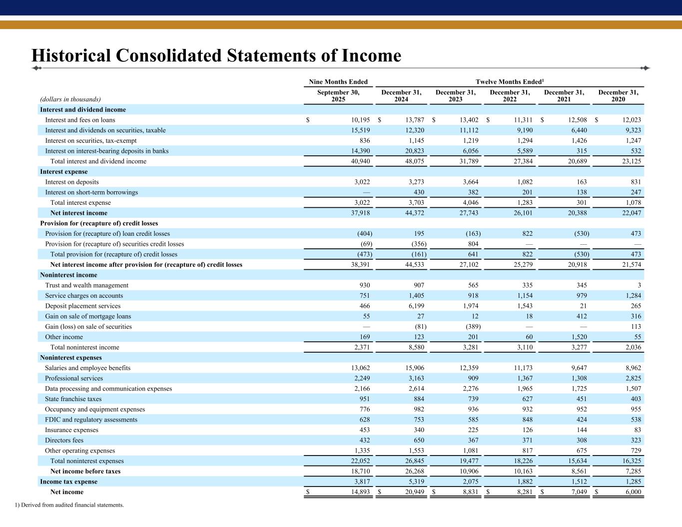 25 68 72 74 15 49 109 42 80 130 232 159 44 148 109 51 233 234 235 100 100 100 Binding Zone Printer Margins Historical Consolidated Statements of Income Nine Months Ended Twelve Months Ended1 (dollars in thousands) September 30, 2025 December 31, 2024 December 31, 2023 December 31, 2022 December 31, 2021 December 31, 2020 Interest and dividend income Interest and fees on loans $ 10,195 $ 13,787 $ 13,402 $ 11,311 $ 12,508 $ 12,023 Interest and dividends on securities, taxable 15,519 12,320 11,112 9,190 6,440 9,323 Interest on securities, tax-exempt 836 1,145 1,219 1,294 1,426 1,247 Interest on interest-bearing deposits in banks 14,390 20,823 6,056 5,589 315 532 Total interest and dividend income 40,940 48,075 31,789 27,384 20,689 23,125 Interest expense Interest on deposits 3,022 3,273 3,664 1,082 163 831 Interest on short-term borrowings — 430 382 201 138 247 Total interest expense 3,022 3,703 4,046 1,283 301 1,078 Net interest income 37,918 44,372 27,743 26,101 20,388 22,047 Provision for (recapture of) credit losses Provision for (recapture of) loan credit losses (404) 195 (163) 822 (530) 473 Provision for (recapture of) securities credit losses (69) (356) 804 — — — Total provision for (recapture of) credit losses (473) (161) 641 822 (530) 473 Net interest income after provision for (recapture of) credit losses 38,391 44,533 27,102 25,279 20,918 21,574 Noninterest income Trust and wealth management 930 907 565 335 345 3 Service charges on accounts 751 1,405 918 1,154 979 1,284 Deposit placement services 466 6,199 1,974 1,543 21 265 Gain on sale of mortgage loans 55 27 12 18 412 316 Gain (loss) on sale of securities — (81) (389) — — 113 Other income 169 123 201 60 1,520 55 Total noninterest income 2,371 8,580 3,281 3,110 3,277 2,036 Noninterest expenses Salaries and employee benefits 13,062 15,906 12,359 11,173 9,647 8,962 Professional services 2,249 3,163 909 1,367 1,308 2,825 Data processing and communication expenses 2,166 2,614 2,276 1,965 1,725 1,507 State franchise taxes 951 884 739 627 451 403 Occupancy and equipment expenses 776 982 936 932 952 955 FDIC and regulatory assessments 628 753 585 848 424 538 Insurance expenses 453 340 225 126 144 83 Directors fees 432 650 367 371 308 323 Other operating expenses 1,335 1,553 1,081 817 675 729 Total noninterest expenses 22,052 26,845 19,477 18,226 15,634 16,325 Net income before taxes 18,710 26,268 10,906 10,163 8,561 7,285 Income tax expense 3,817 5,319 2,075 1,882 1,512 1,285 Net income $ 14,893 $ 20,949 $ 8,831 $ 8,281 $ 7,049 $ 6,000 1) Derived from audited financial statements.