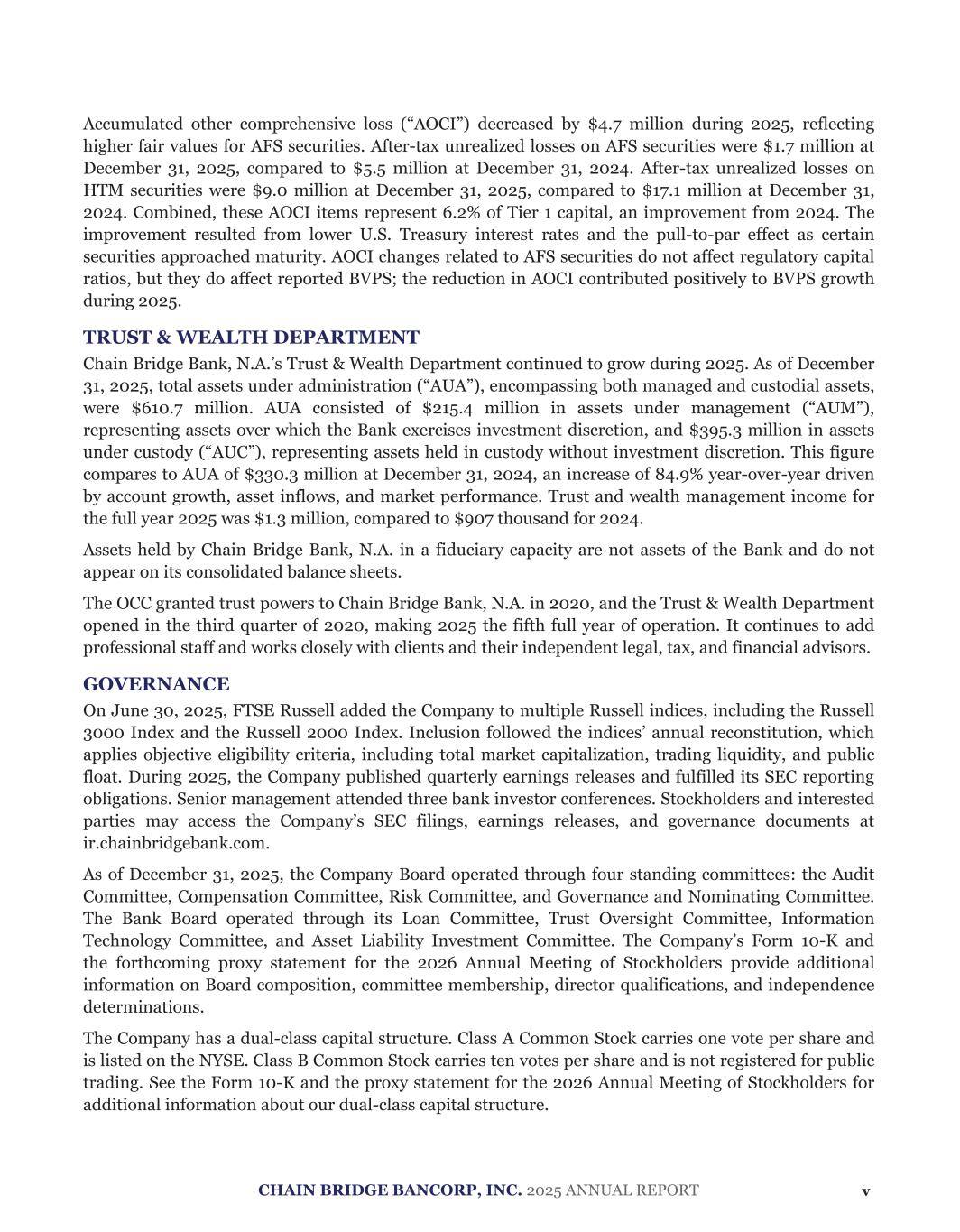 Chain Bridge Bancorp, Inc. and Subsidiary Consolidated Statements of Changes in Stockholders’ Equity For the Years Ended December 31, 2025 and 2024 (Dollars in thousands) Common Stock2 Class A Shares Outstanding Class B Shares Outstanding Total Amount Additional Paid-In Capital Retained Earnings Accumulated Other Comprehensive Loss Total Balance at December 31, 2023 $ — $ 46 $ 46 $ 38,264 $ 56,692 $ (11,565) $ 83,437 Issuance of common stock, net of offering 19 — 19 36,521 — — 36,540 Conversion of Class B to Class A Common Stock 11 (11) $ — — — — — Net income — — — — 20,949 — 20,949 Other comprehensive income — — — — — 3,320 3,320 Balance at December 31, 2024 $ 30 $ 35 $ 65 $ 74,785 $ 77,641 $ (8,245) $ 144,246 Balance at December 31, 2024 $ 30 $ 35 $ 65 $ 74,785 $ 77,641 $ (8,245) $ 144,246 Conversion of Class B to Class A Common Stock 3 (3) — — — — — Net income — — — — 20,237 — 20,237 Other comprehensive income — — — — — 4,736 4,736 Balance at December 31, 2025 $ 33 $ 32 $ 65 $ 74,785 $ 97,878 $ (3,509) $ 169,219 See Notes to Consolidated Financial Statements. 98 2 Share information for historical periods gives effect to the Reclassification. All shares and balances from previously held common stock are reflected in Class B Common Stock.
