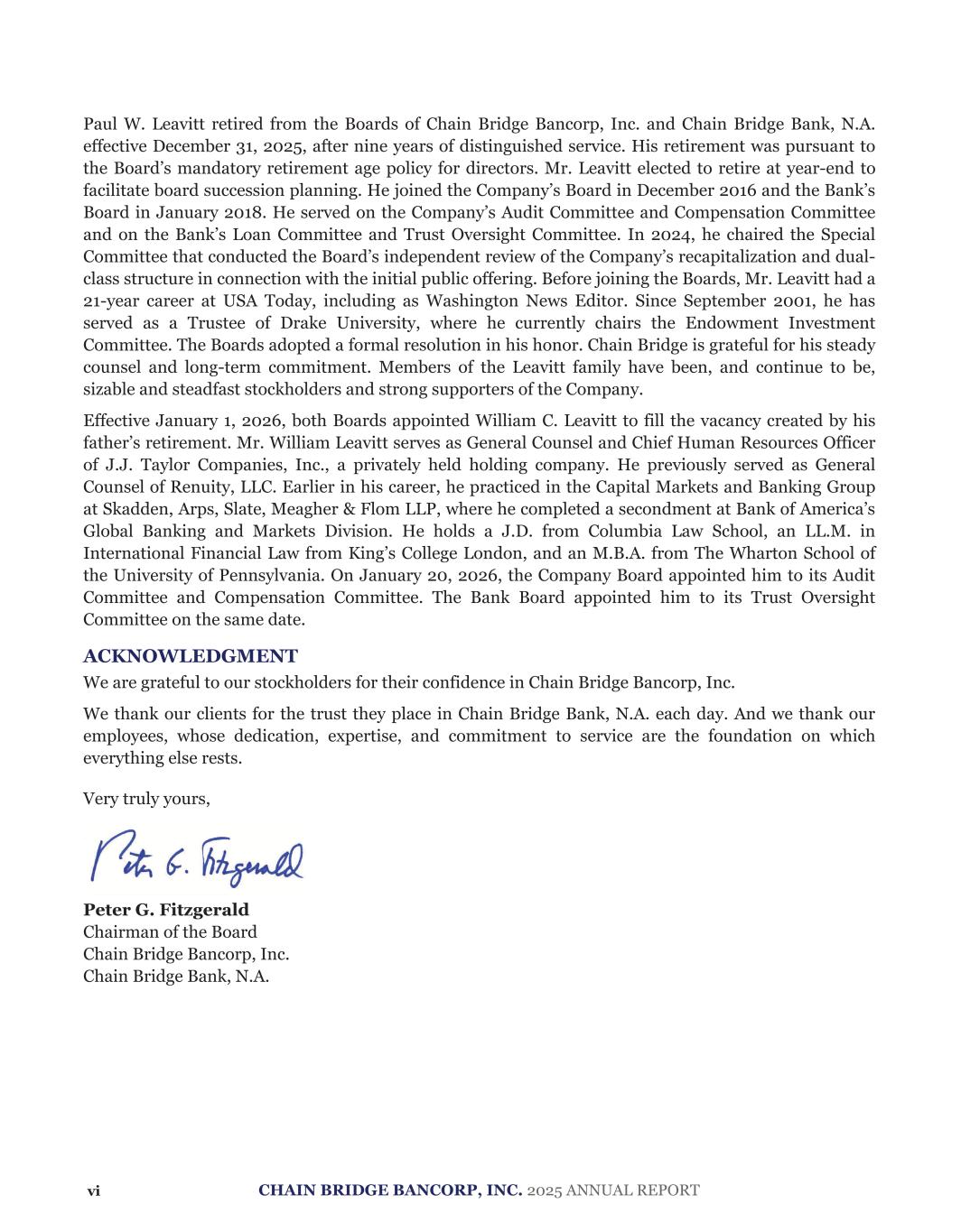 SIGNATURES Pursuant to the requirements of Section 13 or 15(d) of the Securities Exchange Act of 1934, the Registrant has duly caused this report to be signed on its behalf by the undersigned, thereunto duly authorized. CHAIN BRIDGE BANCORP, INC. Dated: March 20, 2026 By: /s/ John J. Brough Name: John J. Brough Title: Chief Executive Officer and Director (Principal Executive Officer) Pursuant to the requirements of the Securities Exchange Act of 1934, this report has been signed below by the following persons on behalf of the registrant and in the capacities and on the dates indicated. /s/ Peter G. Fitzgerald Chairman of the Board March 20, 2026 Peter G. Fitzgerald /s/ John J. Brough Chief Executive Officer & Director (Principal Executive Officer) March 20, 2026 John J. Brough /s/ Joanna R. Williamson Executive Vice President & Chief Financial Officer (Principal Financial Officer & Principal Accounting Officer) March 20, 2026 Joanna R. Williamson /s/ David M. Evinger President, Chief Credit Officer & Director March 20, 2026 David M. Evinger /s/ Leigh-Alexandra Basha Director March 20, 2026 Leigh-Alexandra Basha /s/ Michael J. Conover Director March 20, 2026 Michael J. Conover /s/ Andrew J. Fitzgerald Director March 20, 2026 Andrew J. Fitzgerald /s/ Joseph M. Fitzgerald Director March 20, 2026 Joseph M. Fitzgerald /s/ Thomas G. Fitzgerald Director March 20, 2026 Thomas G. Fitzgerald /s/ Michelle L. Korsmo Director March 20, 2026 Michelle L. Korsmo Name Position Date 139