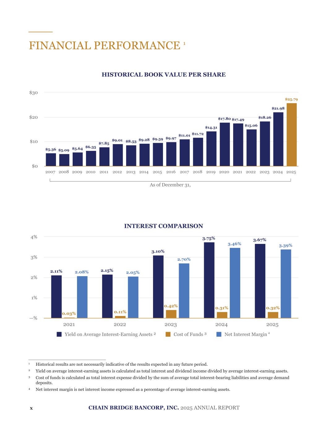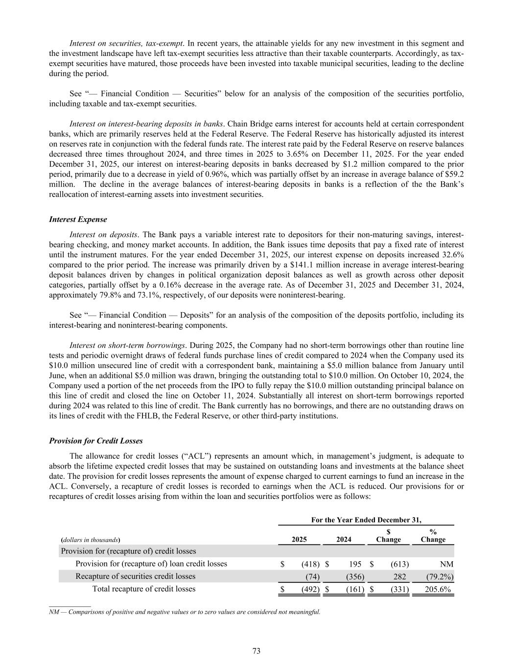 Interest on securities, tax-exempt. In recent years, the attainable yields for any new investment in this segment and the investment landscape have left tax-exempt securities less attractive than their taxable counterparts. Accordingly, as tax- exempt securities have matured, those proceeds have been invested into taxable municipal securities, leading to the decline during the period. See “— Financial Condition — Securities” below for an analysis of the composition of the securities portfolio, including taxable and tax-exempt securities. Interest on interest-bearing deposits in banks. Chain Bridge earns interest for accounts held at certain correspondent banks, which are primarily reserves held at the Federal Reserve. The Federal Reserve has historically adjusted its interest on reserves rate in conjunction with the federal funds rate. The interest rate paid by the Federal Reserve on reserve balances decreased three times throughout 2024, and three times in 2025 to 3.65% on December 11, 2025. For the year ended December 31, 2025, our interest on interest-bearing deposits in banks decreased by $1.2 million compared to the prior period, primarily due to a decrease in yield of 0.96%, which was partially offset by an increase in average balance of $59.2 million. The decline in the average balances of interest-bearing deposits in banks is a reflection of the the Bank’s reallocation of interest-earning assets into investment securities. Interest Expense Interest on deposits. The Bank pays a variable interest rate to depositors for their non-maturing savings, interest- bearing checking, and money market accounts. In addition, the Bank issues time deposits that pay a fixed rate of interest until the instrument matures. For the year ended December 31, 2025, our interest expense on deposits increased 32.6% compared to the prior period. The increase was primarily driven by a $141.1 million increase in average interest-bearing deposit balances driven by changes in political organization deposit balances as well as growth across other deposit categories, partially offset by a 0.16% decrease in the average rate. As of December 31, 2025 and December 31, 2024, approximately 79.8% and 73.1%, respectively, of our deposits were noninterest-bearing. See “— Financial Condition — Deposits” for an analysis of the composition of the deposits portfolio, including its interest-bearing and noninterest-bearing components. Interest on short-term borrowings. During 2025, the Company had no short-term borrowings other than routine line tests and periodic overnight draws of federal funds purchase lines of credit compared to 2024 when the Company used its $10.0 million unsecured line of credit with a correspondent bank, maintaining a $5.0 million balance from January until June, when an additional $5.0 million was drawn, bringing the outstanding total to $10.0 million. On October 10, 2024, the Company used a portion of the net proceeds from the IPO to fully repay the $10.0 million outstanding principal balance on this line of credit and closed the line on October 11, 2024. Substantially all interest on short-term borrowings reported during 2024 was related to this line of credit. The Bank currently has no borrowings, and there are no outstanding draws on its lines of credit with the FHLB, the Federal Reserve, or other third-party institutions. Provision for Credit Losses The allowance for credit losses (“ACL”) represents an amount which, in management’s judgment, is adequate to absorb the lifetime expected credit losses that may be sustained on outstanding loans and investments at the balance sheet date. The provision for credit losses represents the amount of expense charged to current earnings to fund an increase in the ACL. Conversely, a recapture of credit losses is recorded to earnings when the ACL is reduced. Our provisions for or recaptures of credit losses arising from within the loan and securities portfolios were as follows: For the Year Ended December 31, (dollars in thousands) 2025 2024 $ Change % Change Provision for (recapture of) credit losses Provision for (recapture of) loan credit losses $ (418) $ 195 $ (613) NM Recapture of securities credit losses (74) (356) 282 (79.2%) Total recapture of credit losses $ (492) $ (161) $ (331) 205.6% __________ NM — Comparisons of positive and negative values or to zero values are considered not meaningful. 73