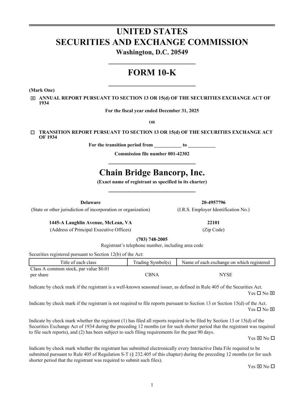 UNITED STATES SECURITIES AND EXCHANGE COMMISSION Washington, D.C. 20549 _________________________ FORM 10-K _________________________ (Mark One) x ANNUAL REPORT PURSUANT TO SECTION 13 OR 15(d) OF THE SECURITIES EXCHANGE ACT OF 1934 For the fiscal year ended December 31, 2025 OR o TRANSITION REPORT PURSUANT TO SECTION 13 OR 15(d) OF THE SECURITIES EXCHANGE ACT OF 1934 For the transition period from ___________ to ___________ Commission file number 001-42302 _________________________ Chain Bridge Bancorp, Inc. (Exact name of registrant as specified in its charter) _________________________ Delaware 20-4957796 (State or other jurisdiction of incorporation or organization) (I.R.S. Employer Identification No.) 1445-A Laughlin Avenue, McLean, VA 22101 (Address of Principal Executive Offices) (Zip Code) (703) 748-2005 Registrant’s telephone number, including area code Securities registered pursuant to Section 12(b) of the Act: Title of each class Trading Symbol(s) Name of each exchange on which registered Class A common stock, par value $0.01 per share CBNA NYSE Indicate by check mark if the registrant is a well-known seasoned issuer, as defined in Rule 405 of the Securities Act. Yes o No x Indicate by check mark if the registrant is not required to file reports pursuant to Section 13 or Section 15(d) of the Act. Yes o No x Indicate by check mark whether the registrant (1) has filed all reports required to be filed by Section 13 or 15(d) of the Securities Exchange Act of 1934 during the preceding 12 months (or for such shorter period that the registrant was required to file such reports), and (2) has been subject to such filing requirements for the past 90 days. Yes x No o Indicate by check mark whether the registrant has submitted electronically every Interactive Data File required to be submitted pursuant to Rule 405 of Regulation S-T (§ 232.405 of this chapter) during the preceding 12 months (or for such shorter period that the registrant was required to submit such files). Yes x No o 1