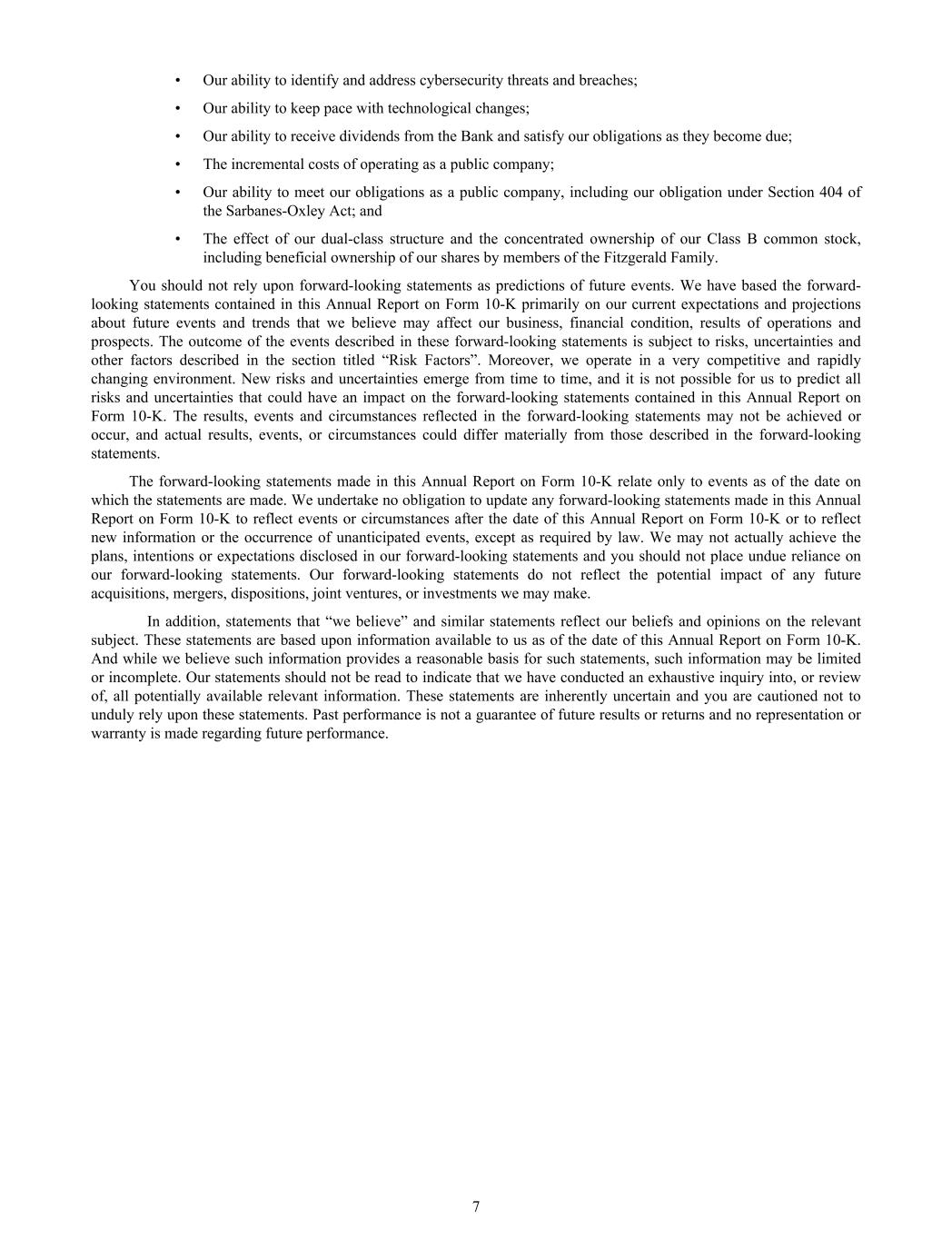 • Our ability to identify and address cybersecurity threats and breaches; • Our ability to keep pace with technological changes; • Our ability to receive dividends from the Bank and satisfy our obligations as they become due; • The incremental costs of operating as a public company; • Our ability to meet our obligations as a public company, including our obligation under Section 404 of the Sarbanes-Oxley Act; and • The effect of our dual-class structure and the concentrated ownership of our Class B common stock, including beneficial ownership of our shares by members of the Fitzgerald Family. You should not rely upon forward-looking statements as predictions of future events. We have based the forward- looking statements contained in this Annual Report on Form 10-K primarily on our current expectations and projections about future events and trends that we believe may affect our business, financial condition, results of operations and prospects. The outcome of the events described in these forward-looking statements is subject to risks, uncertainties and other factors described in the section titled “Risk Factors”. Moreover, we operate in a very competitive and rapidly changing environment. New risks and uncertainties emerge from time to time, and it is not possible for us to predict all risks and uncertainties that could have an impact on the forward-looking statements contained in this Annual Report on Form 10-K. The results, events and circumstances reflected in the forward-looking statements may not be achieved or occur, and actual results, events, or circumstances could differ materially from those described in the forward-looking statements. The forward-looking statements made in this Annual Report on Form 10-K relate only to events as of the date on which the statements are made. We undertake no obligation to update any forward-looking statements made in this Annual Report on Form 10-K to reflect events or circumstances after the date of this Annual Report on Form 10-K or to reflect new information or the occurrence of unanticipated events, except as required by law. We may not actually achieve the plans, intentions or expectations disclosed in our forward-looking statements and you should not place undue reliance on our forward-looking statements. Our forward-looking statements do not reflect the potential impact of any future acquisitions, mergers, dispositions, joint ventures, or investments we may make. In addition, statements that “we believe” and similar statements reflect our beliefs and opinions on the relevant subject. These statements are based upon information available to us as of the date of this Annual Report on Form 10-K. And while we believe such information provides a reasonable basis for such statements, such information may be limited or incomplete. Our statements should not be read to indicate that we have conducted an exhaustive inquiry into, or review of, all potentially available relevant information. These statements are inherently uncertain and you are cautioned not to unduly rely upon these statements. Past performance is not a guarantee of future results or returns and no representation or warranty is made regarding future performance. 7