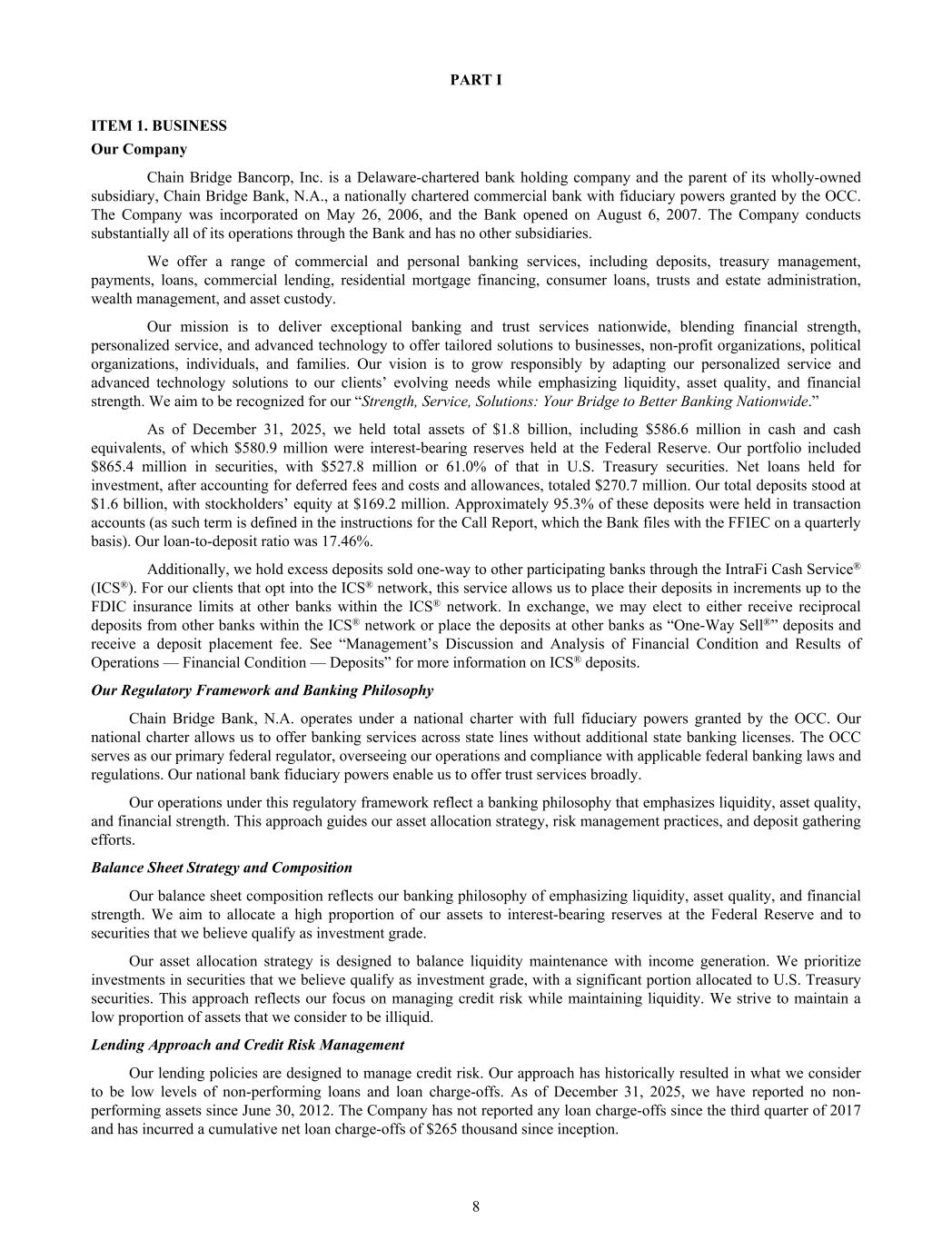 PART I ITEM 1. BUSINESS Our Company Chain Bridge Bancorp, Inc. is a Delaware-chartered bank holding company and the parent of its wholly-owned subsidiary, Chain Bridge Bank, N.A., a nationally chartered commercial bank with fiduciary powers granted by the OCC. The Company was incorporated on May 26, 2006, and the Bank opened on August 6, 2007. The Company conducts substantially all of its operations through the Bank and has no other subsidiaries. We offer a range of commercial and personal banking services, including deposits, treasury management, payments, loans, commercial lending, residential mortgage financing, consumer loans, trusts and estate administration, wealth management, and asset custody. Our mission is to deliver exceptional banking and trust services nationwide, blending financial strength, personalized service, and advanced technology to offer tailored solutions to businesses, non-profit organizations, political organizations, individuals, and families. Our vision is to grow responsibly by adapting our personalized service and advanced technology solutions to our clients’ evolving needs while emphasizing liquidity, asset quality, and financial strength. We aim to be recognized for our “Strength, Service, Solutions: Your Bridge to Better Banking Nationwide.” As of December 31, 2025, we held total assets of $1.8 billion, including $586.6 million in cash and cash equivalents, of which $580.9 million were interest-bearing reserves held at the Federal Reserve. Our portfolio included $865.4 million in securities, with $527.8 million or 61.0% of that in U.S. Treasury securities. Net loans held for investment, after accounting for deferred fees and costs and allowances, totaled $270.7 million. Our total deposits stood at $1.6 billion, with stockholders’ equity at $169.2 million. Approximately 95.3% of these deposits were held in transaction accounts (as such term is defined in the instructions for the Call Report, which the Bank files with the FFIEC on a quarterly basis). Our loan-to-deposit ratio was 17.46%. Additionally, we hold excess deposits sold one-way to other participating banks through the IntraFi Cash Service® (ICS®). For our clients that opt into the ICS® network, this service allows us to place their deposits in increments up to the FDIC insurance limits at other banks within the ICS® network. In exchange, we may elect to either receive reciprocal deposits from other banks within the ICS® network or place the deposits at other banks as “One-Way Sell®” deposits and receive a deposit placement fee. See “Management’s Discussion and Analysis of Financial Condition and Results of Operations — Financial Condition — Deposits” for more information on ICS® deposits. Our Regulatory Framework and Banking Philosophy Chain Bridge Bank, N.A. operates under a national charter with full fiduciary powers granted by the OCC. Our national charter allows us to offer banking services across state lines without additional state banking licenses. The OCC serves as our primary federal regulator, overseeing our operations and compliance with applicable federal banking laws and regulations. Our national bank fiduciary powers enable us to offer trust services broadly. Our operations under this regulatory framework reflect a banking philosophy that emphasizes liquidity, asset quality, and financial strength. This approach guides our asset allocation strategy, risk management practices, and deposit gathering efforts. Balance Sheet Strategy and Composition Our balance sheet composition reflects our banking philosophy of emphasizing liquidity, asset quality, and financial strength. We aim to allocate a high proportion of our assets to interest-bearing reserves at the Federal Reserve and to securities that we believe qualify as investment grade. Our asset allocation strategy is designed to balance liquidity maintenance with income generation. We prioritize investments in securities that we believe qualify as investment grade, with a significant portion allocated to U.S. Treasury securities. This approach reflects our focus on managing credit risk while maintaining liquidity. We strive to maintain a low proportion of assets that we consider to be illiquid. Lending Approach and Credit Risk Management Our lending policies are designed to manage credit risk. Our approach has historically resulted in what we consider to be low levels of non-performing loans and loan charge-offs. As of December 31, 2025, we have reported no non- performing assets since June 30, 2012. The Company has not reported any loan charge-offs since the third quarter of 2017 and has incurred a cumulative net loan charge-offs of $265 thousand since inception. 8