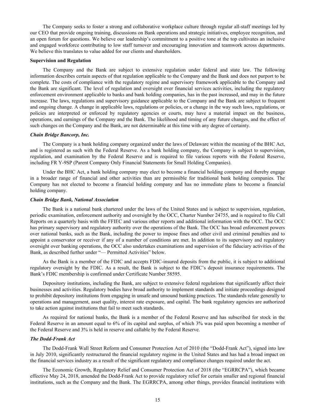 The Company seeks to foster a strong and collaborative workplace culture through regular all-staff meetings led by our CEO that provide ongoing training, discussions on Bank operations and strategic initiatives, employee recognition, and an open forum for questions. We believe our leadership’s commitment to a positive tone at the top cultivates an inclusive and engaged workforce contributing to low staff turnover and encouraging innovation and teamwork across departments. We believe this translates to value added for our clients and shareholders. Supervision and Regulation The Company and the Bank are subject to extensive regulation under federal and state law. The following information describes certain aspects of that regulation applicable to the Company and the Bank and does not purport to be complete. The costs of compliance with the regulatory regime and supervisory framework applicable to the Company and the Bank are significant. The level of regulation and oversight over financial services activities, including the regulatory enforcement environment applicable to banks and bank holding companies, has in the past increased, and may in the future increase. The laws, regulations and supervisory guidance applicable to the Company and the Bank are subject to frequent and ongoing change. A change in applicable laws, regulations or policies, or a change in the way such laws, regulations, or policies are interpreted or enforced by regulatory agencies or courts, may have a material impact on the business, operations, and earnings of the Company and the Bank. The likelihood and timing of any future changes, and the effect of such changes on the Company and the Bank, are not determinable at this time with any degree of certainty. Chain Bridge Bancorp, Inc. The Company is a bank holding company organized under the laws of Delaware within the meaning of the BHC Act, and is registered as such with the Federal Reserve. As a bank holding company, the Company is subject to supervision, regulation, and examination by the Federal Reserve and is required to file various reports with the Federal Reserve, including FR Y-9SP (Parent Company Only Financial Statements for Small Holding Companies). Under the BHC Act, a bank holding company may elect to become a financial holding company and thereby engage in a broader range of financial and other activities than are permissible for traditional bank holding companies. The Company has not elected to become a financial holding company and has no immediate plans to become a financial holding company. Chain Bridge Bank, National Association The Bank is a national bank chartered under the laws of the United States and is subject to supervision, regulation, periodic examination, enforcement authority and oversight by the OCC, Charter Number 24755, and is required to file Call Reports on a quarterly basis with the FFIEC and various other reports and additional information with the OCC. The OCC has primary supervisory and regulatory authority over the operations of the Bank. The OCC has broad enforcement powers over national banks, such as the Bank, including the power to impose fines and other civil and criminal penalties and to appoint a conservator or receiver if any of a number of conditions are met. In addition to its supervisory and regulatory oversight over banking operations, the OCC also undertakes examinations and supervision of the fiduciary activities of the Bank, as described further under “— Permitted Activities” below. As the Bank is a member of the FDIC and accepts FDIC-insured deposits from the public, it is subject to additional regulatory oversight by the FDIC. As a result, the Bank is subject to the FDIC’s deposit insurance requirements. The Bank’s FDIC membership is confirmed under Certificate Number 58595. Depository institutions, including the Bank, are subject to extensive federal regulations that significantly affect their businesses and activities. Regulatory bodies have broad authority to implement standards and initiate proceedings designed to prohibit depository institutions from engaging in unsafe and unsound banking practices. The standards relate generally to operations and management, asset quality, interest rate exposure, and capital. The bank regulatory agencies are authorized to take action against institutions that fail to meet such standards. As required for national banks, the Bank is a member of the Federal Reserve and has subscribed for stock in the Federal Reserve in an amount equal to 6% of its capital and surplus, of which 3% was paid upon becoming a member of the Federal Reserve and 3% is held in reserve and callable by the Federal Reserve. The Dodd-Frank Act The Dodd-Frank Wall Street Reform and Consumer Protection Act of 2010 (the “Dodd-Frank Act”), signed into law in July 2010, significantly restructured the financial regulatory regime in the United States and has had a broad impact on the financial services industry as a result of the significant regulatory and compliance changes required under the act. The Economic Growth, Regulatory Relief and Consumer Protection Act of 2018 (the “EGRRCPA”), which became effective May 24, 2018, amended the Dodd-Frank Act to provide regulatory relief for certain smaller and regional financial institutions, such as the Company and the Bank. The EGRRCPA, among other things, provides financial institutions with 15