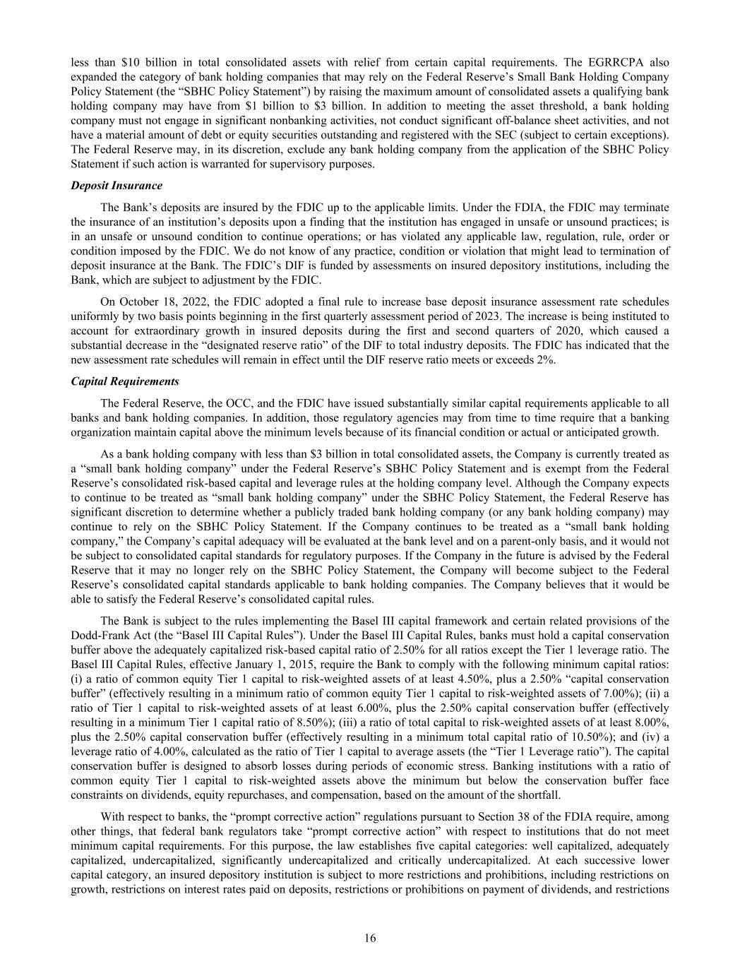 less than $10 billion in total consolidated assets with relief from certain capital requirements. The EGRRCPA also expanded the category of bank holding companies that may rely on the Federal Reserve’s Small Bank Holding Company Policy Statement (the “SBHC Policy Statement”) by raising the maximum amount of consolidated assets a qualifying bank holding company may have from $1 billion to $3 billion. In addition to meeting the asset threshold, a bank holding company must not engage in significant nonbanking activities, not conduct significant off-balance sheet activities, and not have a material amount of debt or equity securities outstanding and registered with the SEC (subject to certain exceptions). The Federal Reserve may, in its discretion, exclude any bank holding company from the application of the SBHC Policy Statement if such action is warranted for supervisory purposes. Deposit Insurance The Bank’s deposits are insured by the FDIC up to the applicable limits. Under the FDIA, the FDIC may terminate the insurance of an institution’s deposits upon a finding that the institution has engaged in unsafe or unsound practices; is in an unsafe or unsound condition to continue operations; or has violated any applicable law, regulation, rule, order or condition imposed by the FDIC. We do not know of any practice, condition or violation that might lead to termination of deposit insurance at the Bank. The FDIC’s DIF is funded by assessments on insured depository institutions, including the Bank, which are subject to adjustment by the FDIC. On October 18, 2022, the FDIC adopted a final rule to increase base deposit insurance assessment rate schedules uniformly by two basis points beginning in the first quarterly assessment period of 2023. The increase is being instituted to account for extraordinary growth in insured deposits during the first and second quarters of 2020, which caused a substantial decrease in the “designated reserve ratio” of the DIF to total industry deposits. The FDIC has indicated that the new assessment rate schedules will remain in effect until the DIF reserve ratio meets or exceeds 2%. Capital Requirements The Federal Reserve, the OCC, and the FDIC have issued substantially similar capital requirements applicable to all banks and bank holding companies. In addition, those regulatory agencies may from time to time require that a banking organization maintain capital above the minimum levels because of its financial condition or actual or anticipated growth. As a bank holding company with less than $3 billion in total consolidated assets, the Company is currently treated as a “small bank holding company” under the Federal Reserve’s SBHC Policy Statement and is exempt from the Federal Reserve’s consolidated risk-based capital and leverage rules at the holding company level. Although the Company expects to continue to be treated as “small bank holding company” under the SBHC Policy Statement, the Federal Reserve has significant discretion to determine whether a publicly traded bank holding company (or any bank holding company) may continue to rely on the SBHC Policy Statement. If the Company continues to be treated as a “small bank holding company,” the Company’s capital adequacy will be evaluated at the bank level and on a parent-only basis, and it would not be subject to consolidated capital standards for regulatory purposes. If the Company in the future is advised by the Federal Reserve that it may no longer rely on the SBHC Policy Statement, the Company will become subject to the Federal Reserve’s consolidated capital standards applicable to bank holding companies. The Company believes that it would be able to satisfy the Federal Reserve’s consolidated capital rules. The Bank is subject to the rules implementing the Basel III capital framework and certain related provisions of the Dodd-Frank Act (the “Basel III Capital Rules”). Under the Basel III Capital Rules, banks must hold a capital conservation buffer above the adequately capitalized risk-based capital ratio of 2.50% for all ratios except the Tier 1 leverage ratio. The Basel III Capital Rules, effective January 1, 2015, require the Bank to comply with the following minimum capital ratios: (i) a ratio of common equity Tier 1 capital to risk-weighted assets of at least 4.50%, plus a 2.50% “capital conservation buffer” (effectively resulting in a minimum ratio of common equity Tier 1 capital to risk-weighted assets of 7.00%); (ii) a ratio of Tier 1 capital to risk-weighted assets of at least 6.00%, plus the 2.50% capital conservation buffer (effectively resulting in a minimum Tier 1 capital ratio of 8.50%); (iii) a ratio of total capital to risk-weighted assets of at least 8.00%, plus the 2.50% capital conservation buffer (effectively resulting in a minimum total capital ratio of 10.50%); and (iv) a leverage ratio of 4.00%, calculated as the ratio of Tier 1 capital to average assets (the “Tier 1 Leverage ratio”). The capital conservation buffer is designed to absorb losses during periods of economic stress. Banking institutions with a ratio of common equity Tier 1 capital to risk-weighted assets above the minimum but below the conservation buffer face constraints on dividends, equity repurchases, and compensation, based on the amount of the shortfall. With respect to banks, the “prompt corrective action” regulations pursuant to Section 38 of the FDIA require, among other things, that federal bank regulators take “prompt corrective action” with respect to institutions that do not meet minimum capital requirements. For this purpose, the law establishes five capital categories: well capitalized, adequately capitalized, undercapitalized, significantly undercapitalized and critically undercapitalized. At each successive lower capital category, an insured depository institution is subject to more restrictions and prohibitions, including restrictions on growth, restri