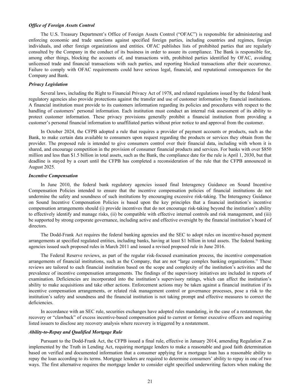 Office of Foreign Assets Control The U.S. Treasury Department’s Office of Foreign Assets Control (“OFAC”) is responsible for administering and enforcing economic and trade sanctions against specified foreign parties, including countries and regimes, foreign individuals, and other foreign organizations and entities. OFAC publishes lists of prohibited parties that are regularly consulted by the Company in the conduct of its business in order to assure its compliance. The Bank is responsible for, among other things, blocking the accounts of, and transactions with, prohibited parties identified by OFAC, avoiding unlicensed trade and financial transactions with such parties, and reporting blocked transactions after their occurrence. Failure to comply with OFAC requirements could have serious legal, financial, and reputational consequences for the Company and Bank. Privacy Legislation Several laws, including the Right to Financial Privacy Act of 1978, and related regulations issued by the federal bank regulatory agencies also provide protections against the transfer and use of customer information by financial institutions. A financial institution must provide to its customers information regarding its policies and procedures with respect to the handling of customers’ personal information. Each institution must conduct an internal risk assessment of its ability to protect customer information. These privacy provisions generally prohibit a financial institution from providing a customer’s personal financial information to unaffiliated parties without prior notice to and approval from the customer. In October 2024, the CFPB adopted a rule that requires a provider of payment accounts or products, such as the Bank, to make certain data available to consumers upon request regarding the products or services they obtain from the provider. The proposed rule is intended to give consumers control over their financial data, including with whom it is shared, and encourage competition in the provision of consumer financial products and services. For banks with over $850 million and less than $1.5 billion in total assets, such as the Bank, the compliance date for the rule is April 1, 2030, but that deadline is stayed by a court until the CFPB has completed a reconsideration of the rule that the CFPB announced in August 2025. Incentive Compensation In June 2010, the federal bank regulatory agencies issued final Interagency Guidance on Sound Incentive Compensation Policies intended to ensure that the incentive compensation policies of financial institutions do not undermine the safety and soundness of such institutions by encouraging excessive risk-taking. The Interagency Guidance on Sound Incentive Compensation Policies is based upon the key principles that a financial institution’s incentive compensation arrangements should (i) provide incentives that do not encourage risk-taking beyond the institution’s ability to effectively identify and manage risks, (ii) be compatible with effective internal controls and risk management, and (iii) be supported by strong corporate governance, including active and effective oversight by the financial institution’s board of directors. The Dodd-Frank Act requires the federal banking agencies and the SEC to adopt rules on incentive-based payment arrangements at specified regulated entities, including banks, having at least $1 billion in total assets. The federal banking agencies issued such proposed rules in March 2011 and issued a revised proposed rule in June 2016. The Federal Reserve reviews, as part of the regular risk-focused examination process, the incentive compensation arrangements of financial institutions, such as the Company, that are not “large complex banking organizations.” These reviews are tailored to each financial institution based on the scope and complexity of the institution’s activities and the prevalence of incentive compensation arrangements. The findings of the supervisory initiatives are included in reports of examination. Deficiencies are incorporated into the institution’s supervisory ratings, which can affect the institution’s ability to make acquisitions and take other actions. Enforcement actions may be taken against a financial institution if its incentive compensation arrangements, or related risk management control or governance processes, pose a risk to the institution’s safety and soundness and the financial institution is not taking prompt and effective measures to correct the deficiencies. In accordance with an SEC rule, securities exchanges have adopted rules mandating, in the case of a restatement, the recovery or “clawback” of excess incentive-based compensation paid to current or former executive officers and requiring listed issuers to disclose any recovery analysis where recovery is triggered by a restatement. Ability-to-Repay and Qualified Mortgage Rule Pursuant to the Dodd-Frank Act, the CFPB issued a final rule, effective in January 2014, amending Regulation Z as implemented by the Truth in Lending Act, requiring mortgage lenders to make a reasonable and good faith determination based on verified and documented information that a consumer applying for a mortgage loan has a reasonable ability to repay the loan according to its terms. Mortgage lenders are required to determine consumers’ ability to repay in one of two ways. The first alternative requires the mortgage lender to consider eight specified underwriting factors when making the 21