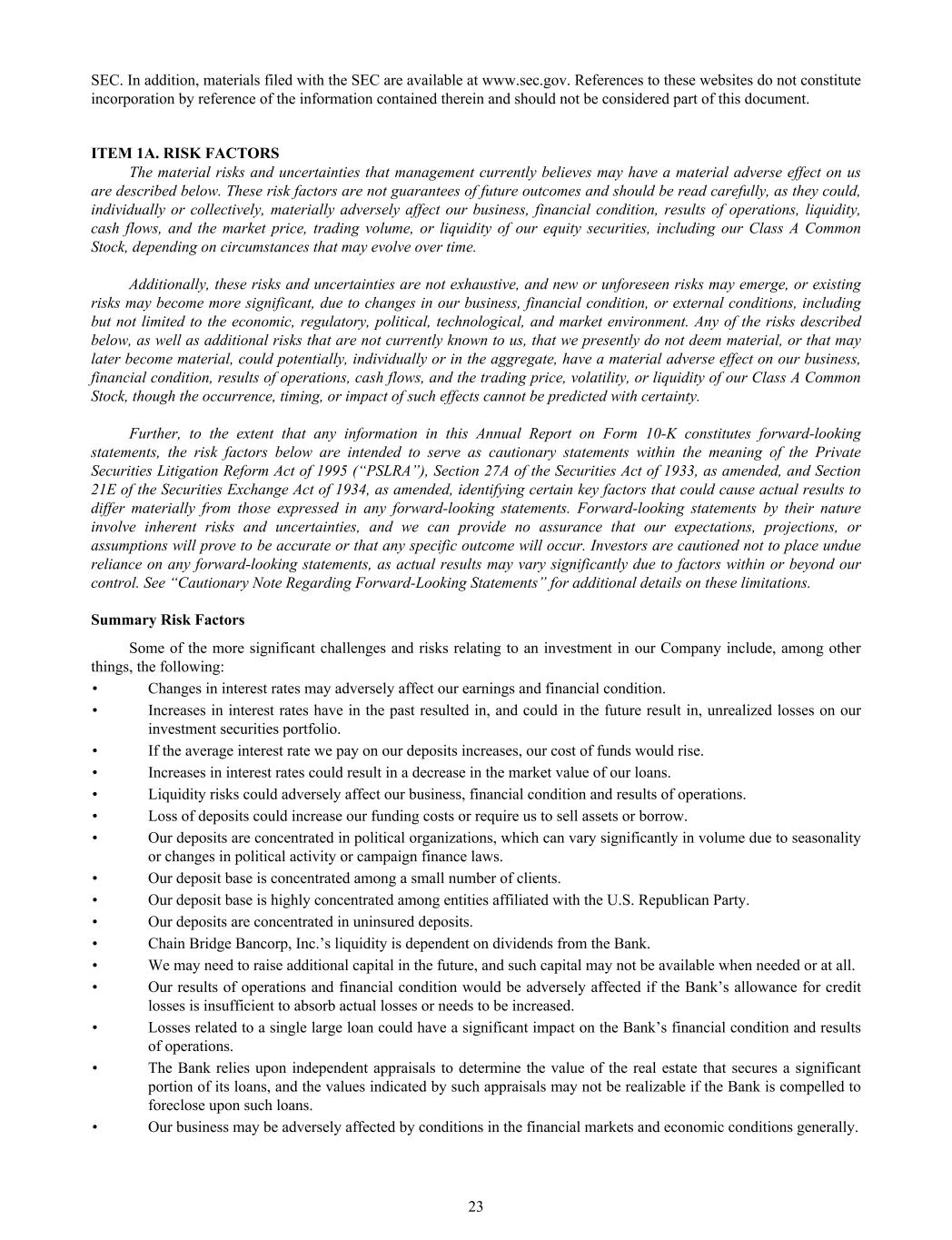 SEC. In addition, materials filed with the SEC are available at www.sec.gov. References to these websites do not constitute incorporation by reference of the information contained therein and should not be considered part of this document. ITEM 1A. RISK FACTORS The material risks and uncertainties that management currently believes may have a material adverse effect on us are described below. These risk factors are not guarantees of future outcomes and should be read carefully, as they could, individually or collectively, materially adversely affect our business, financial condition, results of operations, liquidity, cash flows, and the market price, trading volume, or liquidity of our equity securities, including our Class A Common Stock, depending on circumstances that may evolve over time. Additionally, these risks and uncertainties are not exhaustive, and new or unforeseen risks may emerge, or existing risks may become more significant, due to changes in our business, financial condition, or external conditions, including but not limited to the economic, regulatory, political, technological, and market environment. Any of the risks described below, as well as additional risks that are not currently known to us, that we presently do not deem material, or that may later become material, could potentially, individually or in the aggregate, have a material adverse effect on our business, financial condition, results of operations, cash flows, and the trading price, volatility, or liquidity of our Class A Common Stock, though the occurrence, timing, or impact of such effects cannot be predicted with certainty. Further, to the extent that any information in this Annual Report on Form 10-K constitutes forward-looking statements, the risk factors below are intended to serve as cautionary statements within the meaning of the Private Securities Litigation Reform Act of 1995 (“PSLRA”), Section 27A of the Securities Act of 1933, as amended, and Section 21E of the Securities Exchange Act of 1934, as amended, identifying certain key factors that could cause actual results to differ materially from those expressed in any forward-looking statements. Forward-looking statements by their nature involve inherent risks and uncertainties, and we can provide no assurance that our expectations, projections, or assumptions will prove to be accurate or that any specific outcome will occur. Investors are cautioned not to place undue reliance on any forward-looking statements, as actual results may vary significantly due to factors within or beyond our control. See “Cautionary Note Regarding Forward-Looking Statements” for additional details on these limitations. Summary Risk Factors Some of the more significant challenges and risks relating to an investment in our Company include, among other things, the following: • Changes in interest rates may adversely affect our earnings and financial condition. • Increases in interest rates have in the past resulted in, and could in the future result in, unrealized losses on our investment securities portfolio. • If the average interest rate we pay on our deposits increases, our cost of funds would rise. • Increases in interest rates could result in a decrease in the market value of our loans. • Liquidity risks could adversely affect our business, financial condition and results of operations. • Loss of deposits could increase our funding costs or require us to sell assets or borrow. • Our deposits are concentrated in political organizations, which can vary significantly in volume due to seasonality or changes in political activity or campaign finance laws. • Our deposit base is concentrated among a small number of clients. • Our deposit base is highly concentrated among entities affiliated with the U.S. Republican Party. • Our deposits are concentrated in uninsured deposits. • Chain Bridge Bancorp, Inc.’s liquidity is dependent on dividends from the Bank. • We may need to raise additional capital in the future, and such capital may not be available when needed or at all. • Our results of operations and financial condition would be adversely affected if the Bank’s allowance for credit losses is insufficient to absorb actual losses or needs to be increased. • Losses related to a single large loan could have a significant impact on the Bank’s financial condition and results of operations. • The Bank relies upon independent appraisals to determine the value of the real estate that secures a significant portion of its loans, and the values indicated by such appraisals may not be realizable if the Bank is compelled to foreclose upon such loans. • Our business may be adversely affected by conditions in the financial markets and economic conditions generally. 23