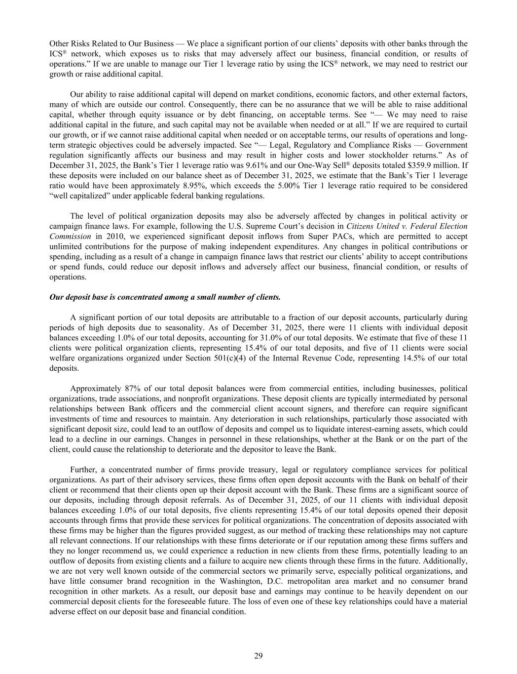 Other Risks Related to Our Business — We place a significant portion of our clients’ deposits with other banks through the ICS® network, which exposes us to risks that may adversely affect our business, financial condition, or results of operations.” If we are unable to manage our Tier 1 leverage ratio by using the ICS® network, we may need to restrict our growth or raise additional capital. Our ability to raise additional capital will depend on market conditions, economic factors, and other external factors, many of which are outside our control. Consequently, there can be no assurance that we will be able to raise additional capital, whether through equity issuance or by debt financing, on acceptable terms. See “— We may need to raise additional capital in the future, and such capital may not be available when needed or at all.” If we are required to curtail our growth, or if we cannot raise additional capital when needed or on acceptable terms, our results of operations and long- term strategic objectives could be adversely impacted. See “— Legal, Regulatory and Compliance Risks — Government regulation significantly affects our business and may result in higher costs and lower stockholder returns.” As of December 31, 2025, the Bank’s Tier 1 leverage ratio was 9.61% and our One-Way Sell® deposits totaled $359.9 million. If these deposits were included on our balance sheet as of December 31, 2025, we estimate that the Bank’s Tier 1 leverage ratio would have been approximately 8.95%, which exceeds the 5.00% Tier 1 leverage ratio required to be considered “well capitalized” under applicable federal banking regulations. The level of political organization deposits may also be adversely affected by changes in political activity or campaign finance laws. For example, following the U.S. Supreme Court’s decision in Citizens United v. Federal Election Commission in 2010, we experienced significant deposit inflows from Super PACs, which are permitted to accept unlimited contributions for the purpose of making independent expenditures. Any changes in political contributions or spending, including as a result of a change in campaign finance laws that restrict our clients’ ability to accept contributions or spend funds, could reduce our deposit inflows and adversely affect our business, financial condition, or results of operations. Our deposit base is concentrated among a small number of clients. A significant portion of our total deposits are attributable to a fraction of our deposit accounts, particularly during periods of high deposits due to seasonality. As of December 31, 2025, there were 11 clients with individual deposit balances exceeding 1.0% of our total deposits, accounting for 31.0% of our total deposits. We estimate that five of these 11 clients were political organization clients, representing 15.4% of our total deposits, and five of 11 clients were social welfare organizations organized under Section 501(c)(4) of the Internal Revenue Code, representing 14.5% of our total deposits. Approximately 87% of our total deposit balances were from commercial entities, including businesses, political organizations, trade associations, and nonprofit organizations. These deposit clients are typically intermediated by personal relationships between Bank officers and the commercial client account signers, and therefore can require significant investments of time and resources to maintain. Any deterioration in such relationships, particularly those associated with significant deposit size, could lead to an outflow of deposits and compel us to liquidate interest-earning assets, which could lead to a decline in our earnings. Changes in personnel in these relationships, whether at the Bank or on the part of the client, could cause the relationship to deteriorate and the depositor to leave the Bank. Further, a concentrated number of firms provide treasury, legal or regulatory compliance services for political organizations. As part of their advisory services, these firms often open deposit accounts with the Bank on behalf of their client or recommend that their clients open up their deposit account with the Bank. These firms are a significant source of our deposits, including through deposit referrals. As of December 31, 2025, of our 11 clients with individual deposit balances exceeding 1.0% of our total deposits, five clients representing 15.4% of our total deposits opened their deposit accounts through firms that provide these services for political organizations. The concentration of deposits associated with these firms may be higher than the figures provided suggest, as our method of tracking these relationships may not capture all relevant connections. If our relationships with these firms deteriorate or if our reputation among these firms suffers and they no longer recommend us, we could experience a reduction in new clients from these firms, potentially leading to an outflow of deposits from existing clients and a failure to acquire new clients through these firms in the future. Additionally, we are not very well known outside of the commercial sectors we primarily serve, especially political organizations, and have little consumer brand recognition in the Washington, D.C. metropolitan area market and no consumer brand recognition in other markets. As a result, our deposit base and earnings may continue to be heavily dependent on our commercial deposit clients for the foreseeable future. The loss of even one of these key relationships could have a material adverse effect on our deposit base and financial condition. 29