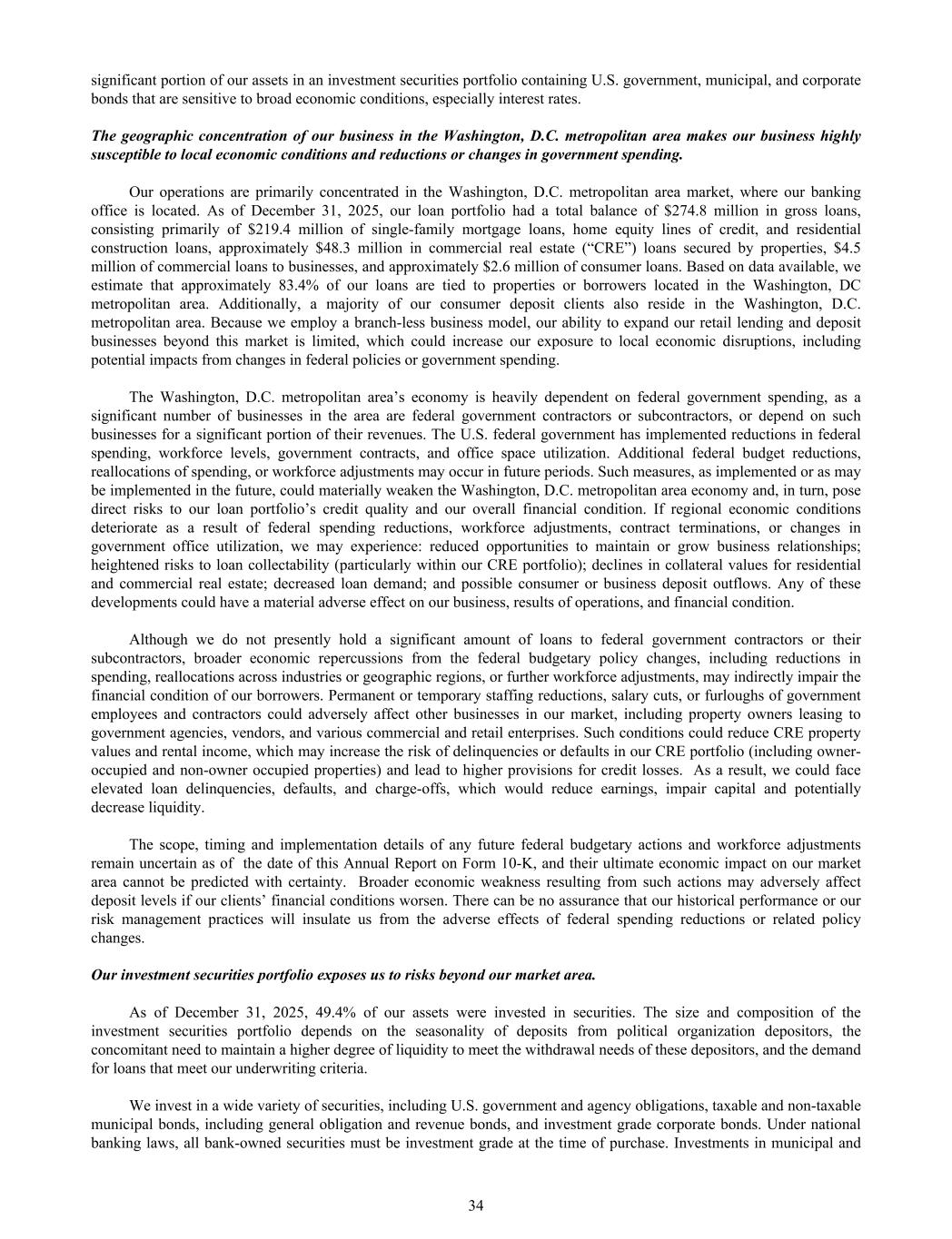 significant portion of our assets in an investment securities portfolio containing U.S. government, municipal, and corporate bonds that are sensitive to broad economic conditions, especially interest rates. The geographic concentration of our business in the Washington, D.C. metropolitan area makes our business highly susceptible to local economic conditions and reductions or changes in government spending. Our operations are primarily concentrated in the Washington, D.C. metropolitan area market, where our banking office is located. As of December 31, 2025, our loan portfolio had a total balance of $274.8 million in gross loans, consisting primarily of $219.4 million of single-family mortgage loans, home equity lines of credit, and residential construction loans, approximately $48.3 million in commercial real estate (“CRE”) loans secured by properties, $4.5 million of commercial loans to businesses, and approximately $2.6 million of consumer loans. Based on data available, we estimate that approximately 83.4% of our loans are tied to properties or borrowers located in the Washington, DC metropolitan area. Additionally, a majority of our consumer deposit clients also reside in the Washington, D.C. metropolitan area. Because we employ a branch-less business model, our ability to expand our retail lending and deposit businesses beyond this market is limited, which could increase our exposure to local economic disruptions, including potential impacts from changes in federal policies or government spending. The Washington, D.C. metropolitan area’s economy is heavily dependent on federal government spending, as a significant number of businesses in the area are federal government contractors or subcontractors, or depend on such businesses for a significant portion of their revenues. The U.S. federal government has implemented reductions in federal spending, workforce levels, government contracts, and office space utilization. Additional federal budget reductions, reallocations of spending, or workforce adjustments may occur in future periods. Such measures, as implemented or as may be implemented in the future, could materially weaken the Washington, D.C. metropolitan area economy and, in turn, pose direct risks to our loan portfolio’s credit quality and our overall financial condition. If regional economic conditions deteriorate as a result of federal spending reductions, workforce adjustments, contract terminations, or changes in government office utilization, we may experience: reduced opportunities to maintain or grow business relationships; heightened risks to loan collectability (particularly within our CRE portfolio); declines in collateral values for residential and commercial real estate; decreased loan demand; and possible consumer or business deposit outflows. Any of these developments could have a material adverse effect on our business, results of operations, and financial condition. Although we do not presently hold a significant amount of loans to federal government contractors or their subcontractors, broader economic repercussions from the federal budgetary policy changes, including reductions in spending, reallocations across industries or geographic regions, or further workforce adjustments, may indirectly impair the financial condition of our borrowers. Permanent or temporary staffing reductions, salary cuts, or furloughs of government employees and contractors could adversely affect other businesses in our market, including property owners leasing to government agencies, vendors, and various commercial and retail enterprises. Such conditions could reduce CRE property values and rental income, which may increase the risk of delinquencies or defaults in our CRE portfolio (including owner- occupied and non-owner occupied properties) and lead to higher provisions for credit losses. As a result, we could face elevated loan delinquencies, defaults, and charge-offs, which would reduce earnings, impair capital and potentially decrease liquidity. The scope, timing and implementation details of any future federal budgetary actions and workforce adjustments remain uncertain as of the date of this Annual Report on Form 10-K, and their ultimate economic impact on our market area cannot be predicted with certainty. Broader economic weakness resulting from such actions may adversely affect deposit levels if our clients’ financial conditions worsen. There can be no assurance that our historical performance or our risk management practices will insulate us from the adverse effects of federal spending reductions or related policy changes. Our investment securities portfolio exposes us to risks beyond our market area. As of December 31, 2025, 49.4% of our assets were invested in securities. The size and composition of the investment securities portfolio depends on the seasonality of deposits from political organization depositors, the concomitant need to maintain a higher degree of liquidity to meet the withdrawal needs of these depositors, and the demand for loans that meet our underwriting criteria. We invest in a wide variety of securities, including U.S. government and agency obligations, taxable and non-taxable municipal bonds, including general obligation and revenue bonds, and investment grade corporate bonds. Under national banking laws, all bank-owned securities must be investment grade at the time of purchase. Investments in municipal and 34