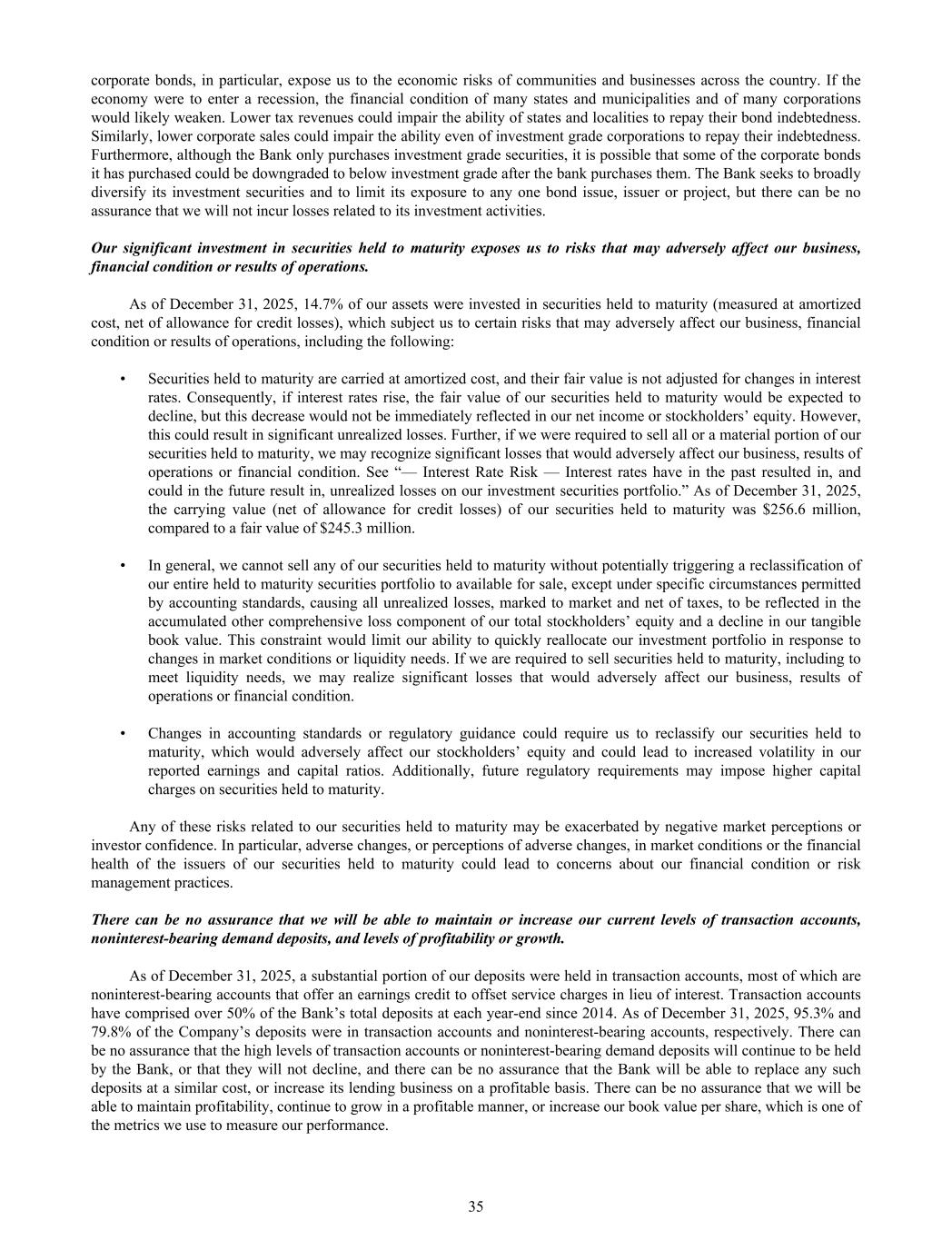 corporate bonds, in particular, expose us to the economic risks of communities and businesses across the country. If the economy were to enter a recession, the financial condition of many states and municipalities and of many corporations would likely weaken. Lower tax revenues could impair the ability of states and localities to repay their bond indebtedness. Similarly, lower corporate sales could impair the ability even of investment grade corporations to repay their indebtedness. Furthermore, although the Bank only purchases investment grade securities, it is possible that some of the corporate bonds it has purchased could be downgraded to below investment grade after the bank purchases them. The Bank seeks to broadly diversify its investment securities and to limit its exposure to any one bond issue, issuer or project, but there can be no assurance that we will not incur losses related to its investment activities. Our significant investment in securities held to maturity exposes us to risks that may adversely affect our business, financial condition or results of operations. As of December 31, 2025, 14.7% of our assets were invested in securities held to maturity (measured at amortized cost, net of allowance for credit losses), which subject us to certain risks that may adversely affect our business, financial condition or results of operations, including the following: • Securities held to maturity are carried at amortized cost, and their fair value is not adjusted for changes in interest rates. Consequently, if interest rates rise, the fair value of our securities held to maturity would be expected to decline, but this decrease would not be immediately reflected in our net income or stockholders’ equity. However, this could result in significant unrealized losses. Further, if we were required to sell all or a material portion of our securities held to maturity, we may recognize significant losses that would adversely affect our business, results of operations or financial condition. See “— Interest Rate Risk — Interest rates have in the past resulted in, and could in the future result in, unrealized losses on our investment securities portfolio.” As of December 31, 2025, the carrying value (net of allowance for credit losses) of our securities held to maturity was $256.6 million, compared to a fair value of $245.3 million. • In general, we cannot sell any of our securities held to maturity without potentially triggering a reclassification of our entire held to maturity securities portfolio to available for sale, except under specific circumstances permitted by accounting standards, causing all unrealized losses, marked to market and net of taxes, to be reflected in the accumulated other comprehensive loss component of our total stockholders’ equity and a decline in our tangible book value. This constraint would limit our ability to quickly reallocate our investment portfolio in response to changes in market conditions or liquidity needs. If we are required to sell securities held to maturity, including to meet liquidity needs, we may realize significant losses that would adversely affect our business, results of operations or financial condition. • Changes in accounting standards or regulatory guidance could require us to reclassify our securities held to maturity, which would adversely affect our stockholders’ equity and could lead to increased volatility in our reported earnings and capital ratios. Additionally, future regulatory requirements may impose higher capital charges on securities held to maturity. Any of these risks related to our securities held to maturity may be exacerbated by negative market perceptions or investor confidence. In particular, adverse changes, or perceptions of adverse changes, in market conditions or the financial health of the issuers of our securities held to maturity could lead to concerns about our financial condition or risk management practices. There can be no assurance that we will be able to maintain or increase our current levels of transaction accounts, noninterest-bearing demand deposits, and levels of profitability or growth. As of December 31, 2025, a substantial portion of our deposits were held in transaction accounts, most of which are noninterest-bearing accounts that offer an earnings credit to offset service charges in lieu of interest. Transaction accounts have comprised over 50% of the Bank’s total deposits at each year-end since 2014. As of December 31, 2025, 95.3% and 79.8% of the Company’s deposits were in transaction accounts and noninterest-bearing accounts, respectively. There can be no assurance that the high levels of transaction accounts or noninterest-bearing demand deposits will continue to be held by the Bank, or that they will not decline, and there can be no assurance that the Bank will be able to replace any such deposits at a similar cost, or increase its lending business on a profitable basis. There can be no assurance that we will be able to maintain profitability, continue to grow in a profitable manner, or increase our book value per share, which is one of the metrics we use to measure our performance. 35