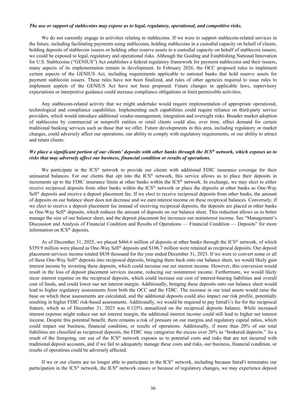 The use or support of stablecoins may expose us to legal, regulatory, operational, and competitive risks. We do not currently engage in activities relating to stablecoins. If we were to support stablecoin-related services in the future, including facilitating payments using stablecoins, holding stablecoins in a custodial capacity on behalf of clients, holding deposits of stablecoin issuers or holding other reserve assets in a custodial capacity on behalf of stablecoin issuers, we could be exposed to legal, regulatory and operational risks. Although the Guiding and Establishing National Innovation for U.S. Stablecoins (“GENIUS”) Act establishes a federal regulatory framework for payment stablecoins and their issuers, many aspects of its implementation remain in development. In February 2026, the OCC proposed rules to implement certain aspects of the GENIUS Act, including requirements applicable to national banks that hold reserve assets for payment stablecoin issuers. These rules have not been finalized, and rules of other agencies required to issue rules to implement aspects of the GENIUS Act have not been proposed. Future changes in applicable laws, supervisory expectations or interpretive guidance could increase compliance obligations or limit permissible activities. Any stablecoin-related activity that we might undertake would require implementation of appropriate operational, technological and compliance capabilities. Implementing such capabilities could require reliance on third-party service providers, which would introduce additional vendor-management, integration and oversight risks. Broader market adoption of stablecoins by commercial or nonprofit entities or retail clients could also, over time, affect demand for certain traditional banking services such as those that we offer. Future developments in this area, including regulatory or market changes, could adversely affect our operations, our ability to comply with regulatory requirements, or our ability to attract and retain clients. We place a significant portion of our clients’ deposits with other banks through the ICS® network, which exposes us to risks that may adversely affect our business, financial condition or results of operations. We participate in the ICS® network to provide our clients with additional FDIC insurance coverage for their uninsured balances. For our clients that opt into the ICS® network, this service allows us to place their deposits in increments up to the FDIC insurance limits at other banks within the ICS® network. In exchange, we may elect to either receive reciprocal deposits from other banks within the ICS® network or place the deposits at other banks as One-Way Sell® deposits and receive a deposit placement fee. If we elect to receive reciprocal deposits from other banks, the amount of deposits on our balance sheet does not decrease and we earn interest income on these reciprocal balances. Conversely, if we elect to receive a deposit placement fee instead of receiving reciprocal deposits, the deposits are placed at other banks as One-Way Sell® deposits, which reduces the amount of deposits on our balance sheet. This reduction allows us to better manage the size of our balance sheet, and the deposit placement fee increases our noninterest income. See “Management’s Discussion and Analysis of Financial Condition and Results of Operations — Financial Condition — Deposits” for more information on ICS® deposits. As of December 31, 2025, we placed $466.6 million of deposits at other banks through the ICS® network, of which $359.9 million were placed as One-Way Sell® deposits and $106.7 million were retained as reciprocal deposits. Our deposit placement services income totaled $838 thousand for the year ended December 31, 2025. If we were to convert some or all of these One-Way Sell® deposits into reciprocal deposits, bringing them back onto our balance sheet, we would likely gain interest income by investing these deposits, which could increase our net interest income. However, this conversion would result in the loss of deposit placement services income, reducing our noninterest income. Furthermore, we would likely incur interest expense on the reciprocal deposits, which could increase our cost of interest-bearing liabilities and overall cost of funds, and could lower our net interest margin. Additionally, bringing these deposits onto our balance sheet would lead to higher regulatory assessments from both the OCC and the FDIC. The increase in our total assets would raise the base on which these assessments are calculated, and the additional deposits could also impact our risk profile, potentially resulting in higher FDIC risk-based assessments. Additionally, we would be required to pay IntraFi’s fee for the reciprocal feature, which as of December 31, 2025 was 0.125% annualized on the reciprocal deposits balance. While increased interest expense might reduce our net interest margin, the additional interest income could still lead to higher net interest income. Despite this potential benefit, there remains a risk of pressure on our margins and regulatory capital ratios, which could impact our business, financial condition, or results of operations. Additionally, if more than 20% of our total liabilities are classified as reciprocal deposits, the FDIC may categorize the excess over 20% as “brokered deposits.” As a result of the foregoing, our use of the ICS® network exposes us to potential costs and risks that are not incurred with traditional deposit accounts, and if we fail to adequately manage these costs and risks, our business, financial condition, or results of operations could be adversely affected. If we or our clients are no longer able to participate in the ICS® network, including because IntraFi terminates our participation in the ICS® network, the ICS® network ceases or because of regulatory changes, we may experience deposit 36