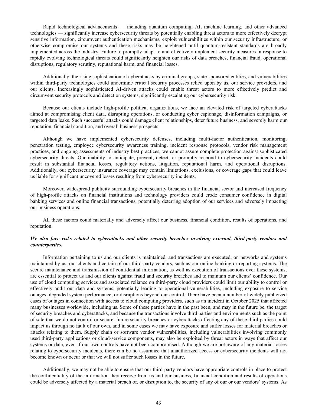 Rapid technological advancements — including quantum computing, AI, machine learning, and other advanced technologies — significantly increase cybersecurity threats by potentially enabling threat actors to more effectively decrypt sensitive information, circumvent authentication mechanisms, exploit vulnerabilities within our security infrastructure, or otherwise compromise our systems and these risks may be heightened until quantum-resistant standards are broadly implemented across the industry. Failure to promptly adapt to and effectively implement security measures in response to rapidly evolving technological threats could significantly heighten our risks of data breaches, financial fraud, operational disruptions, regulatory scrutiny, reputational harm, and financial losses. Additionally, the rising sophistication of cyberattacks by criminal groups, state-sponsored entities, and vulnerabilities within third-party technologies could undermine critical security processes relied upon by us, our service providers, and our clients. Increasingly sophisticated AI-driven attacks could enable threat actors to more effectively predict and circumvent security protocols and detection systems, significantly escalating our cybersecurity risk. Because our clients include high-profile political organizations, we face an elevated risk of targeted cyberattacks aimed at compromising client data, disrupting operations, or conducting cyber espionage, disinformation campaigns, or targeted data leaks. Such successful attacks could damage client relationships, deter future business, and severely harm our reputation, financial condition, and overall business prospects. Although we have implemented cybersecurity defenses, including multi-factor authentication, monitoring, penetration testing, employee cybersecurity awareness training, incident response protocols, vendor risk management practices, and ongoing assessments of industry best practices, we cannot assure complete protection against sophisticated cybersecurity threats. Our inability to anticipate, prevent, detect, or promptly respond to cybersecurity incidents could result in substantial financial losses, regulatory actions, litigation, reputational harm, and operational disruptions. Additionally, our cybersecurity insurance coverage may contain limitations, exclusions, or coverage gaps that could leave us liable for significant uncovered losses resulting from cybersecurity incidents. Moreover, widespread publicity surrounding cybersecurity breaches in the financial sector and increased frequency of high-profile attacks on financial institutions and technology providers could erode consumer confidence in digital banking services and online financial transactions, potentially deterring adoption of our services and adversely impacting our business operations. All these factors could materially and adversely affect our business, financial condition, results of operations, and reputation. We also face risks related to cyberattacks and other security breaches involving external, third-party vendors and counterparties. Information pertaining to us and our clients is maintained, and transactions are executed, on networks and systems maintained by us, our clients and certain of our third-party vendors, such as our online banking or reporting systems. The secure maintenance and transmission of confidential information, as well as execution of transactions over these systems, are essential to protect us and our clients against fraud and security breaches and to maintain our clients’ confidence. Our use of cloud computing services and associated reliance on third-party cloud providers could limit our ability to control or effectively audit our data and systems, potentially leading to operational vulnerabilities, including exposure to service outages, degraded system performance, or disruptions beyond our control. There have been a number of widely publicized cases of outages in connection with access to cloud computing providers, such as an incident in October 2025 that affected many businesses worldwide, including us. Some of these parties have in the past been, and may in the future be, the target of security breaches and cyberattacks, and because the transactions involve third parties and environments such as the point of sale that we do not control or secure, future security breaches or cyberattacks affecting any of these third parties could impact us through no fault of our own, and in some cases we may have exposure and suffer losses for material breaches or attacks relating to them. Supply chain or software vendor vulnerabilities, including vulnerabilities involving commonly used third-party applications or cloud-service components, may also be exploited by threat actors in ways that affect our systems or data, even if our own controls have not been compromised. Although we are not aware of any material losses relating to cybersecurity incidents, there can be no assurance that unauthorized access or cybersecurity incidents will not become known or occur or that we will not suffer such losses in the future. Additionally, we may not be able to ensure that our third-party vendors have appropriate controls in place to protect the confidentiality of the information they receive from us and our business, financial condition and results of operations could be adversely affected by a material breach of, or disruption to, the security of any of our or our vendors’ systems. As 43
