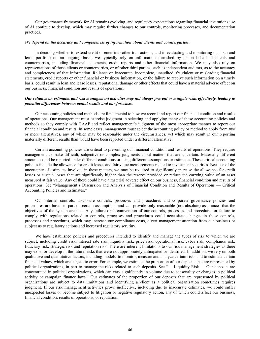Our governance framework for AI remains evolving, and regulatory expectations regarding financial institutions use of AI continue to develop, which may require further changes to our controls, monitoring processes, and documentation practices. We depend on the accuracy and completeness of information about clients and counterparties. In deciding whether to extend credit or enter into other transactions, and in evaluating and monitoring our loan and lease portfolio on an ongoing basis, we typically rely on information furnished by or on behalf of clients and counterparties, including financial statements, credit reports and other financial information. We may also rely on representations of those clients or counterparties, or of other third parties, such as independent auditors, as to the accuracy and completeness of that information. Reliance on inaccurate, incomplete, unaudited, fraudulent or misleading financial statements, credit reports or other financial or business information, or the failure to receive such information on a timely basis, could result in loan and lease losses, reputational damage or other effects that could have a material adverse effect on our business, financial condition and results of operations. Our reliance on estimates and risk management activities may not always prevent or mitigate risks effectively, leading to potential differences between actual results and our forecasts. Our accounting policies and methods are fundamental to how we record and report our financial condition and results of operations. Our management must exercise judgment in selecting and applying many of these accounting policies and methods so they comply with GAAP and reflect management’s judgment of the most appropriate manner to report our financial condition and results. In some cases, management must select the accounting policy or method to apply from two or more alternatives, any of which may be reasonable under the circumstances, yet which may result in our reporting materially different results than would have been reported under a different alternative. Certain accounting policies are critical to presenting our financial condition and results of operations. They require management to make difficult, subjective or complex judgments about matters that are uncertain. Materially different amounts could be reported under different conditions or using different assumptions or estimates. These critical accounting policies include the allowance for credit losses and fair value measurements related to investment securities. Because of the uncertainty of estimates involved in these matters, we may be required to significantly increase the allowance for credit losses or sustain losses that are significantly higher than the reserve provided or reduce the carrying value of an asset measured at fair value. Any of these could have a material adverse effect on our business, financial condition and results of operations. See “Management’s Discussion and Analysis of Financial Condition and Results of Operations — Critical Accounting Policies and Estimates.” Our internal controls, disclosure controls, processes and procedures and corporate governance policies and procedures are based in part on certain assumptions and can provide only reasonable (not absolute) assurances that the objectives of the system are met. Any failure or circumvention of our controls, processes and procedures or failure to comply with regulations related to controls, processes and procedures could necessitate changes in those controls, processes and procedures, which may increase our compliance costs, divert management attention from our business or subject us to regulatory actions and increased regulatory scrutiny. We have established policies and procedures intended to identify and manage the types of risk to which we are subject, including credit risk, interest rate risk, liquidity risk, price risk, operational risk, cyber risk, compliance risk, fiduciary risk, strategic risk and reputation risk. There are inherent limitations to our risk management strategies as there may exist, or develop in the future, risks that were not appropriately anticipated or identified. In addition, we rely on both qualitative and quantitative factors, including models, to monitor, measure and analyze certain risks and to estimate certain financial values, which are subject to error. For example, we estimate the proportion of our deposits that are represented by political organizations, in part to manage the risks related to such deposits. See “— Liquidity Risk — Our deposits are concentrated in political organizations, which can vary significantly in volume due to seasonality or changes in political activity or campaign finance laws.” Our estimates of the proportion of our deposits that are represented by political organizations are subject to data limitations and identifying a client as a political organization sometimes requires judgment. If our risk management activities prove ineffective, including due to inaccurate estimates, we could suffer unexpected losses or become subject to litigation or negative regulatory action, any of which could affect our business, financial condition, results of operations, or reputation. 46
