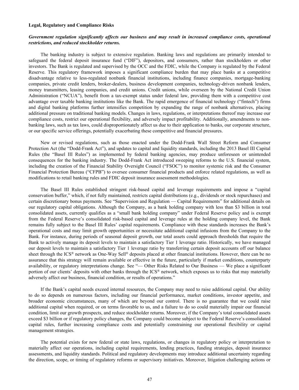 Legal, Regulatory and Compliance Risks Government regulation significantly affects our business and may result in increased compliance costs, operational restrictions, and reduced stockholder returns. The banking industry is subject to extensive regulation. Banking laws and regulations are primarily intended to safeguard the federal deposit insurance fund (“DIF”), depositors, and consumers, rather than stockholders or other investors. The Bank is regulated and supervised by the OCC and the FDIC, while the Company is regulated by the Federal Reserve. This regulatory framework imposes a significant compliance burden that may place banks at a competitive disadvantage relative to less-regulated nonbank financial institutions, including finance companies, mortgage-banking companies, private credit lenders, broker-dealers, business development companies, technology-driven nonbank lenders, money transmitters, leasing companies, and credit unions. Credit unions, while overseen by the National Credit Union Administration (“NCUA”), benefit from a tax-exempt status under federal law, providing them with a competitive cost advantage over taxable banking institutions like the Bank. The rapid emergence of financial technology (“fintech”) firms and digital banking platforms further intensifies competition by expanding the range of nonbank alternatives, placing additional pressure on traditional banking models. Changes in laws, regulations, or interpretations thereof may increase our compliance costs, restrict our operational flexibility, and adversely impact profitability. Additionally, amendments to non- banking laws, such as tax laws, could disproportionately affect us due to their application to banks, our corporate structure, or our specific service offerings, potentially exacerbating these competitive and financial pressures. New or revised regulations, such as those enacted under the Dodd-Frank Wall Street Reform and Consumer Protection Act (the “Dodd-Frank Act”), and updates to capital and liquidity standards, including the 2013 Basel III Capital Rules (the “Basel III Rules”) as implemented by federal banking agencies, may produce unforeseen or unintended consequences for the banking industry. The Dodd-Frank Act introduced sweeping reforms to the U.S. financial system, including the creation of the Financial Stability Oversight Council (“FSOC”) to monitor systemic risk and the Consumer Financial Protection Bureau (“CFPB”) to oversee consumer financial products and enforce related regulations, as well as modifications to retail banking rules and FDIC deposit insurance assessment methodologies. The Basel III Rules established stringent risk-based capital and leverage requirements and impose a “capital conservation buffer,” which, if not fully maintained, restricts capital distributions (e.g., dividends or stock repurchases) and certain discretionary bonus payments. See “Supervision and Regulation — Capital Requirements” for additional details on our regulatory capital obligations. Although the Company, as a bank holding company with less than $3 billion in total consolidated assets, currently qualifies as a “small bank holding company” under Federal Reserve policy and is exempt from the Federal Reserve’s consolidated risk-based capital and leverage rules at the holding company level, the Bank remains fully subject to the Basel III Rules’ capital requirements. Compliance with these standards increases the Bank’s operational costs and may limit growth opportunities or necessitate additional capital infusions from the Company to the Bank. For instance, during periods of seasonal deposit growth, our total assets could approach thresholds that require the Bank to actively manage its deposit levels to maintain a satisfactory Tier 1 leverage ratio. Historically, we have managed our deposit levels to maintain a satisfactory Tier 1 leverage ratio by transferring certain deposit accounts off our balance sheet through the ICS® network as One-Way Sell® deposits placed at other financial institutions. However, there can be no assurance that this strategy will remain available or effective in the future, particularly if market conditions, counterparty availability, or regulatory interpretations change. See “— Other Risks Related to Our Business — We place a significant portion of our clients’ deposits with other banks through the ICS® network, which exposes us to risks that may materially adversely affect our business, financial condition, or results of operations.” If the Bank’s capital needs exceed internal resources, the Company may need to raise additional capital. Our ability to do so depends on numerous factors, including our financial performance, market conditions, investor appetite, and broader economic circumstances, many of which are beyond our control. There is no guarantee that we could raise additional capital when required, or on terms favorable to us, and a failure to do so could materially impair our financial condition, limit our growth prospects, and reduce stockholder returns. Moreover, if the Company’s total consolidated assets exceed $3 billion or if regulatory policy changes, the Company could become subject to the Federal Reserve’s consolidated capital rules, further increasing compliance costs and potentially constraining our operational flexibility or capital management strategies. The potential exists for new federal or state laws, regulations, or changes in regulatory policy or interpretation to materially affect our operations, including capital requirements, lending practices, funding strategies, deposit insurance assessments, and liquidity standards. Political and regulatory developments may introduce additional uncertainty regarding the direction, scope, or timing of regulatory reforms or supervisory initiatives. Moreover, litigation challenging actions or 47