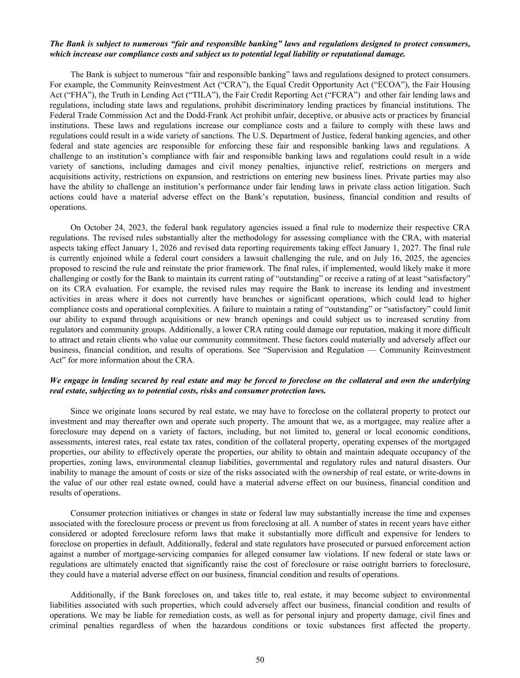 The Bank is subject to numerous “fair and responsible banking” laws and regulations designed to protect consumers, which increase our compliance costs and subject us to potential legal liability or reputational damage. The Bank is subject to numerous “fair and responsible banking” laws and regulations designed to protect consumers. For example, the Community Reinvestment Act (“CRA”), the Equal Credit Opportunity Act (“ECOA”), the Fair Housing Act (“FHA”), the Truth in Lending Act (“TILA”), the Fair Credit Reporting Act (“FCRA”) and other fair lending laws and regulations, including state laws and regulations, prohibit discriminatory lending practices by financial institutions. The Federal Trade Commission Act and the Dodd-Frank Act prohibit unfair, deceptive, or abusive acts or practices by financial institutions. These laws and regulations increase our compliance costs and a failure to comply with these laws and regulations could result in a wide variety of sanctions. The U.S. Department of Justice, federal banking agencies, and other federal and state agencies are responsible for enforcing these fair and responsible banking laws and regulations. A challenge to an institution’s compliance with fair and responsible banking laws and regulations could result in a wide variety of sanctions, including damages and civil money penalties, injunctive relief, restrictions on mergers and acquisitions activity, restrictions on expansion, and restrictions on entering new business lines. Private parties may also have the ability to challenge an institution’s performance under fair lending laws in private class action litigation. Such actions could have a material adverse effect on the Bank’s reputation, business, financial condition and results of operations. On October 24, 2023, the federal bank regulatory agencies issued a final rule to modernize their respective CRA regulations. The revised rules substantially alter the methodology for assessing compliance with the CRA, with material aspects taking effect January 1, 2026 and revised data reporting requirements taking effect January 1, 2027. The final rule is currently enjoined while a federal court considers a lawsuit challenging the rule, and on July 16, 2025, the agencies proposed to rescind the rule and reinstate the prior framework. The final rules, if implemented, would likely make it more challenging or costly for the Bank to maintain its current rating of “outstanding” or receive a rating of at least “satisfactory” on its CRA evaluation. For example, the revised rules may require the Bank to increase its lending and investment activities in areas where it does not currently have branches or significant operations, which could lead to higher compliance costs and operational complexities. A failure to maintain a rating of “outstanding” or “satisfactory” could limit our ability to expand through acquisitions or new branch openings and could subject us to increased scrutiny from regulators and community groups. Additionally, a lower CRA rating could damage our reputation, making it more difficult to attract and retain clients who value our community commitment. These factors could materially and adversely affect our business, financial condition, and results of operations. See “Supervision and Regulation — Community Reinvestment Act” for more information about the CRA. We engage in lending secured by real estate and may be forced to foreclose on the collateral and own the underlying real estate, subjecting us to potential costs, risks and consumer protection laws. Since we originate loans secured by real estate, we may have to foreclose on the collateral property to protect our investment and may thereafter own and operate such property. The amount that we, as a mortgagee, may realize after a foreclosure may depend on a variety of factors, including, but not limited to, general or local economic conditions, assessments, interest rates, real estate tax rates, condition of the collateral property, operating expenses of the mortgaged properties, our ability to effectively operate the properties, our ability to obtain and maintain adequate occupancy of the properties, zoning laws, environmental cleanup liabilities, governmental and regulatory rules and natural disasters. Our inability to manage the amount of costs or size of the risks associated with the ownership of real estate, or write-downs in the value of our other real estate owned, could have a material adverse effect on our business, financial condition and results of operations. Consumer protection initiatives or changes in state or federal law may substantially increase the time and expenses associated with the foreclosure process or prevent us from foreclosing at all. A number of states in recent years have either considered or adopted foreclosure reform laws that make it substantially more difficult and expensive for lenders to foreclose on properties in default. Additionally, federal and state regulators have prosecuted or pursued enforcement action against a number of mortgage-servicing companies for alleged consumer law violations. If new federal or state laws or regulations are ultimately enacted that significantly raise the cost of foreclosure or raise outright barriers to foreclosure, they could have a material adverse effect on our business, financial condition and results of operations. Additionally, if the Bank forecloses on, and takes title to, real estate, it may become subject to environmental liabilities associated with such properties, which could adversely affect our business, financial condition and results of operations. We may be liable for remediation costs, as well as for personal injury and property damage, civil fines and criminal penalties regardless of when the hazardous conditions or toxic substances first affected the property. 50