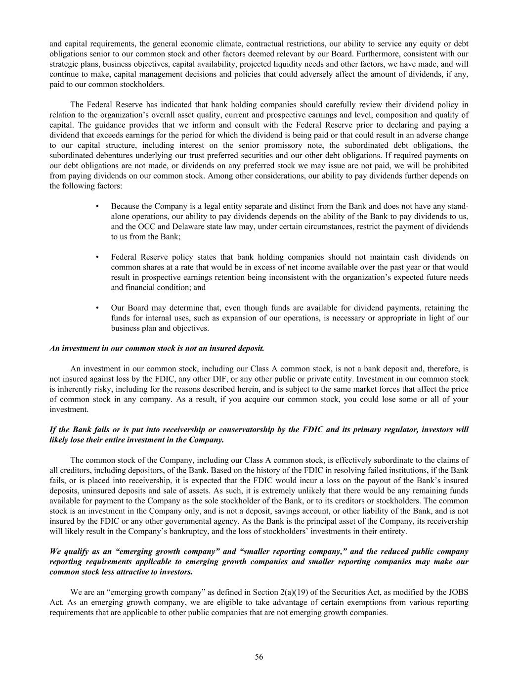 and capital requirements, the general economic climate, contractual restrictions, our ability to service any equity or debt obligations senior to our common stock and other factors deemed relevant by our Board. Furthermore, consistent with our strategic plans, business objectives, capital availability, projected liquidity needs and other factors, we have made, and will continue to make, capital management decisions and policies that could adversely affect the amount of dividends, if any, paid to our common stockholders. The Federal Reserve has indicated that bank holding companies should carefully review their dividend policy in relation to the organization’s overall asset quality, current and prospective earnings and level, composition and quality of capital. The guidance provides that we inform and consult with the Federal Reserve prior to declaring and paying a dividend that exceeds earnings for the period for which the dividend is being paid or that could result in an adverse change to our capital structure, including interest on the senior promissory note, the subordinated debt obligations, the subordinated debentures underlying our trust preferred securities and our other debt obligations. If required payments on our debt obligations are not made, or dividends on any preferred stock we may issue are not paid, we will be prohibited from paying dividends on our common stock. Among other considerations, our ability to pay dividends further depends on the following factors: • Because the Company is a legal entity separate and distinct from the Bank and does not have any stand- alone operations, our ability to pay dividends depends on the ability of the Bank to pay dividends to us, and the OCC and Delaware state law may, under certain circumstances, restrict the payment of dividends to us from the Bank; • Federal Reserve policy states that bank holding companies should not maintain cash dividends on common shares at a rate that would be in excess of net income available over the past year or that would result in prospective earnings retention being inconsistent with the organization’s expected future needs and financial condition; and • Our Board may determine that, even though funds are available for dividend payments, retaining the funds for internal uses, such as expansion of our operations, is necessary or appropriate in light of our business plan and objectives. An investment in our common stock is not an insured deposit. An investment in our common stock, including our Class A common stock, is not a bank deposit and, therefore, is not insured against loss by the FDIC, any other DIF, or any other public or private entity. Investment in our common stock is inherently risky, including for the reasons described herein, and is subject to the same market forces that affect the price of common stock in any company. As a result, if you acquire our common stock, you could lose some or all of your investment. If the Bank fails or is put into receivership or conservatorship by the FDIC and its primary regulator, investors will likely lose their entire investment in the Company. The common stock of the Company, including our Class A common stock, is effectively subordinate to the claims of all creditors, including depositors, of the Bank. Based on the history of the FDIC in resolving failed institutions, if the Bank fails, or is placed into receivership, it is expected that the FDIC would incur a loss on the payout of the Bank’s insured deposits, uninsured deposits and sale of assets. As such, it is extremely unlikely that there would be any remaining funds available for payment to the Company as the sole stockholder of the Bank, or to its creditors or stockholders. The common stock is an investment in the Company only, and is not a deposit, savings account, or other liability of the Bank, and is not insured by the FDIC or any other governmental agency. As the Bank is the principal asset of the Company, its receivership will likely result in the Company’s bankruptcy, and the loss of stockholders’ investments in their entirety. We qualify as an “emerging growth company” and “smaller reporting company,” and the reduced public company reporting requirements applicable to emerging growth companies and smaller reporting companies may make our common stock less attractive to investors. We are an “emerging growth company” as defined in Section 2(a)(19) of the Securities Act, as modified by the JOBS Act. As an emerging growth company, we are eligible to take advantage of certain exemptions from various reporting requirements that are applicable to other public companies that are not emerging growth companies. 56