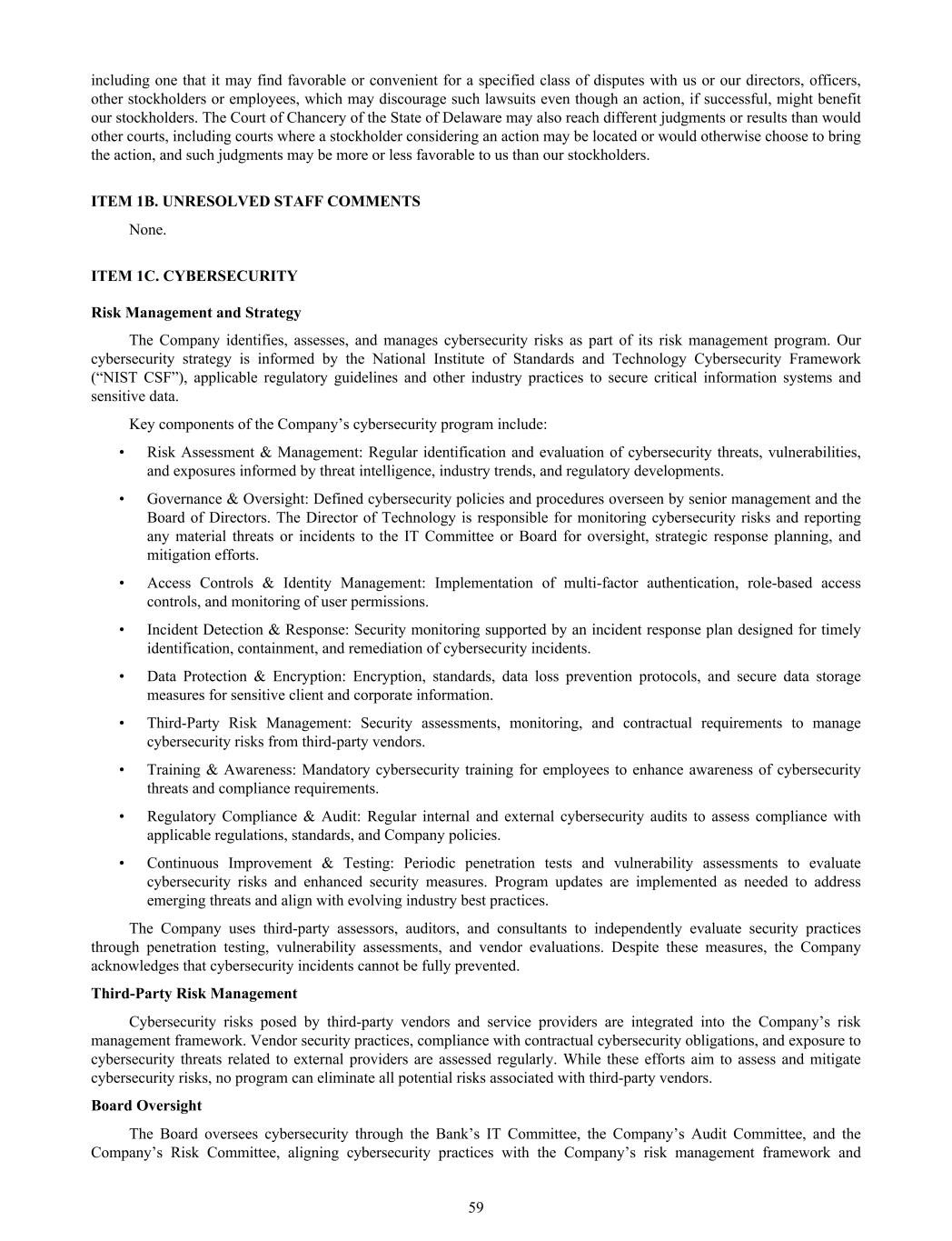 including one that it may find favorable or convenient for a specified class of disputes with us or our directors, officers, other stockholders or employees, which may discourage such lawsuits even though an action, if successful, might benefit our stockholders. The Court of Chancery of the State of Delaware may also reach different judgments or results than would other courts, including courts where a stockholder considering an action may be located or would otherwise choose to bring the action, and such judgments may be more or less favorable to us than our stockholders. ITEM 1B. UNRESOLVED STAFF COMMENTS None. ITEM 1C. CYBERSECURITY Risk Management and Strategy The Company identifies, assesses, and manages cybersecurity risks as part of its risk management program. Our cybersecurity strategy is informed by the National Institute of Standards and Technology Cybersecurity Framework (“NIST CSF”), applicable regulatory guidelines and other industry practices to secure critical information systems and sensitive data. Key components of the Company’s cybersecurity program include: • Risk Assessment & Management: Regular identification and evaluation of cybersecurity threats, vulnerabilities, and exposures informed by threat intelligence, industry trends, and regulatory developments. • Governance & Oversight: Defined cybersecurity policies and procedures overseen by senior management and the Board of Directors. The Director of Technology is responsible for monitoring cybersecurity risks and reporting any material threats or incidents to the IT Committee or Board for oversight, strategic response planning, and mitigation efforts. • Access Controls & Identity Management: Implementation of multi-factor authentication, role-based access controls, and monitoring of user permissions. • Incident Detection & Response: Security monitoring supported by an incident response plan designed for timely identification, containment, and remediation of cybersecurity incidents. • Data Protection & Encryption: Encryption, standards, data loss prevention protocols, and secure data storage measures for sensitive client and corporate information. • Third-Party Risk Management: Security assessments, monitoring, and contractual requirements to manage cybersecurity risks from third-party vendors. • Training & Awareness: Mandatory cybersecurity training for employees to enhance awareness of cybersecurity threats and compliance requirements. • Regulatory Compliance & Audit: Regular internal and external cybersecurity audits to assess compliance with applicable regulations, standards, and Company policies. • Continuous Improvement & Testing: Periodic penetration tests and vulnerability assessments to evaluate cybersecurity risks and enhanced security measures. Program updates are implemented as needed to address emerging threats and align with evolving industry best practices. The Company uses third-party assessors, auditors, and consultants to independently evaluate security practices through penetration testing, vulnerability assessments, and vendor evaluations. Despite these measures, the Company acknowledges that cybersecurity incidents cannot be fully prevented. Third-Party Risk Management Cybersecurity risks posed by third-party vendors and service providers are integrated into the Company’s risk management framework. Vendor security practices, compliance with contractual cybersecurity obligations, and exposure to cybersecurity threats related to external providers are assessed regularly. While these efforts aim to assess and mitigate cybersecurity risks, no program can eliminate all potential risks associated with third-party vendors. Board Oversight The Board oversees cybersecurity through the Bank’s IT Committee, the Company’s Audit Committee, and the Company’s Risk Committee, aligning cybersecurity practices with the Company’s risk management framework and 59
