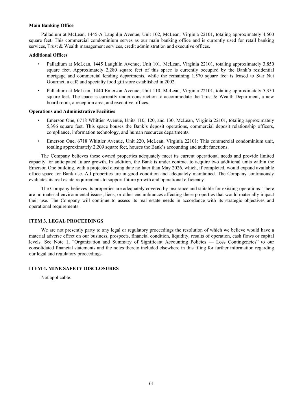 Main Banking Office Palladium at McLean, 1445-A Laughlin Avenue, Unit 102, McLean, Virginia 22101, totaling approximately 4,500 square feet. This commercial condominium serves as our main banking office and is currently used for retail banking services, Trust & Wealth management services, credit administration and executive offices. Additional Offices • Palladium at McLean, 1445 Laughlin Avenue, Unit 101, McLean, Virginia 22101, totaling approximately 3,850 square feet. Approximately 2,280 square feet of this space is currently occupied by the Bank’s residential mortgage and commercial lending departments, while the remaining 1,570 square feet is leased to Star Nut Gourmet, a café and specialty food gift store established in 2002. • Palladium at McLean, 1440 Emerson Avenue, Unit 110, McLean, Virginia 22101, totaling approximately 5,350 square feet. The space is currently under construction to accommodate the Trust & Wealth Department, a new board room, a reception area, and executive offices. Operations and Administrative Facilities • Emerson One, 6718 Whittier Avenue, Units 110, 120, and 130, McLean, Virginia 22101, totaling approximately 5,396 square feet. This space houses the Bank’s deposit operations, commercial deposit relationship officers, compliance, information technology, and human resources departments. • Emerson One, 6718 Whittier Avenue, Unit 220, McLean, Virginia 22101: This commercial condominium unit, totaling approximately 2,209 square feet, houses the Bank’s accounting and audit functions. The Company believes these owned properties adequately meet its current operational needs and provide limited capacity for anticipated future growth. In addition, the Bank is under contract to acquire two additional units within the Emerson One building, with a projected closing date no later than May 2026, which, if completed, would expand available office space for Bank use. All properties are in good condition and adequately maintained. The Company continuously evaluates its real estate requirements to support future growth and operational efficiency. The Company believes its properties are adequately covered by insurance and suitable for existing operations. There are no material environmental issues, liens, or other encumbrances affecting these properties that would materially impact their use. The Company will continue to assess its real estate needs in accordance with its strategic objectives and operational requirements. ITEM 3. LEGAL PROCEEDINGS We are not presently party to any legal or regulatory proceedings the resolution of which we believe would have a material adverse effect on our business, prospects, financial condition, liquidity, results of operation, cash flows or capital levels. See Note 1, “Organization and Summary of Significant Accounting Policies — Loss Contingencies” to our consolidated financial statements and the notes thereto included elsewhere in this filing for further information regarding our legal and regulatory proceedings. ITEM 4. MINE SAFETY DISCLOSURES Not applicable. 61