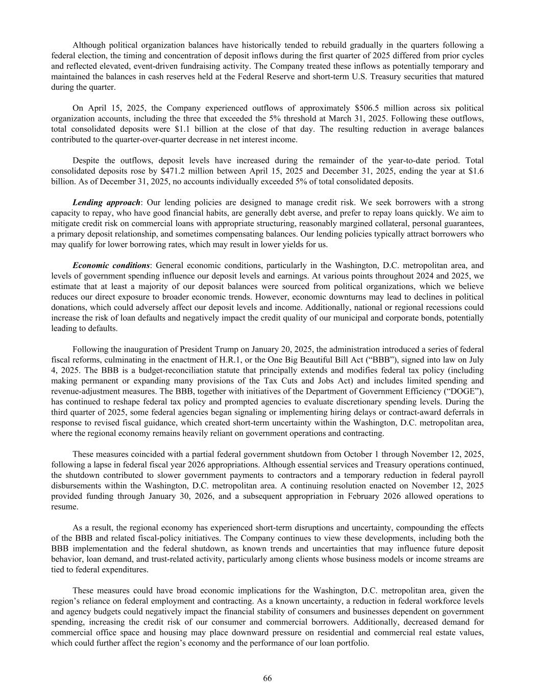 Although political organization balances have historically tended to rebuild gradually in the quarters following a federal election, the timing and concentration of deposit inflows during the first quarter of 2025 differed from prior cycles and reflected elevated, event-driven fundraising activity. The Company treated these inflows as potentially temporary and maintained the balances in cash reserves held at the Federal Reserve and short-term U.S. Treasury securities that matured during the quarter. On April 15, 2025, the Company experienced outflows of approximately $506.5 million across six political organization accounts, including the three that exceeded the 5% threshold at March 31, 2025. Following these outflows, total consolidated deposits were $1.1 billion at the close of that day. The resulting reduction in average balances contributed to the quarter-over-quarter decrease in net interest income. Despite the outflows, deposit levels have increased during the remainder of the year-to-date period. Total consolidated deposits rose by $471.2 million between April 15, 2025 and December 31, 2025, ending the year at $1.6 billion. As of December 31, 2025, no accounts individually exceeded 5% of total consolidated deposits. Lending approach: Our lending policies are designed to manage credit risk. We seek borrowers with a strong capacity to repay, who have good financial habits, are generally debt averse, and prefer to repay loans quickly. We aim to mitigate credit risk on commercial loans with appropriate structuring, reasonably margined collateral, personal guarantees, a primary deposit relationship, and sometimes compensating balances. Our lending policies typically attract borrowers who may qualify for lower borrowing rates, which may result in lower yields for us. Economic conditions: General economic conditions, particularly in the Washington, D.C. metropolitan area, and levels of government spending influence our deposit levels and earnings. At various points throughout 2024 and 2025, we estimate that at least a majority of our deposit balances were sourced from political organizations, which we believe reduces our direct exposure to broader economic trends. However, economic downturns may lead to declines in political donations, which could adversely affect our deposit levels and income. Additionally, national or regional recessions could increase the risk of loan defaults and negatively impact the credit quality of our municipal and corporate bonds, potentially leading to defaults. Following the inauguration of President Trump on January 20, 2025, the administration introduced a series of federal fiscal reforms, culminating in the enactment of H.R.1, or the One Big Beautiful Bill Act (“BBB”), signed into law on July 4, 2025. The BBB is a budget-reconciliation statute that principally extends and modifies federal tax policy (including making permanent or expanding many provisions of the Tax Cuts and Jobs Act) and includes limited spending and revenue-adjustment measures. The BBB, together with initiatives of the Department of Government Efficiency (“DOGE”), has continued to reshape federal tax policy and prompted agencies to evaluate discretionary spending levels. During the third quarter of 2025, some federal agencies began signaling or implementing hiring delays or contract-award deferrals in response to revised fiscal guidance, which created short-term uncertainty within the Washington, D.C. metropolitan area, where the regional economy remains heavily reliant on government operations and contracting. These measures coincided with a partial federal government shutdown from October 1 through November 12, 2025, following a lapse in federal fiscal year 2026 appropriations. Although essential services and Treasury operations continued, the shutdown contributed to slower government payments to contractors and a temporary reduction in federal payroll disbursements within the Washington, D.C. metropolitan area. A continuing resolution enacted on November 12, 2025 provided funding through January 30, 2026, and a subsequent appropriation in February 2026 allowed operations to resume. As a result, the regional economy has experienced short-term disruptions and uncertainty, compounding the effects of the BBB and related fiscal-policy initiatives. The Company continues to view these developments, including both the BBB implementation and the federal shutdown, as known trends and uncertainties that may influence future deposit behavior, loan demand, and trust-related activity, particularly among clients whose business models or income streams are tied to federal expenditures. These measures could have broad economic implications for the Washington, D.C. metropolitan area, given the region’s reliance on federal employment and contracting. As a known uncertainty, a reduction in federal workforce levels and agency budgets could negatively impact the financial stability of consumers and businesses dependent on government spending, increasing the credit risk of our consumer and commercial borrowers. Additionally, decreased demand for commercial office space and housing may place downward pressure on residential and commercial real estate values, which could further affect the region’s economy and the performance of our loan portfolio. 66