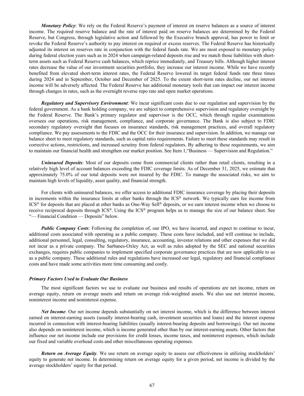 Monetary Policy: We rely on the Federal Reserve’s payment of interest on reserve balances as a source of interest income. The required reserve balance and the rate of interest paid on reserve balances are determined by the Federal Reserve, but Congress, through legislative action and followed by the Executive branch approval, has power to limit or revoke the Federal Reserve’s authority to pay interest on required or excess reserves. The Federal Reserve has historically adjusted its interest on reserves rate in conjunction with the federal funds rate. We are most exposed to monetary policy during federal election years such as in 2024 when campaign-related deposits rise and we match those liabilities with short- term assets such as Federal Reserve cash balances, which reprice immediately, and Treasury bills. Although higher interest rates decrease the value of our investment securities portfolio, they increase our interest income. While we have recently benefited from elevated short-term interest rates, the Federal Reserve lowered its target federal funds rate three times during 2024 and in September, October and December of 2025. To the extent short-term rates decline, our net interest income will be adversely affected. The Federal Reserve has additional monetary tools that can impact our interest income through changes in rates, such as the overnight reverse repo rate and open market operations. Regulatory and Supervisory Environment: We incur significant costs due to our regulation and supervision by the federal government. As a bank holding company, we are subject to comprehensive supervision and regulatory oversight by the Federal Reserve. The Bank’s primary regulator and supervisor is the OCC, which through regular examinations oversees our operations, risk management, compliance, and corporate governance. The Bank is also subject to FDIC secondary regulatory oversight that focuses on insurance standards, risk management practices, and overall regulatory compliance. We pay assessments to the FDIC and the OCC for their insurance and supervision. In addition, we manage our balance sheet to meet regulatory standards, such as capital ratio requirements. Failure to meet these standards may result in corrective actions, restrictions, and increased scrutiny from federal regulators. By adhering to these requirements, we aim to maintain our financial health and strengthen our market position. See Item 1,“Business — Supervision and Regulation.” Uninsured Deposits: Most of our deposits come from commercial clients rather than retail clients, resulting in a relatively high level of account balances exceeding the FDIC coverage limits. As of December 31, 2025, we estimate that approximately 75.0% of our total deposits were not insured by the FDIC. To manage the associated risks, we aim to maintain high levels of liquidity, asset quality, and financial strength. For clients with uninsured balances, we offer access to additional FDIC insurance coverage by placing their deposits in increments within the insurance limits at other banks through the ICS® network. We typically earn fee income from ICS® for deposits that are placed at other banks as One-Way Sell® deposits, or we earn interest income when we choose to receive reciprocal deposits through ICS®. Using the ICS® program helps us to manage the size of our balance sheet. See “— Financial Condition — Deposits” below. Public Company Costs: Following the completion of, our IPO, we have incurred, and expect to continue to incur, additional costs associated with operating as a public company. These costs have included, and will continue to include, additional personnel, legal, consulting, regulatory, insurance, accounting, investor relations and other expenses that we did not incur as a private company. The Sarbanes-Oxley Act, as well as rules adopted by the SEC and national securities exchanges, requires public companies to implement specified corporate governance practices that are now applicable to us as a public company. These additional rules and regulations have increased our legal, regulatory and financial compliance costs and have made some activities more time consuming and costly. Primary Factors Used to Evaluate Our Business The most significant factors we use to evaluate our business and results of operations are net income, return on average equity, return on average assets and return on average risk-weighted assets. We also use net interest income, noninterest income and noninterest expense. Net Income. Our net income depends substantially on net interest income, which is the difference between interest earned on interest-earning assets (usually interest-bearing cash, investment securities and loans) and the interest expense incurred in connection with interest-bearing liabilities (usually interest-bearing deposits and borrowings). Our net income also depends on noninterest income, which is income generated other than by our interest-earning assets. Other factors that influence our net income include our provisions for credit losses, income taxes, and noninterest expenses, which include our fixed and variable overhead costs and other miscellaneous operating expenses. Return on Average Equity. We use return on average equity to assess our effectiveness in utilizing stockholders’ equity to generate net income. In determining return on average equity for a given period, net income is divided by the average stockholders’ equity for that period. 67