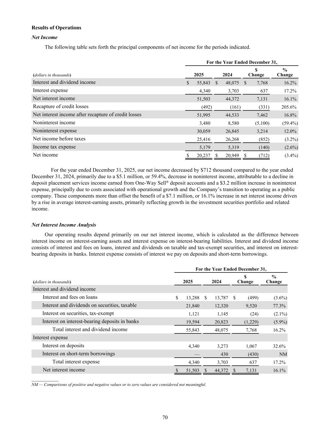 Results of Operations Net Income The following table sets forth the principal components of net income for the periods indicated. For the Year Ended December 31, (dollars in thousands) 2025 2024 $ Change % Change Interest and dividend income $ 55,843 $ 48,075 $ 7,768 16.2% Interest expense 4,340 3,703 637 17.2% Net interest income 51,503 44,372 7,131 16.1% Recapture of credit losses (492) (161) (331) 205.6% Net interest income after recapture of credit losses 51,995 44,533 7,462 16.8% Noninterest income 3,480 8,580 (5,100) (59.4%) Noninterest expense 30,059 26,845 3,214 12.0% Net income before taxes 25,416 26,268 (852) (3.2%) Income tax expense 5,179 5,319 (140) (2.6%) Net income $ 20,237 $ 20,949 $ (712) (3.4%) For the year ended December 31, 2025, our net income decreased by $712 thousand compared to the year ended December 31, 2024, primarily due to a $5.1 million, or 59.4%, decrease in noninterest income, attributable to a decline in deposit placement services income earned from One-Way Sell® deposit accounts and a $3.2 million increase in noninterest expense, principally due to costs associated with operational growth and the Company’s transition to operating as a public company. These components more than offset the benefit of a $7.1 million, or 16.1% increase in net interest income driven by a rise in average interest-earning assets, primarily reflecting growth in the investment securities portfolio and related income. Net Interest Income Analysis Our operating results depend primarily on our net interest income, which is calculated as the difference between interest income on interest-earning assets and interest expense on interest-bearing liabilities. Interest and dividend income consists of interest and fees on loans, interest and dividends on taxable and tax-exempt securities, and interest on interest- bearing deposits in banks. Interest expense consists of interest we pay on deposits and short-term borrowings. For the Year Ended December 31, (dollars in thousands) 2025 2024 $ Change % Change Interest and dividend income Interest and fees on loans $ 13,288 $ 13,787 $ (499) (3.6%) Interest and dividends on securities, taxable 21,840 12,320 9,520 77.3% Interest on securities, tax-exempt 1,121 1,145 (24) (2.1%) Interest on interest-bearing deposits in banks 19,594 20,823 (1,229) (5.9%) Total interest and dividend income 55,843 48,075 7,768 16.2% Interest expense Interest on deposits 4,340 3,273 1,067 32.6% Interest on short-term borrowings — 430 (430) NM Total interest expense 4,340 3,703 637 17.2% Net interest income $ 51,503 $ 44,372 $ 7,131 16.1% __________ NM — Comparisons of positive and negative values or to zero values are considered not meaningful. 70