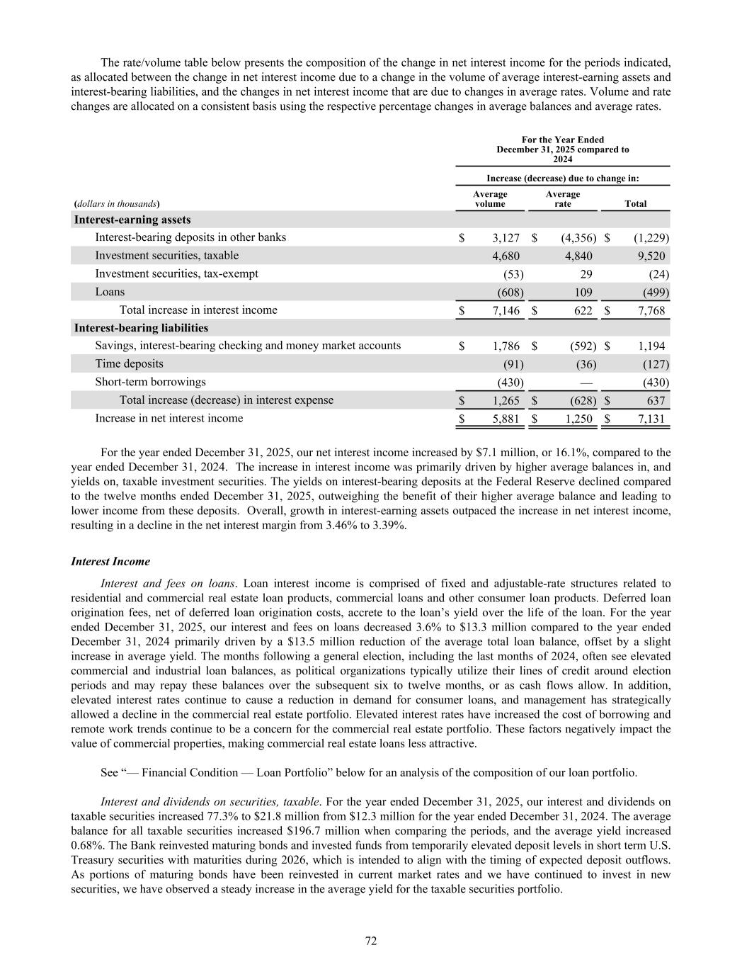 The rate/volume table below presents the composition of the change in net interest income for the periods indicated, as allocated between the change in net interest income due to a change in the volume of average interest-earning assets and interest-bearing liabilities, and the changes in net interest income that are due to changes in average rates. Volume and rate changes are allocated on a consistent basis using the respective percentage changes in average balances and average rates. For the Year Ended December 31, 2025 compared to 2024 Increase (decrease) due to change in: (dollars in thousands) Average volume Average rate Total Interest-earning assets Interest-bearing deposits in other banks $ 3,127 $ (4,356) $ (1,229) Investment securities, taxable 4,680 4,840 9,520 Investment securities, tax-exempt (53) 29 (24) Loans (608) 109 (499) Total increase in interest income $ 7,146 $ 622 $ 7,768 Interest-bearing liabilities Savings, interest-bearing checking and money market accounts $ 1,786 $ (592) $ 1,194 Time deposits (91) (36) (127) Short-term borrowings (430) — (430) Total increase (decrease) in interest expense $ 1,265 $ (628) $ 637 Increase in net interest income $ 5,881 $ 1,250 $ 7,131 For the year ended December 31, 2025, our net interest income increased by $7.1 million, or 16.1%, compared to the year ended December 31, 2024. The increase in interest income was primarily driven by higher average balances in, and yields on, taxable investment securities. The yields on interest-bearing deposits at the Federal Reserve declined compared to the twelve months ended December 31, 2025, outweighing the benefit of their higher average balance and leading to lower income from these deposits. Overall, growth in interest-earning assets outpaced the increase in net interest income, resulting in a decline in the net interest margin from 3.46% to 3.39%. Interest Income Interest and fees on loans. Loan interest income is comprised of fixed and adjustable-rate structures related to residential and commercial real estate loan products, commercial loans and other consumer loan products. Deferred loan origination fees, net of deferred loan origination costs, accrete to the loan’s yield over the life of the loan. For the year ended December 31, 2025, our interest and fees on loans decreased 3.6% to $13.3 million compared to the year ended December 31, 2024 primarily driven by a $13.5 million reduction of the average total loan balance, offset by a slight increase in average yield. The months following a general election, including the last months of 2024, often see elevated commercial and industrial loan balances, as political organizations typically utilize their lines of credit around election periods and may repay these balances over the subsequent six to twelve months, or as cash flows allow. In addition, elevated interest rates continue to cause a reduction in demand for consumer loans, and management has strategically allowed a decline in the commercial real estate portfolio. Elevated interest rates have increased the cost of borrowing and remote work trends continue to be a concern for the commercial real estate portfolio. These factors negatively impact the value of commercial properties, making commercial real estate loans less attractive. See “— Financial Condition — Loan Portfolio” below for an analysis of the composition of our loan portfolio. Interest and dividends on securities, taxable. For the year ended December 31, 2025, our interest and dividends on taxable securities increased 77.3% to $21.8 million from $12.3 million for the year ended December 31, 2024. The average balance for all taxable securities increased $196.7 million when comparing the periods, and the average yield increased 0.68%. The Bank reinvested maturing bonds and invested funds from temporarily elevated deposit levels in short term U.S. Treasury securities with maturities during 2026, which is intended to align with the timing of expected deposit outflows. As portions of maturing bonds have been reinvested in current market rates and we have continued to invest in new securities, we have observed a steady increase in the average yield for the taxable securities portfolio. 72