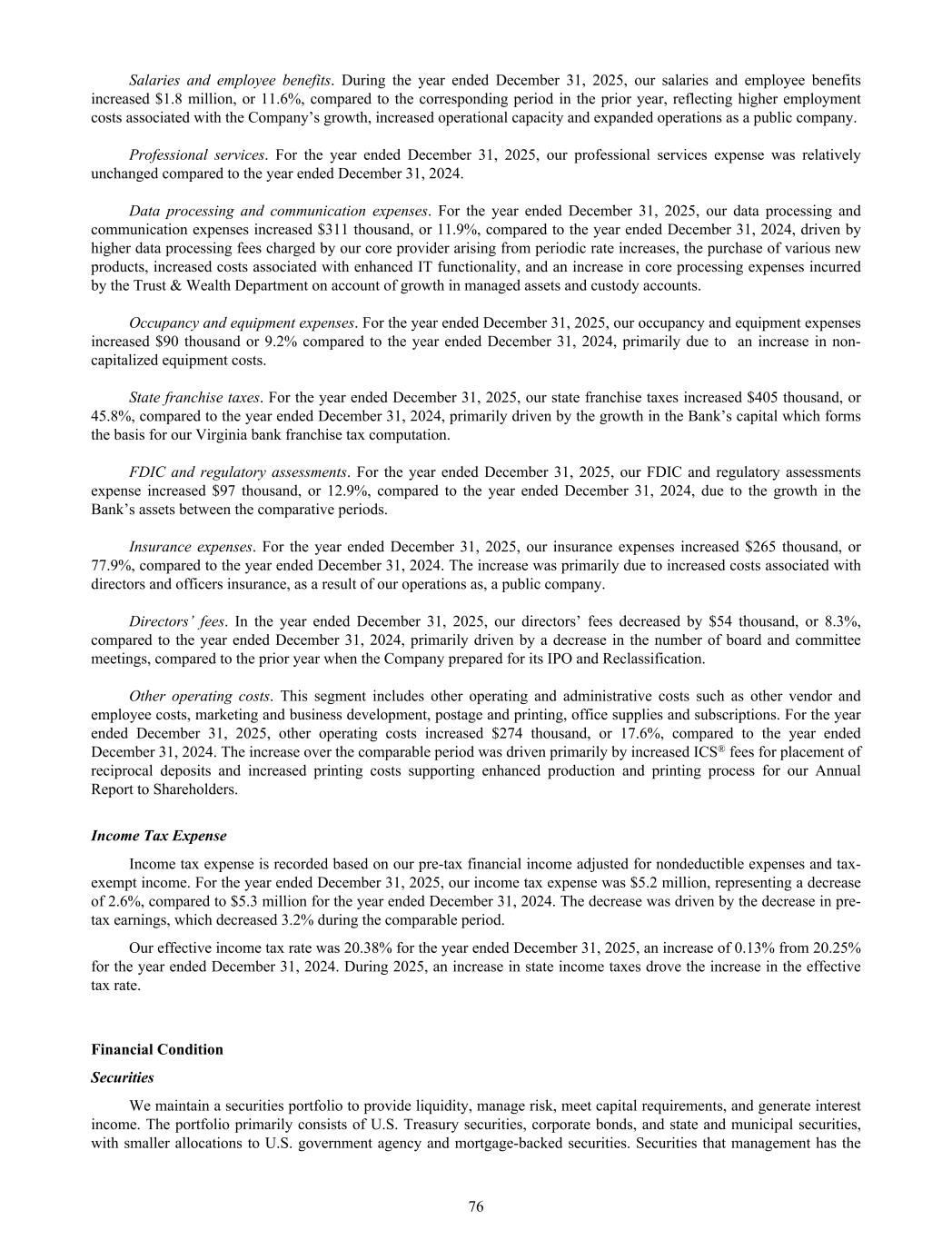 Salaries and employee benefits. During the year ended December 31, 2025, our salaries and employee benefits increased $1.8 million, or 11.6%, compared to the corresponding period in the prior year, reflecting higher employment costs associated with the Company’s growth, increased operational capacity and expanded operations as a public company. Professional services. For the year ended December 31, 2025, our professional services expense was relatively unchanged compared to the year ended December 31, 2024. Data processing and communication expenses. For the year ended December 31, 2025, our data processing and communication expenses increased $311 thousand, or 11.9%, compared to the year ended December 31, 2024, driven by higher data processing fees charged by our core provider arising from periodic rate increases, the purchase of various new products, increased costs associated with enhanced IT functionality, and an increase in core processing expenses incurred by the Trust & Wealth Department on account of growth in managed assets and custody accounts. Occupancy and equipment expenses. For the year ended December 31, 2025, our occupancy and equipment expenses increased $90 thousand or 9.2% compared to the year ended December 31, 2024, primarily due to an increase in non- capitalized equipment costs. State franchise taxes. For the year ended December 31, 2025, our state franchise taxes increased $405 thousand, or 45.8%, compared to the year ended December 31, 2024, primarily driven by the growth in the Bank’s capital which forms the basis for our Virginia bank franchise tax computation. FDIC and regulatory assessments. For the year ended December 31, 2025, our FDIC and regulatory assessments expense increased $97 thousand, or 12.9%, compared to the year ended December 31, 2024, due to the growth in the Bank’s assets between the comparative periods. Insurance expenses. For the year ended December 31, 2025, our insurance expenses increased $265 thousand, or 77.9%, compared to the year ended December 31, 2024. The increase was primarily due to increased costs associated with directors and officers insurance, as a result of our operations as, a public company. Directors’ fees. In the year ended December 31, 2025, our directors’ fees decreased by $54 thousand, or 8.3%, compared to the year ended December 31, 2024, primarily driven by a decrease in the number of board and committee meetings, compared to the prior year when the Company prepared for its IPO and Reclassification. Other operating costs. This segment includes other operating and administrative costs such as other vendor and employee costs, marketing and business development, postage and printing, office supplies and subscriptions. For the year ended December 31, 2025, other operating costs increased $274 thousand, or 17.6%, compared to the year ended December 31, 2024. The increase over the comparable period was driven primarily by increased ICS® fees for placement of reciprocal deposits and increased printing costs supporting enhanced production and printing process for our Annual Report to Shareholders. Income Tax Expense Income tax expense is recorded based on our pre-tax financial income adjusted for nondeductible expenses and tax- exempt income. For the year ended December 31, 2025, our income tax expense was $5.2 million, representing a decrease of 2.6%, compared to $5.3 million for the year ended December 31, 2024. The decrease was driven by the decrease in pre- tax earnings, which decreased 3.2% during the comparable period. Our effective income tax rate was 20.38% for the year ended December 31, 2025, an increase of 0.13% from 20.25% for the year ended December 31, 2024. During 2025, an increase in state income taxes drove the increase in the effective tax rate. Financial Condition Securities We maintain a securities portfolio to provide liquidity, manage risk, meet capital requirements, and generate interest income. The portfolio primarily consists of U.S. Treasury securities, corporate bonds, and state and municipal securities, with smaller allocations to U.S. government agency and mortgage-backed securities. Securities that management has the 76
