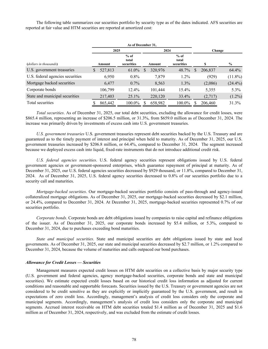 The following table summarizes our securities portfolio by security type as of the dates indicated. AFS securities are reported at fair value and HTM securities are reported at amortized cost: As of December 31, 2025 2024 Change (dollars in thousands) Amount % of total securities Amount % of total securities $ % U.S. government treasuries $ 527,813 61.0% $ 320,976 48.7% $ 206,837 64.4% U.S. federal agencies securities 6,950 0.8% 7,879 1.2% (929) (11.8%) Mortgage backed securities 6,477 0.7% 8,563 1.3% (2,086) (24.4%) Corporate bonds 106,799 12.4% 101,444 15.4% 5,355 5.3% State and municipal securities 217,403 25.1% 220,120 33.4% (2,717) (1.2%) Total securities $ 865,442 100.0% $ 658,982 100.0% $ 206,460 31.3% Total securities. As of December 31, 2025, our total debt securities, excluding the allowance for credit losses, were $865.4 million, representing an increase of $206.5 million, or 31.3%, from $659.0 million as of December 31, 2024. The increase was primarily driven by investments of excess cash into U.S. government treasuries. U.S. government treasuries U.S. government treasuries represent debt securities backed by the U.S. Treasury and are guaranteed as to the timely payment of interest and principal when held to maturity. As of December 31, 2025, our U.S. government treasuries increased by $206.8 million, or 64.4%, compared to December 31, 2024. The segment increased because we deployed excess cash into liquid, fixed-rate instruments that do not introduce additional credit risk. U.S. federal agencies securities. U.S. federal agency securities represent obligations issued by U.S. federal government agencies or government-sponsored enterprises, which guarantee repayment of principal at maturity. As of December 31, 2025, our U.S. federal agencies securities decreased by $929 thousand, or 11.8%, compared to December 31, 2024. As of December 31, 2025, U.S. federal agency securities decreased to 0.8% of our securities portfolio due to a security call and maturities. Mortgage-backed securities. Our mortgage-backed securities portfolio consists of pass-through and agency-issued collateralized mortgage obligations. As of December 31, 2025, our mortgage-backed securities decreased by $2.1 million, or 24.4%, compared to December 31, 2024. At December 31, 2025, mortgage-backed securities represented 0.7% of our securities portfolio. Corporate bonds. Corporate bonds are debt obligations issued by companies to raise capital and refinance obligations of the issuer. As of December 31, 2025, our corporate bonds increased by $5.4 million, or 5.3%, compared to December 31, 2024, due to purchases exceeding bond maturities. State and municipal securities. State and municipal securities are debt obligations issued by state and local governments. As of December 31, 2025, our state and municipal securities decreased by $2.7 million, or 1.2% compared to December 31, 2024, because the volume of maturities and calls outpaced our bond purchases. Allowance for Credit Losses — Securities Management measures expected credit losses on HTM debt securities on a collective basis by major security type (U.S. government and federal agencies, agency mortgage-backed securities, corporate bonds and state and municipal securities). We estimate expected credit losses based on our historical credit loss information as adjusted for current conditions and reasonable and supportable forecasts. Securities issued by the U.S. Treasury or government agencies are not considered to be credit sensitive as they are explicitly or implicitly guaranteed by the U.S. government, and result in expectations of zero credit loss. Accordingly, management’s analysis of credit loss considers only the corporate and municipal segments. Accordingly, management’s analysis of credit loss considers only the corporate and municipal segments. Accrued interest receivable on HTM debt securities totaled $1.4 million as of December 31, 2025 and $1.6 million as of December 31, 2024, respectively, and was excluded from the estimate of credit losses. 78