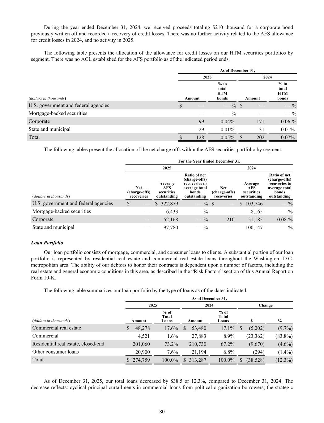 During the year ended December 31, 2024, we received proceeds totaling $210 thousand for a corporate bond previously written off and recorded a recovery of credit losses. There was no further activity related to the AFS allowance for credit losses in 2024, and no activity in 2025. The following table presents the allocation of the allowance for credit losses on our HTM securities portfolios by segment. There was no ACL established for the AFS portfolio as of the indicated period ends. As of December 31, 2025 2024 (dollars in thousands) Amount % to total HTM bonds Amount % to total HTM bonds U.S. government and federal agencies $ — — % $ — — % Mortgage-backed securities — — % — — % Corporate 99 0.04% 171 0.06 % State and municipal 29 0.01% 31 0.01% Total $ 128 0.05% $ 202 0.07% The following tables present the allocation of the net charge offs within the AFS securities portfolio by segment. For the Year Ended December 31, 2025 2024 (dollars in thousands) Net (charge-offs) recoveries Average AFS securities outstanding Ratio of net (charge-offs) recoveries to average total bonds outstanding Net (charge-offs) recoveries Average AFS securities outstanding Ratio of net (charge-offs) recoveries to average total bonds outstanding U.S. government and federal agencies $ — $ 322,879 — % $ — $ 103,746 — % Mortgage-backed securities — 6,433 — % — 8,165 — % Corporate — 52,168 — % 210 51,185 0.08 % State and municipal — 97,780 — % — 100,147 — % Loan Portfolio Our loan portfolio consists of mortgage, commercial, and consumer loans to clients. A substantial portion of our loan portfolio is represented by residential real estate and commercial real estate loans throughout the Washington, D.C. metropolitan area. The ability of our debtors to honor their contracts is dependent upon a number of factors, including the real estate and general economic conditions in this area, as described in the “Risk Factors” section of this Annual Report on Form 10-K. The following table summarizes our loan portfolio by the type of loans as of the dates indicated: As of December 31, 2025 2024 Change (dollars in thousands) Amount % of Total Loans Amount % of Total Loans $ % Commercial real estate $ 48,278 17.6% $ 53,480 17.1% $ (5,202) (9.7%) Commercial 4,521 1.6% 27,883 8.9% (23,362) (83.8%) Residential real estate, closed-end 201,060 73.2% 210,730 67.2% (9,670) (4.6%) Other consumer loans 20,900 7.6% 21,194 6.8% (294) (1.4%) Total $ 274,759 100.0% $ 313,287 100.0% $ (38,528) (12.3%) As of December 31, 2025, our total loans decreased by $38.5 or 12.3%, compared to December 31, 2024. The decrease reflects: cyclical principal curtailments in commercial loans from political organization borrowers; the strategic 80