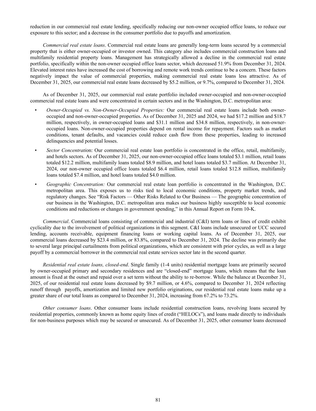 reduction in our commercial real estate lending, specifically reducing our non-owner occupied office loans, to reduce our exposure to this sector; and a decrease in the consumer portfolio due to payoffs and amortization. Commercial real estate loans. Commercial real estate loans are generally long-term loans secured by a commercial property that is either owner-occupied or investor owned. This category also includes commercial construction loans and multifamily residential property loans. Management has strategically allowed a decline in the commercial real estate portfolio, specifically within the non-owner occupied office loans sector, which decreased 51.9% from December 31, 2024. Elevated interest rates have increased the cost of borrowing and remote work trends continue to be a concern. These factors negatively impact the value of commercial properties, making commercial real estate loans less attractive. As of December 31, 2025, our commercial real estate loans decreased by $5.2 million, or 9.7%, compared to December 31, 2024. As of December 31, 2025, our commercial real estate portfolio included owner-occupied and non-owner-occupied commercial real estate loans and were concentrated in certain sectors and in the Washington, D.C. metropolitan area: • Owner-Occupied vs. Non-Owner-Occupied Properties: Our commercial real estate loans include both owner- occupied and non-owner-occupied properties. As of December 31, 2025 and 2024, we had $17.2 million and $18.7 million, respectively, in owner-occupied loans and $31.1 million and $34.8 million, respectively, in non-owner- occupied loans. Non-owner-occupied properties depend on rental income for repayment. Factors such as market conditions, tenant defaults, and vacancies could reduce cash flow from these properties, leading to increased delinquencies and potential losses. • Sector Concentration: Our commercial real estate loan portfolio is concentrated in the office, retail, multifamily, and hotels sectors. As of December 31, 2025, our non-owner-occupied office loans totaled $3.1 million, retail loans totaled $12.2 million, multifamily loans totaled $8.9 million, and hotel loans totaled $3.7 million. At December 31, 2024, our non-owner occupied office loans totaled $6.4 million, retail loans totaled $12.8 million, multifamily loans totaled $7.4 million, and hotel loans totaled $4.0 million. • Geographic Concentration: Our commercial real estate loan portfolio is concentrated in the Washington, D.C. metropolitan area. This exposes us to risks tied to local economic conditions, property market trends, and regulatory changes. See “Risk Factors — Other Risks Related to Our Business — The geographic concentration of our business in the Washington, D.C. metropolitan area makes our business highly susceptible to local economic conditions and reductions or changes in government spending,” in this Annual Report on Form 10-K. Commercial. Commercial loans consisting of commercial and industrial (C&I) term loans or lines of credit exhibit cyclicality due to the involvement of political organizations in this segment. C&I loans include unsecured or UCC secured lending, accounts receivable, equipment financing loans or working capital loans. As of December 31, 2025, our commercial loans decreased by $23.4 million, or 83.8%, compared to December 31, 2024. The decline was primarily due to several large principal curtailments from political organizations, which are consistent with prior cycles, as well as a large payoff by a commercial borrower in the commercial real estate services sector late in the second quarter. Residential real estate loans, closed-end. Single family (1-4 units) residential mortgage loans are primarily secured by owner-occupied primary and secondary residences and are “closed-end” mortgage loans, which means that the loan amount is fixed at the outset and repaid over a set term without the ability to re-borrow. While the balance at December 31, 2025, of our residential real estate loans decreased by $9.7 million, or 4.6%, compared to December 31, 2024 reflecting runoff through payoffs, amortization and limited new portfolio originations, our residential real estate loans make up a greater share of our total loans as compared to December 31, 2024, increasing from 67.2% to 73.2%. Other consumer loans. Other consumer loans include residential construction loans, revolving loans secured by residential properties, commonly known as home equity lines of credit (“HELOCs”), and loans made directly to individuals for non-business purposes which may be secured or unsecured. As of December 31, 2025, other consumer loans decreased 81
