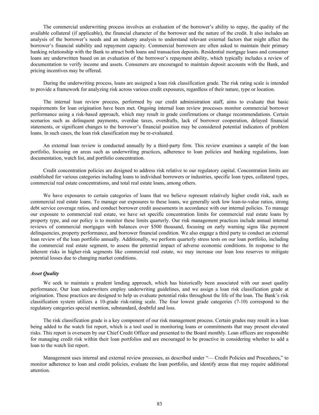 The commercial underwriting process involves an evaluation of the borrower’s ability to repay, the quality of the available collateral (if applicable), the financial character of the borrower and the nature of the credit. It also includes an analysis of the borrower’s needs and an industry analysis to understand relevant external factors that might affect the borrower’s financial stability and repayment capacity. Commercial borrowers are often asked to maintain their primary banking relationship with the Bank to attract both loans and transaction deposits. Residential mortgage loans and consumer loans are underwritten based on an evaluation of the borrower’s repayment ability, which typically includes a review of documentation to verify income and assets. Consumers are encouraged to maintain deposit accounts with the Bank, and pricing incentives may be offered. During the underwriting process, loans are assigned a loan risk classification grade. The risk rating scale is intended to provide a framework for analyzing risk across various credit exposures, regardless of their nature, type or location. The internal loan review process, performed by our credit administration staff, aims to evaluate that basic requirements for loan origination have been met. Ongoing internal loan review processes monitor commercial borrower performance using a risk-based approach, which may result in grade confirmations or change recommendations. Certain scenarios such as delinquent payments, overdue taxes, overdrafts, lack of borrower cooperation, delayed financial statements, or significant changes to the borrower’s financial position may be considered potential indicators of problem loans. In such cases, the loan risk classification may be re-evaluated. An external loan review is conducted annually by a third-party firm. This review examines a sample of the loan portfolio, focusing on areas such as underwriting practices, adherence to loan policies and banking regulations, loan documentation, watch list, and portfolio concentration. Credit concentration policies are designed to address risk relative to our regulatory capital. Concentration limits are established for various categories including loans to individual borrowers or industries, specific loan types, collateral types, commercial real estate concentrations, and total real estate loans, among others. We have exposures to certain categories of loans that we believe represent relatively higher credit risk, such as commercial real estate loans. To manage our exposures to these loans, we generally seek low loan-to-value ratios, strong debt service coverage ratios, and conduct borrower credit assessments in accordance with our internal policies. To manage our exposure to commercial real estate, we have set specific concentration limits for commercial real estate loans by property type, and our policy is to monitor these limits quarterly. Our risk management practices include annual internal reviews of commercial mortgages with balances over $500 thousand, focusing on early warning signs like payment delinquencies, property performance, and borrower financial condition. We also engage a third party to conduct an external loan review of the loan portfolio annually. Additionally, we perform quarterly stress tests on our loan portfolio, including the commercial real estate segment, to assess the potential impact of adverse economic conditions. In response to the inherent risks in higher-risk segments like commercial real estate, we may increase our loan loss reserves to mitigate potential losses due to changing market conditions. Asset Quality We seek to maintain a prudent lending approach, which has historically been associated with our asset quality performance. Our loan underwriters employ underwriting guidelines, and we assign a loan risk classification grade at origination. These practices are designed to help us evaluate potential risks throughout the life of the loan. The Bank’s risk classification system utilizes a 10-grade risk-rating scale. The four lowest grade categories (7-10) correspond to the regulatory categories special mention, substandard, doubtful and loss. The risk classification grade is a key component of our risk management process. Certain grades may result in a loan being added to the watch list report, which is a tool used in monitoring loans or commitments that may present elevated risks. This report is overseen by our Chief Credit Officer and presented to the Board monthly. Loan officers are responsible for managing credit risk within their loan portfolios and are encouraged to be proactive in considering whether to add a loan to the watch list report. Management uses internal and external review processes, as described under “— Credit Policies and Procedures,” to monitor adherence to loan and credit policies, evaluate the loan portfolio, and identify areas that may require additional attention. 83