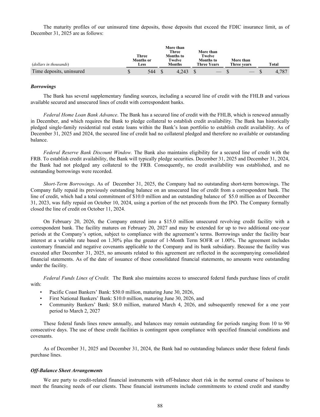 The maturity profiles of our uninsured time deposits, those deposits that exceed the FDIC insurance limit, as of December 31, 2025 are as follows: (dollars in thousands) Three Months or Less More than Three Months to Twelve Months More than Twelve Months to Three Years More than Three years Total Time deposits, uninsured $ 544 $ 4,243 $ — $ — $ 4,787 Borrowings The Bank has several supplementary funding sources, including a secured line of credit with the FHLB and various available secured and unsecured lines of credit with correspondent banks. Federal Home Loan Bank Advance. The Bank has a secured line of credit with the FHLB, which is renewed annually in December, and which requires the Bank to pledge collateral to establish credit availability. The Bank has historically pledged single-family residential real estate loans within the Bank’s loan portfolio to establish credit availability. As of December 31, 2025 and 2024, the secured line of credit had no collateral pledged and therefore no available or outstanding balance. Federal Reserve Bank Discount Window. The Bank also maintains eligibility for a secured line of credit with the FRB. To establish credit availability, the Bank will typically pledge securities. December 31, 2025 and December 31, 2024, the Bank had not pledged any collateral to the FRB. Consequently, no credit availability was established, and no outstanding borrowings were recorded. Short-Term Borrowings. As of December 31, 2025, the Company had no outstanding short-term borrowings. The Company fully repaid its previously outstanding balance on an unsecured line of credit from a correspondent bank. The line of credit, which had a total commitment of $10.0 million and an outstanding balance of $5.0 million as of December 31, 2023, was fully repaid on October 10, 2024, using a portion of the net proceeds from the IPO. The Company formally closed the line of credit on October 11, 2024. On February 20, 2026, the Company entered into a $15.0 million unsecured revolving credit facility with a correspondent bank. The facility matures on February 20, 2027 and may be extended for up to two additional one-year periods at the Company’s option, subject to compliance with the agreement’s terms. Borrowings under the facility bear interest at a variable rate based on 1.30% plus the greater of 1-Month Term SOFR or 1.00%. The agreement includes customary financial and negative covenants applicable to the Company and its bank subsidiary. Because the facility was executed after December 31, 2025, no amounts related to this agreement are reflected in the accompanying consolidated financial statements. As of the date of issuance of these consolidated financial statements, no amounts were outstanding under the facility. Federal Funds Lines of Credit. The Bank also maintains access to unsecured federal funds purchase lines of credit with: • Pacific Coast Bankers’ Bank: $50.0 million, maturing June 30, 2026, • First National Bankers’ Bank: $10.0 million, maturing June 30, 2026, and • Community Bankers’ Bank: $8.0 million, matured March 4, 2026, and subsequently renewed for a one year period to March 2, 2027 These federal funds lines renew annually, and balances may remain outstanding for periods ranging from 10 to 90 consecutive days. The use of these credit facilities is contingent upon compliance with specified financial conditions and covenants. As of December 31, 2025 and December 31, 2024, the Bank had no outstanding balances under these federal funds purchase lines. Off-Balance Sheet Arrangements We are party to credit-related financial instruments with off-balance sheet risk in the normal course of business to meet the financing needs of our clients. These financial instruments include commitments to extend credit and standby 88