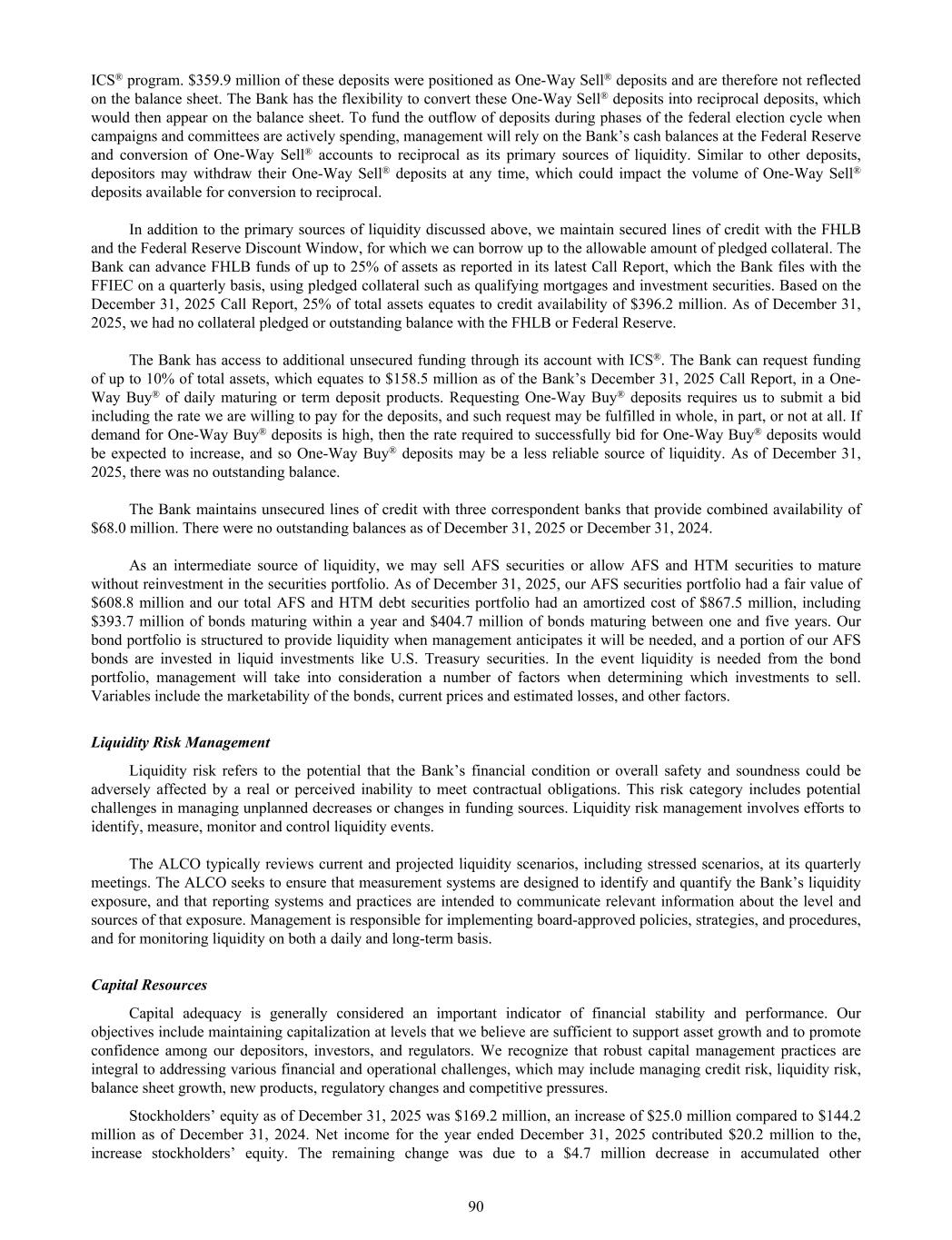 ICS® program. $359.9 million of these deposits were positioned as One-Way Sell® deposits and are therefore not reflected on the balance sheet. The Bank has the flexibility to convert these One-Way Sell® deposits into reciprocal deposits, which would then appear on the balance sheet. To fund the outflow of deposits during phases of the federal election cycle when campaigns and committees are actively spending, management will rely on the Bank’s cash balances at the Federal Reserve and conversion of One-Way Sell® accounts to reciprocal as its primary sources of liquidity. Similar to other deposits, depositors may withdraw their One-Way Sell® deposits at any time, which could impact the volume of One-Way Sell® deposits available for conversion to reciprocal. In addition to the primary sources of liquidity discussed above, we maintain secured lines of credit with the FHLB and the Federal Reserve Discount Window, for which we can borrow up to the allowable amount of pledged collateral. The Bank can advance FHLB funds of up to 25% of assets as reported in its latest Call Report, which the Bank files with the FFIEC on a quarterly basis, using pledged collateral such as qualifying mortgages and investment securities. Based on the December 31, 2025 Call Report, 25% of total assets equates to credit availability of $396.2 million. As of December 31, 2025, we had no collateral pledged or outstanding balance with the FHLB or Federal Reserve. The Bank has access to additional unsecured funding through its account with ICS®. The Bank can request funding of up to 10% of total assets, which equates to $158.5 million as of the Bank’s December 31, 2025 Call Report, in a One- Way Buy® of daily maturing or term deposit products. Requesting One-Way Buy® deposits requires us to submit a bid including the rate we are willing to pay for the deposits, and such request may be fulfilled in whole, in part, or not at all. If demand for One-Way Buy® deposits is high, then the rate required to successfully bid for One-Way Buy® deposits would be expected to increase, and so One-Way Buy® deposits may be a less reliable source of liquidity. As of December 31, 2025, there was no outstanding balance. The Bank maintains unsecured lines of credit with three correspondent banks that provide combined availability of $68.0 million. There were no outstanding balances as of December 31, 2025 or December 31, 2024. As an intermediate source of liquidity, we may sell AFS securities or allow AFS and HTM securities to mature without reinvestment in the securities portfolio. As of December 31, 2025, our AFS securities portfolio had a fair value of $608.8 million and our total AFS and HTM debt securities portfolio had an amortized cost of $867.5 million, including $393.7 million of bonds maturing within a year and $404.7 million of bonds maturing between one and five years. Our bond portfolio is structured to provide liquidity when management anticipates it will be needed, and a portion of our AFS bonds are invested in liquid investments like U.S. Treasury securities. In the event liquidity is needed from the bond portfolio, management will take into consideration a number of factors when determining which investments to sell. Variables include the marketability of the bonds, current prices and estimated losses, and other factors. Liquidity Risk Management Liquidity risk refers to the potential that the Bank’s financial condition or overall safety and soundness could be adversely affected by a real or perceived inability to meet contractual obligations. This risk category includes potential challenges in managing unplanned decreases or changes in funding sources. Liquidity risk management involves efforts to identify, measure, monitor and control liquidity events. The ALCO typically reviews current and projected liquidity scenarios, including stressed scenarios, at its quarterly meetings. The ALCO seeks to ensure that measurement systems are designed to identify and quantify the Bank’s liquidity exposure, and that reporting systems and practices are intended to communicate relevant information about the level and sources of that exposure. Management is responsible for implementing board-approved policies, strategies, and procedures, and for monitoring liquidity on both a daily and long-term basis. Capital Resources Capital adequacy is generally considered an important indicator of financial stability and performance. Our objectives include maintaining capitalization at levels that we believe are sufficient to support asset growth and to promote confidence among our depositors, investors, and regulators. We recognize that robust capital management practices are integral to addressing various financial and operational challenges, which may include managing credit risk, liquidity risk, balance sheet growth, new products, regulatory changes and competitive pressures. Stockholders’ equity as of December 31, 2025 was $169.2 million, an increase of $25.0 million compared to $144.2 million as of December 31, 2024. Net income for the year ended December 31, 2025 contributed $20.2 million to the, increase stockholders’ equity. The remaining change was due to a $4.7 million decrease in accumulated other 90