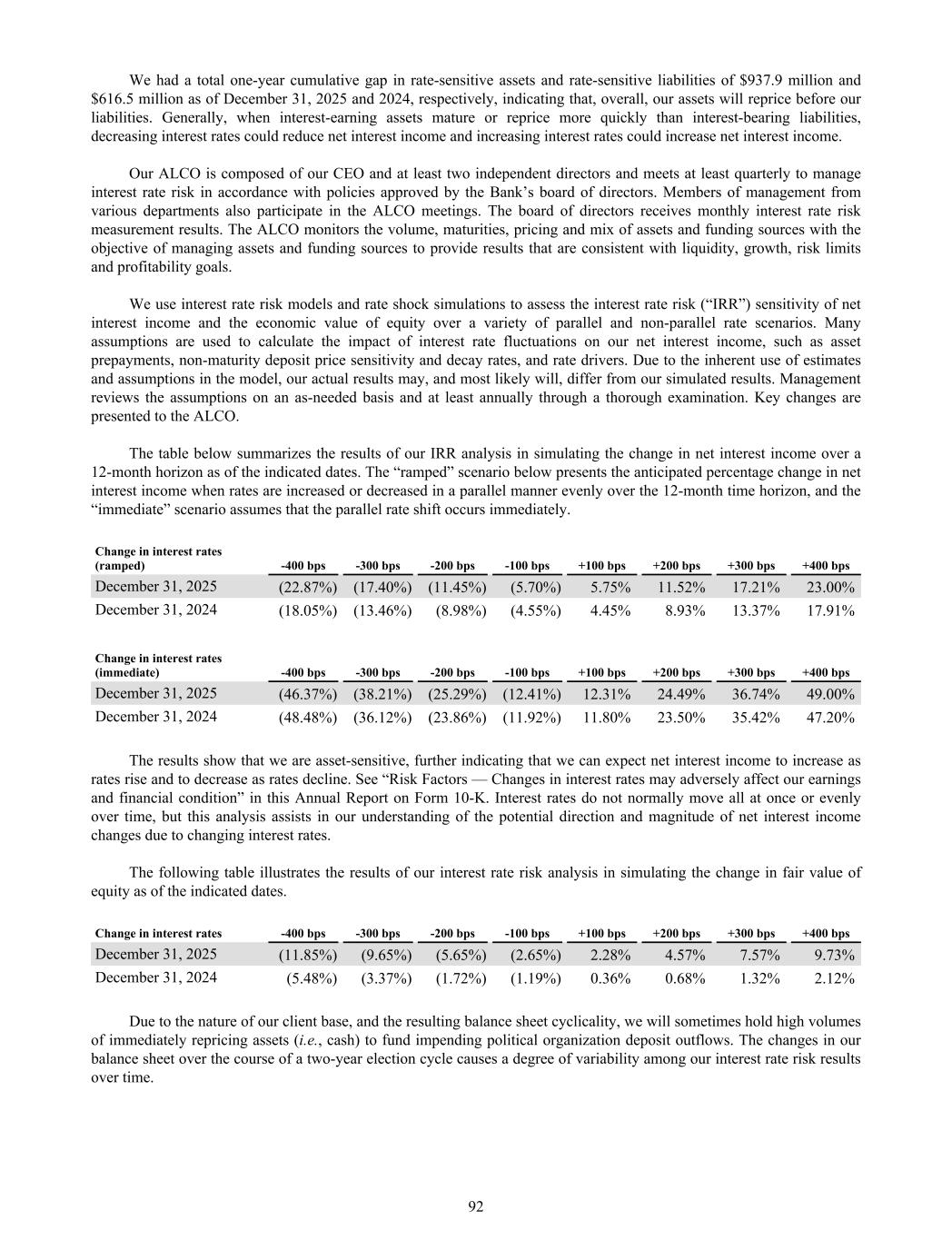 We had a total one-year cumulative gap in rate-sensitive assets and rate-sensitive liabilities of $937.9 million and $616.5 million as of December 31, 2025 and 2024, respectively, indicating that, overall, our assets will reprice before our liabilities. Generally, when interest-earning assets mature or reprice more quickly than interest-bearing liabilities, decreasing interest rates could reduce net interest income and increasing interest rates could increase net interest income. Our ALCO is composed of our CEO and at least two independent directors and meets at least quarterly to manage interest rate risk in accordance with policies approved by the Bank’s board of directors. Members of management from various departments also participate in the ALCO meetings. The board of directors receives monthly interest rate risk measurement results. The ALCO monitors the volume, maturities, pricing and mix of assets and funding sources with the objective of managing assets and funding sources to provide results that are consistent with liquidity, growth, risk limits and profitability goals. We use interest rate risk models and rate shock simulations to assess the interest rate risk (“IRR”) sensitivity of net interest income and the economic value of equity over a variety of parallel and non-parallel rate scenarios. Many assumptions are used to calculate the impact of interest rate fluctuations on our net interest income, such as asset prepayments, non-maturity deposit price sensitivity and decay rates, and rate drivers. Due to the inherent use of estimates and assumptions in the model, our actual results may, and most likely will, differ from our simulated results. Management reviews the assumptions on an as-needed basis and at least annually through a thorough examination. Key changes are presented to the ALCO. The table below summarizes the results of our IRR analysis in simulating the change in net interest income over a 12-month horizon as of the indicated dates. The “ramped” scenario below presents the anticipated percentage change in net interest income when rates are increased or decreased in a parallel manner evenly over the 12-month time horizon, and the “immediate” scenario assumes that the parallel rate shift occurs immediately. Change in interest rates (ramped) -400 bps -300 bps -200 bps -100 bps +100 bps +200 bps +300 bps +400 bps December 31, 2025 (22.87%) (17.40%) (11.45%) (5.70%) 5.75% 11.52% 17.21% 23.00% December 31, 2024 (18.05%) (13.46%) (8.98%) (4.55%) 4.45% 8.93% 13.37% 17.91% Change in interest rates (immediate) -400 bps -300 bps -200 bps -100 bps +100 bps +200 bps +300 bps +400 bps December 31, 2025 (46.37%) (38.21%) (25.29%) (12.41%) 12.31% 24.49% 36.74% 49.00% December 31, 2024 (48.48%) (36.12%) (23.86%) (11.92%) 11.80% 23.50% 35.42% 47.20% The results show that we are asset-sensitive, further indicating that we can expect net interest income to increase as rates rise and to decrease as rates decline. See “Risk Factors — Changes in interest rates may adversely affect our earnings and financial condition” in this Annual Report on Form 10-K. Interest rates do not normally move all at once or evenly over time, but this analysis assists in our understanding of the potential direction and magnitude of net interest income changes due to changing interest rates. The following table illustrates the results of our interest rate risk analysis in simulating the change in fair value of equity as of the indicated dates. Change in interest rates -400 bps -300 bps -200 bps -100 bps +100 bps +200 bps +300 bps +400 bps December 31, 2025 (11.85%) (9.65%) (5.65%) (2.65%) 2.28% 4.57% 7.57% 9.73% December 31, 2024 (5.48%) (3.37%) (1.72%) (1.19%) 0.36% 0.68% 1.32% 2.12% Due to the nature of our client base, and the resulting balance sheet cyclicality, we will sometimes hold high volumes of immediately repricing assets (i.e., cash) to fund impending political organization deposit outflows. The changes in our balance sheet over the course of a two-year election cycle causes a degree of variability among our interest rate risk results over time. 92